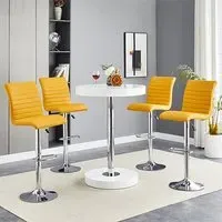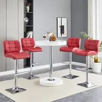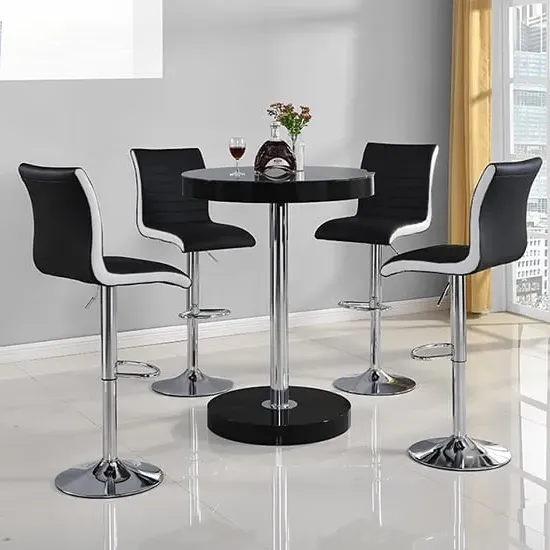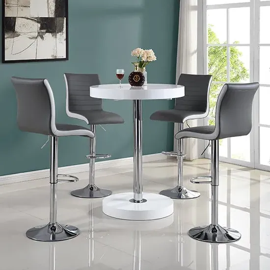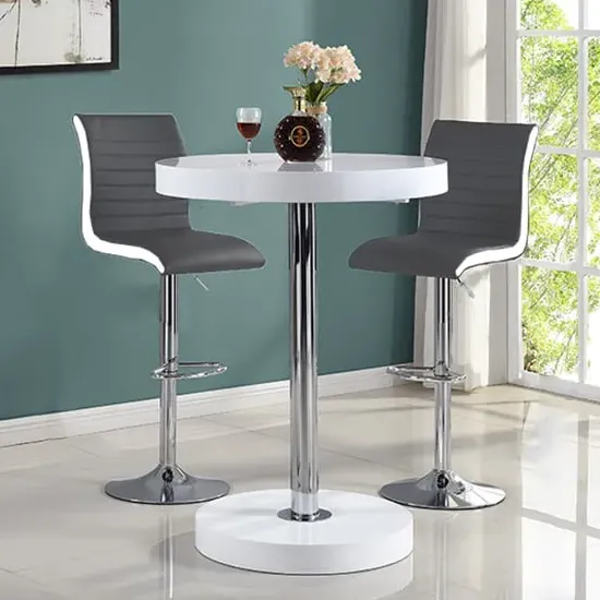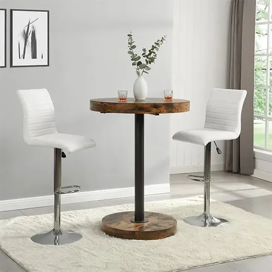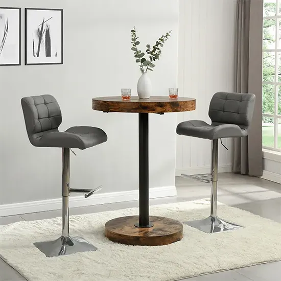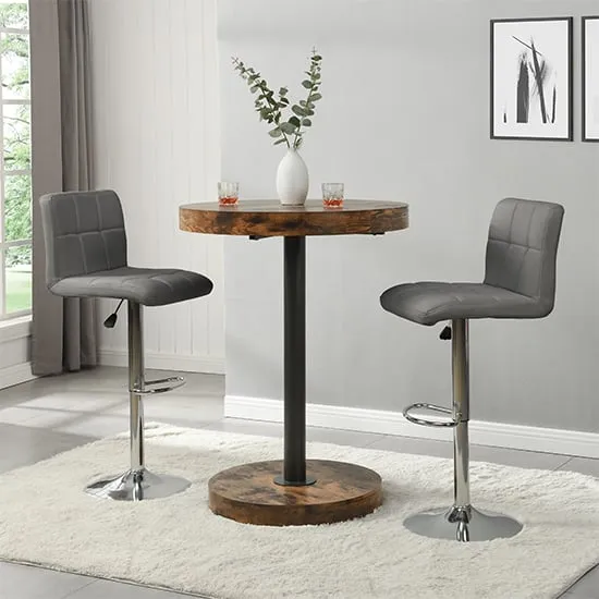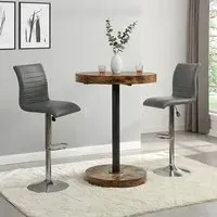 Havana Rustic Oak Wooden Bar Table with 2 Oston Grey Stools, a sleek and stylish addition to your home from Furniture in Fashion. This elegant bar table features a sophisticated Rustic Oak wooden top, adding warmth and character to any space. Paired with two Oston Grey Stools, upholstered in chic grey faux leather and complemented by sleek anthracite legs, this set offers both comfort and style for your dining or entertaining area. Whether placed in a kitchen, dining room, or home bar, the Havana Bar Table with 2 Oston Grey Stools creates a cozy and inviting atmosphere for you and your guests. Elevate your home decor and entertain in style with the Havana Rustic Oak Wooden Bar Table with 2 Oston Grey Stools from Furniture in Fashion. FEATURES : Table Material : MDF (Medium Density Fibreboard), Powder Coated Metal Table Finish : Rustic Oak, Black Chair Material : PU, Foam, Metal Chair Finish : Grey, Anthracite Havana Wooden Bar Table Round In Rustic Oak 10cm MDF wooden top in round shape 75mm black powder coated metal support Rustic Oak wooden base Contemporary bar chair featuring grey faux leather upholstery for a sleek appearance Anthracite legs provide stability and a modern contrast to the grey upholstery Sleek and streamlined design perfect for modern kitchens or bars Faux leather material is durable, easy to clean, and maintain Tall backrest and padded seat offer comfort during extended sitting periods Versatile piece that complements various decor styles Ideal for adding stylish seating to kitchen islands, breakfast bars, or home bars Available at Affordable Price Images shown are for illustration purpose only BAR TABLE (19220SO) : Height : 108cm Diameter : 80cm BAR CHAIR (OSTONGR-BS) : Height : 102cm Width : 54cm Depth : 50cm