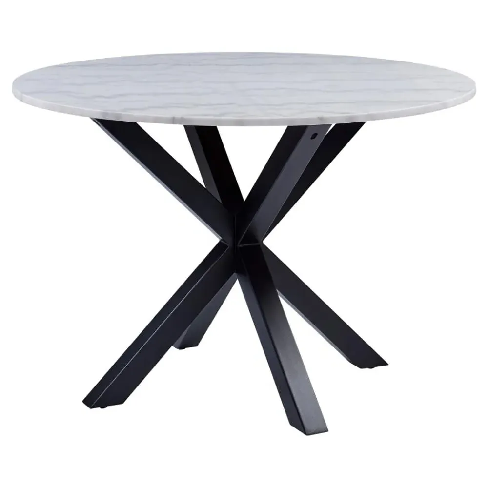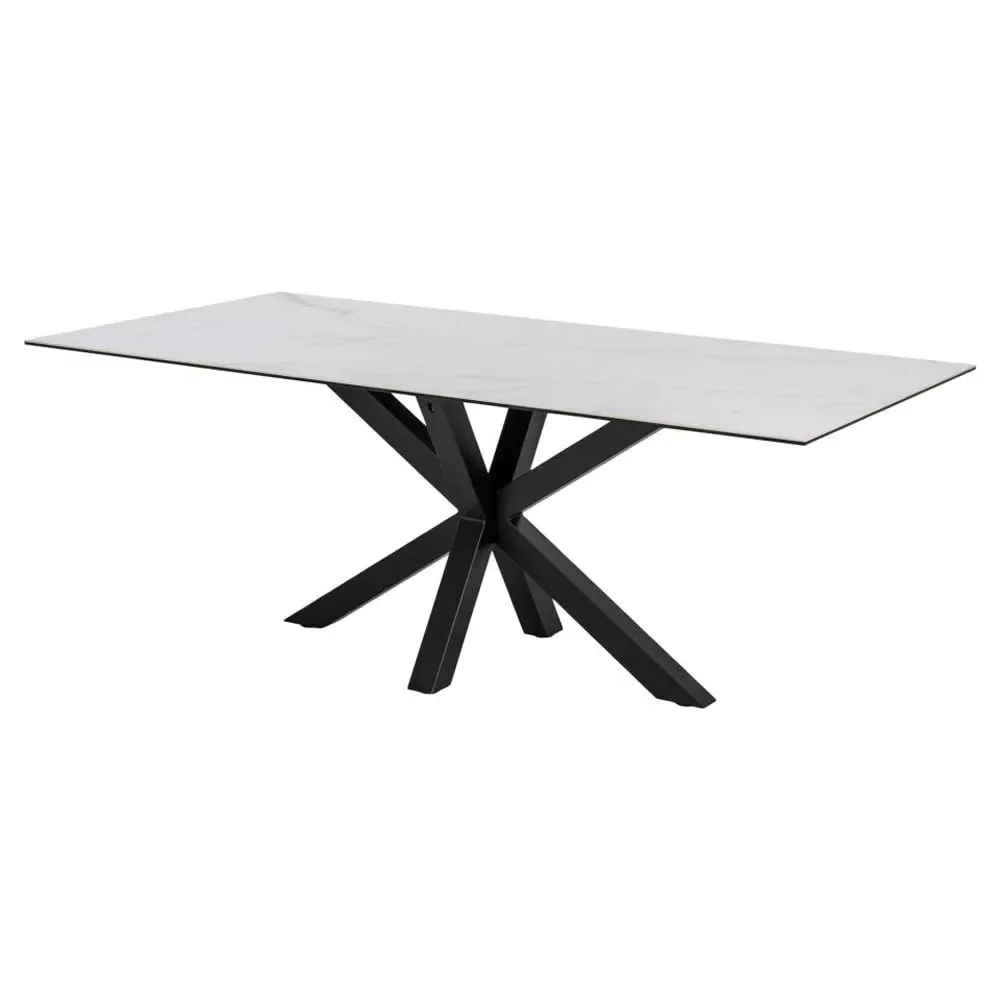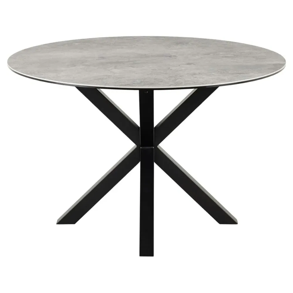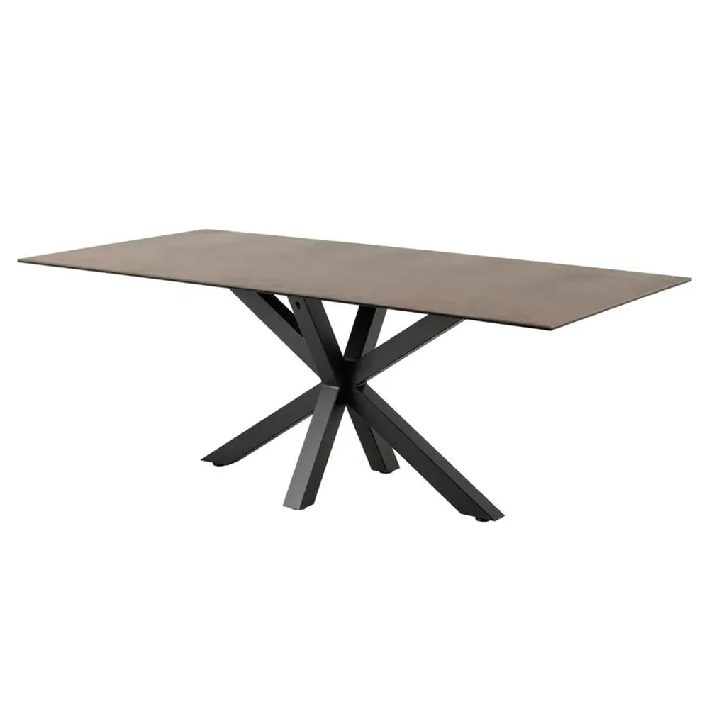 The Hyeres small dining table features a ceramic top finished in Black Fairbanks, delivering natural stone aesthetics with exceptional durability. Its black metal cross base provides stable support while adding industrial flair to the design. The heat, scratch and stain-resistant surface withstands daily use and cleans effortlessly. Perfectly sized for intimate settings, this table comfortably seats 2 to 4 people.