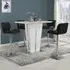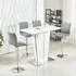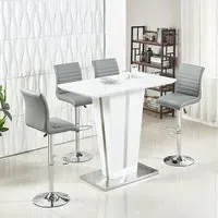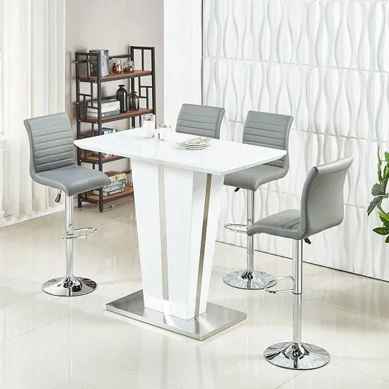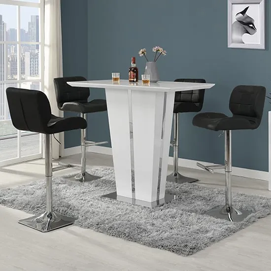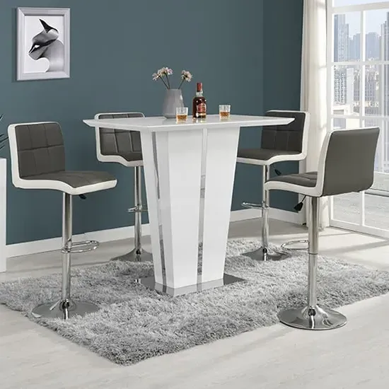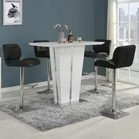 The Memphis Glass Bar Table features a tempered glass top with high gloss white MDF body and chrome base construction. Its toughened glass surface provides safety and easy maintenance, while the stable chrome support ensures durability. The 4 Ritz bar stools combine white and black faux leather upholstery with ribbed backrests and sturdy chrome bases. Each stool includes height-adjustable gas-lift mechanism, 360-degree swivel function, and half-moon footrest for comfort. W120 x D70 x H110 cm (table), W41 x D52 x H96-116 cm (stools).