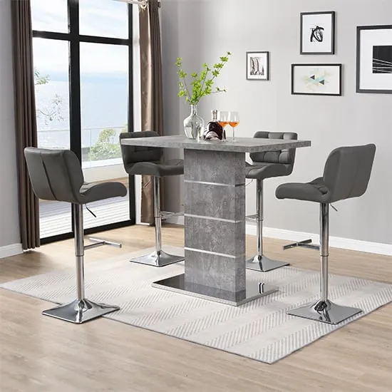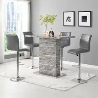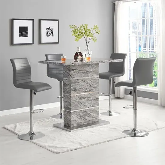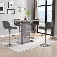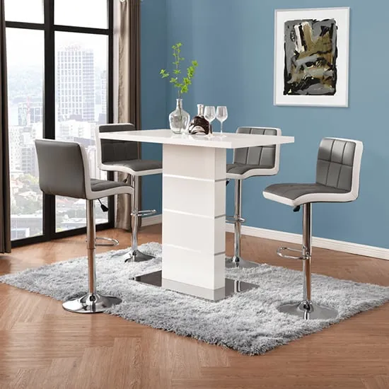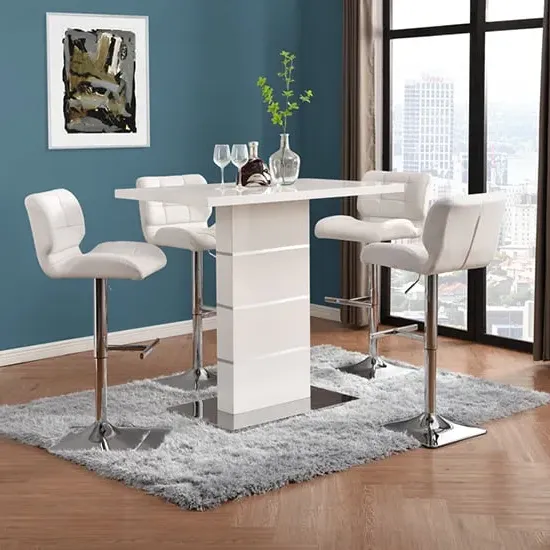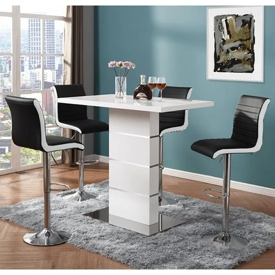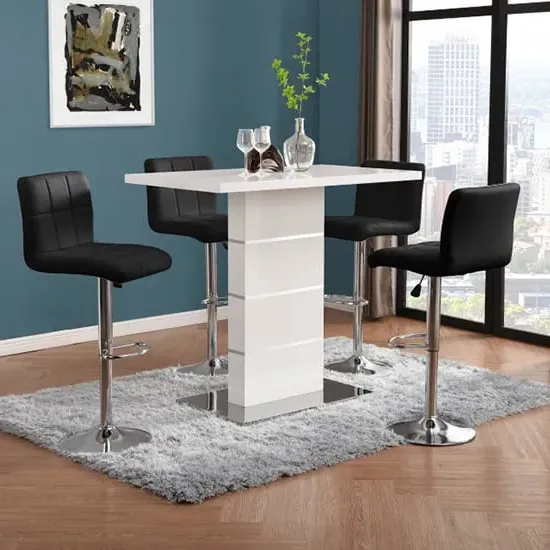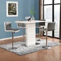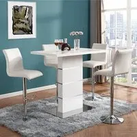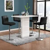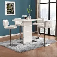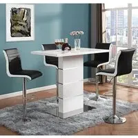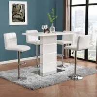 The Parini White Gloss Bar Table with 4 Ritz White/Black Stools is a stylish and modern set that will elevate the look of your home bar or kitchen area. The high-gloss white finish of the table creates a sleek and contemporary look that will complement any modern decor. The chrome accents add a touch of sophistication to the design, making it an ideal choice for entertaining guests or enjoying a quiet meal at home. The set includes four Ritz White/Black Stools that are ergonomically designed for maximum comfort and support. The stools have a modern design that perfectly complements the table, and their white and black finish adds a touch of elegance to your dining space. The stools are also height-adjustable, which means you can easily adjust them to your desired height for optimal comfort. Made from high-quality materials, the table and stools are durable and easy to clean, making them perfect for everyday use. The compact size of the table and stools makes them a great addition to small apartments or homes with limited space. The Parini White Gloss Bar Table with 4 Ritz White/Black Stools is the perfect combination of style and function, making it a great addition to any home bar or kitchen area. FEATURES : Table Material : MDF, Stainless Steel Table Finish : White High Gloss Stool Material : Faux Leather, Stainless Steel Stool Finish : White And Black, Chrome Parini Bar Table Square In White High Gloss With Stainless Steel Base Solid Shiny Stainless Steel Double Support provide Strength to the Bar Table Thick White High Gloss Finish Fabulous Stainless Steel Legs Design Contemporary furniture Ideal for your Dining, Living and Bar It has Ribbed Back Rest and Seat It Provides Comfortable Sitting Height Adjustable as it has Gas-Lift System 360 degree Swivel Mechanism Round Chrome Stainless Steel Base Available at an affordable price Images shown are for illustration purpose only BAR TABLE DIMENSIONS : Height : 110cm Width : 120cm