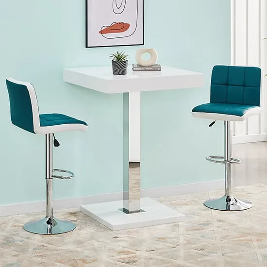 The Topaz Bar Table features a white glass top with grey high gloss base, supported by polished stainless steel framework for exceptional stability. Its thick square glass surface combines with MDF construction and double stainless steel support system, while the grey high gloss finish adds visual depth. The sleek stainless steel legs provide both strength and aesthetic appeal, creating a sophisticated dining centerpiece. W80 x D80 x H110 cm.
