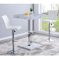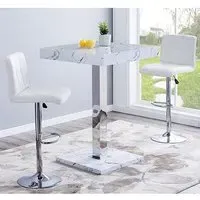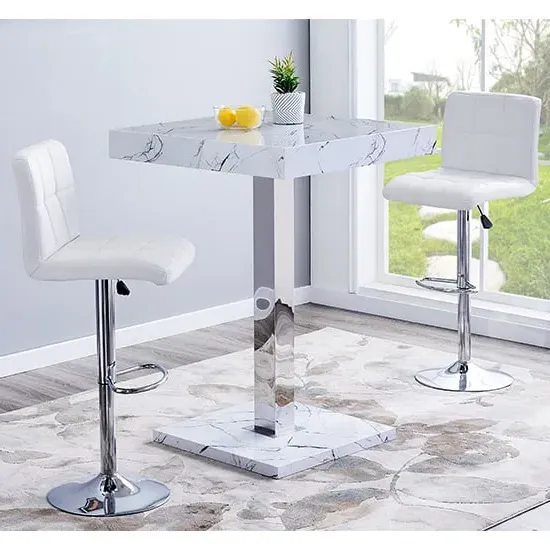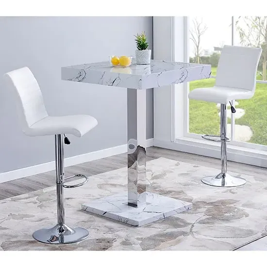 The Topaz Vida Bar Table offers marble effect high gloss finish with contemporary square design for versatile dining spaces. Its MDF construction features double stainless steel support legs with chrome finish, providing exceptional stability and strength. The thick Vida effect finish creates luxury appeal, while the solid chrome legs add architectural interest to any space. W80 x D80 x H110 cm.
