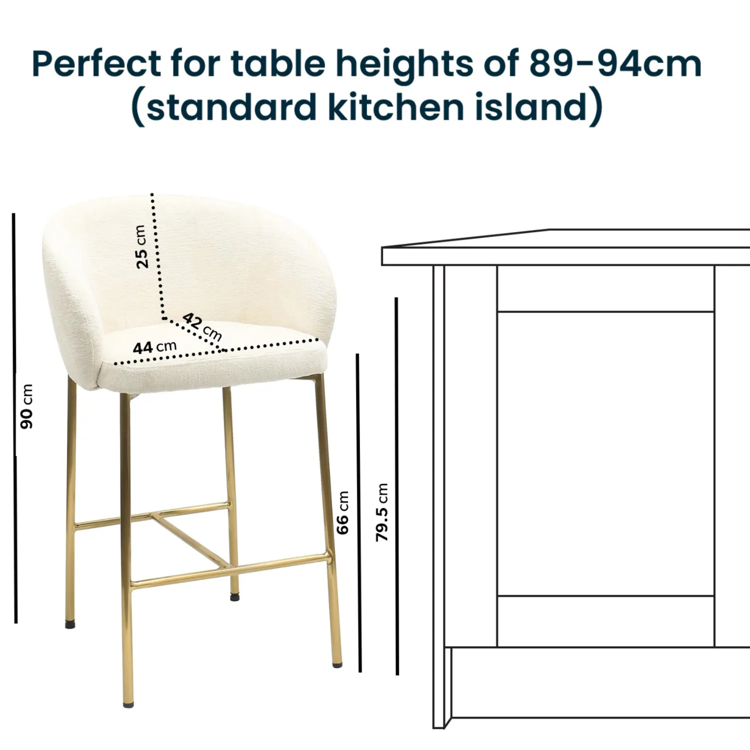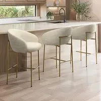 All about meThis Cora kitchen stool is a perfect addition to any kitchen space. The mink textured fabric matches any interior and the brass legs and unique frame contrast beautifully. Design features exposed back detailing adding a touch of modern neutral elegance to your kitchen area. On trend low curved back shaping for ultimate comfort. Suitable for kitchen islands with heights of 89-94cm please measure before purchasing. Need to know . Number of Stool . 1 Dimensions . W56 x D52.5 x H90 cm Weight . 7.1 kg Max supported weight . 130 kg Colour . Mink and brass Material . Fabric and metal legs Assembly required . Yes Packaging dimensions . W79 x D38 x H56.5 cm For domestic use only. Domestically UKFR certified . .