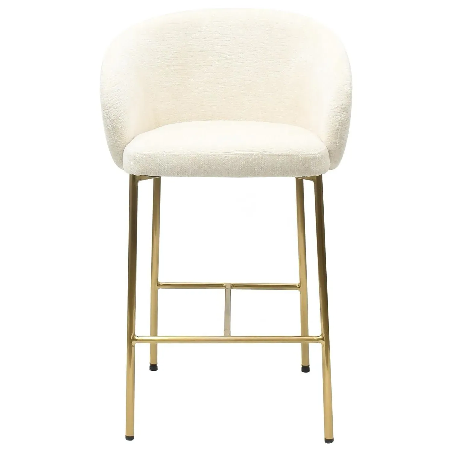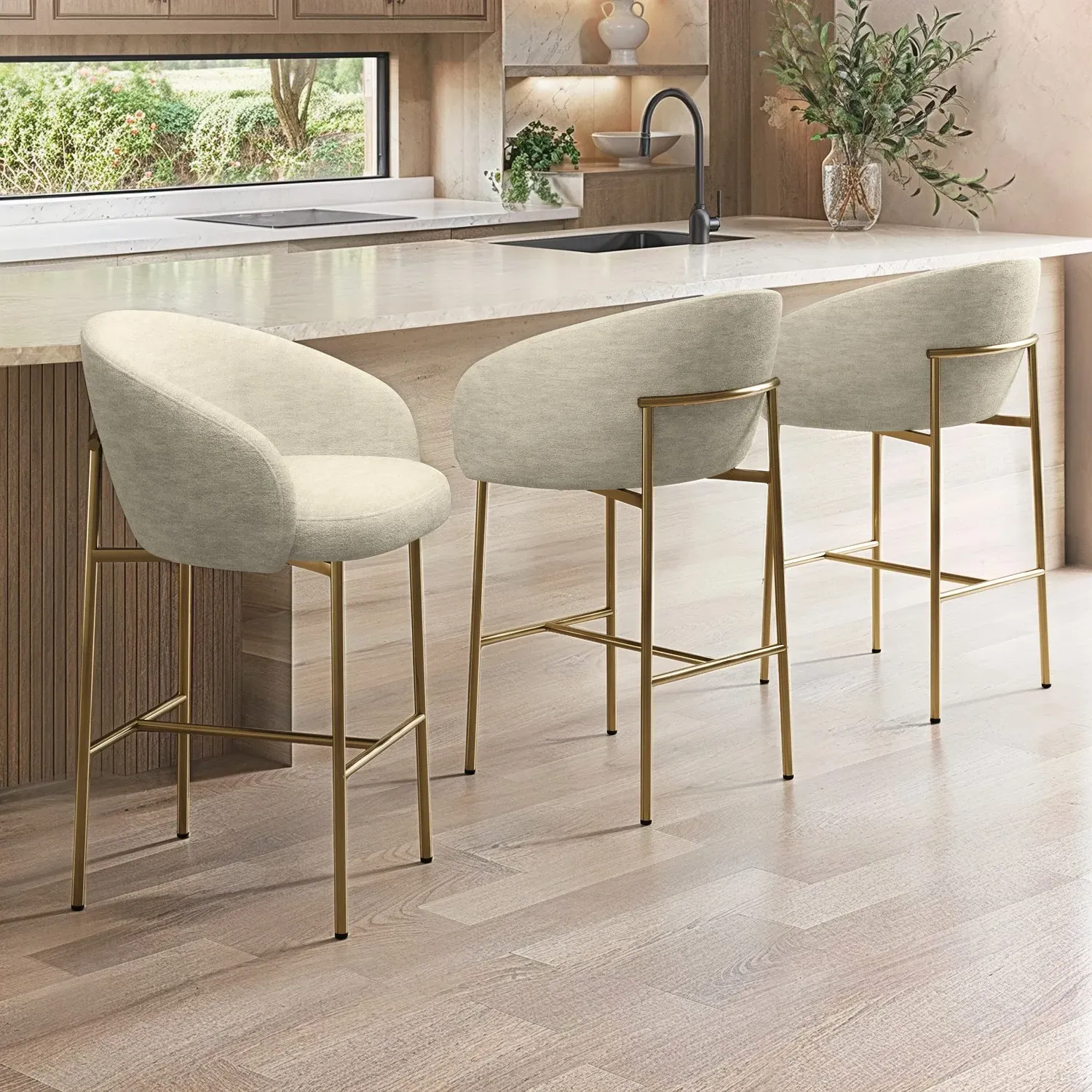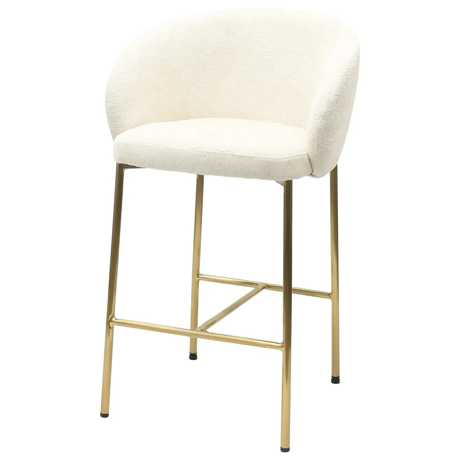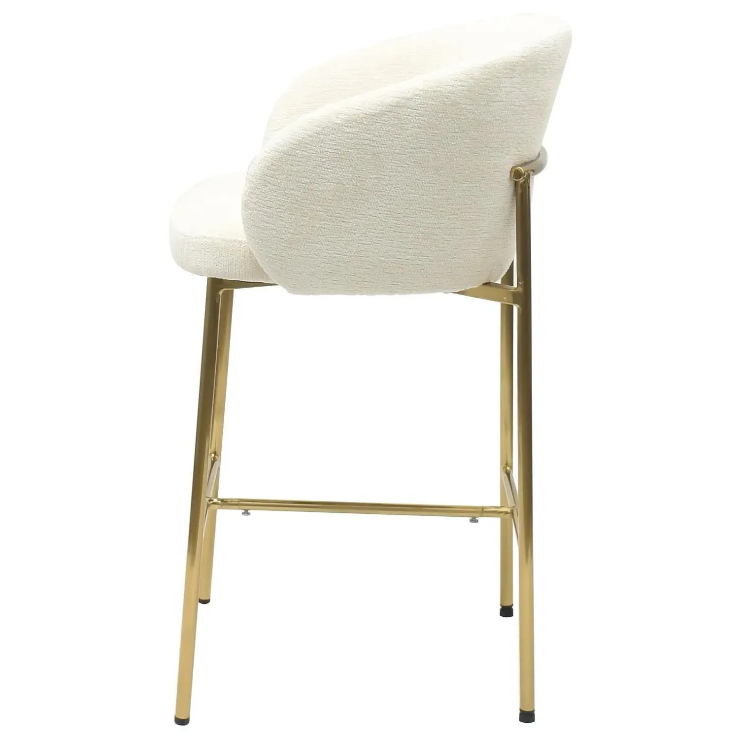 The kitchen stool offers mink textured fabric upholstery paired with brass metal legs for neutral elegance. Its exposed back detailing creates modern appeal, while the curved back shape ensures comfortable seating. The open-frame construction provides visual lightness, and the integrated footrest adds practical comfort. W56 x D52.5 x H90 cm.