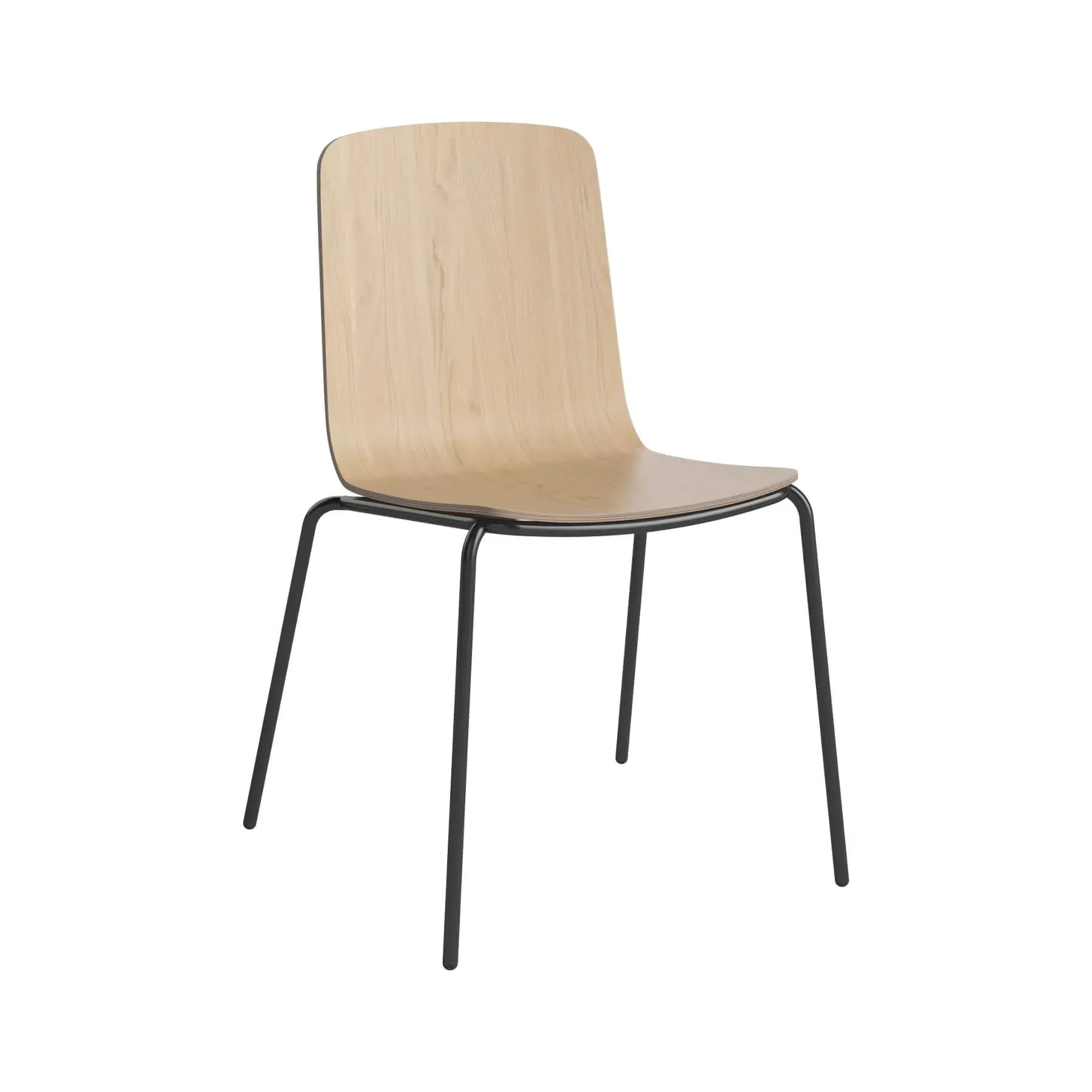 The Palm Dining Chair combines clean lines with slanted metal legs for a refined seating solution. Its oiled oak veneer seat provides durability and natural wood grain appeal, while the chrome plated steel frame ensures stability and adds a polished finish. The chair features meticulous craftsmanship with attention to detail in both construction and materials. Produced by Kvist, the design reflects over five decades of furniture-making expertise.