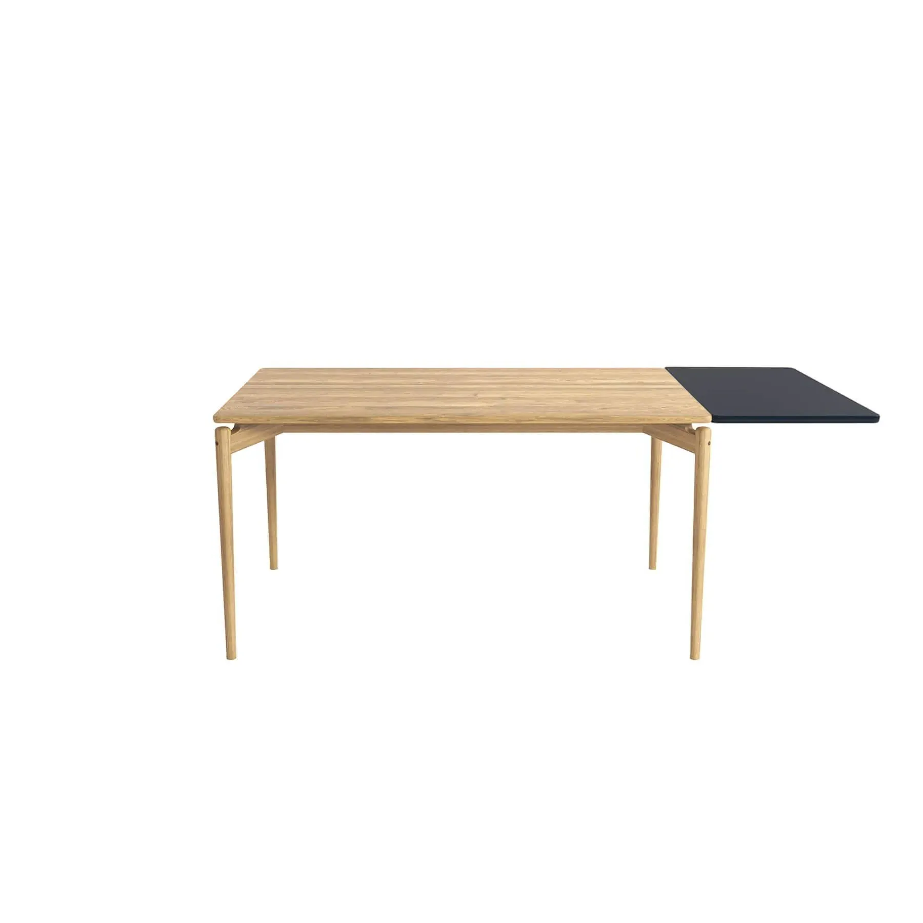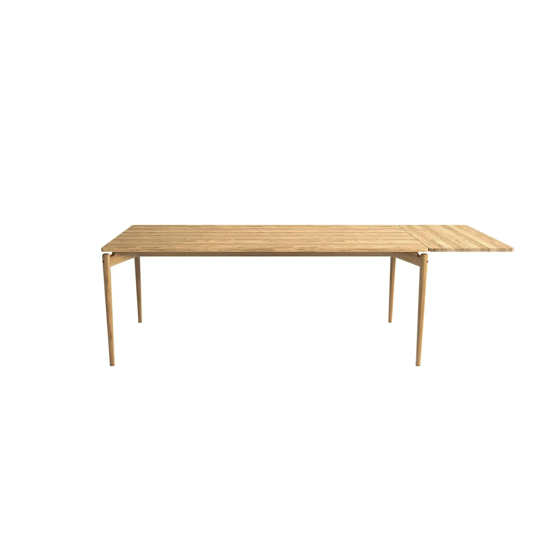 The dining table offers handcrafted Danish construction with its white oil oak finish. Its 85cm width provides comfortable seating, while the frame positioned 18cm from the edge accommodates chairs with armrests. The extendable design accepts expansion plates on both ends, and each 50cm plate adds space for additional guests.
