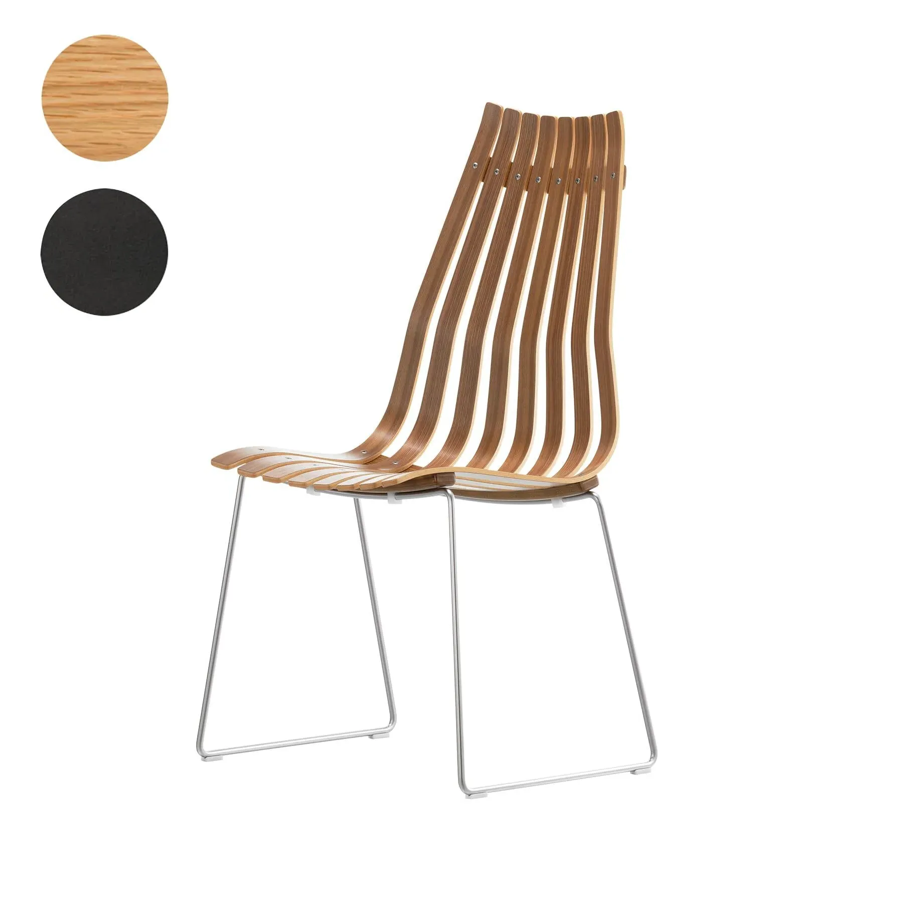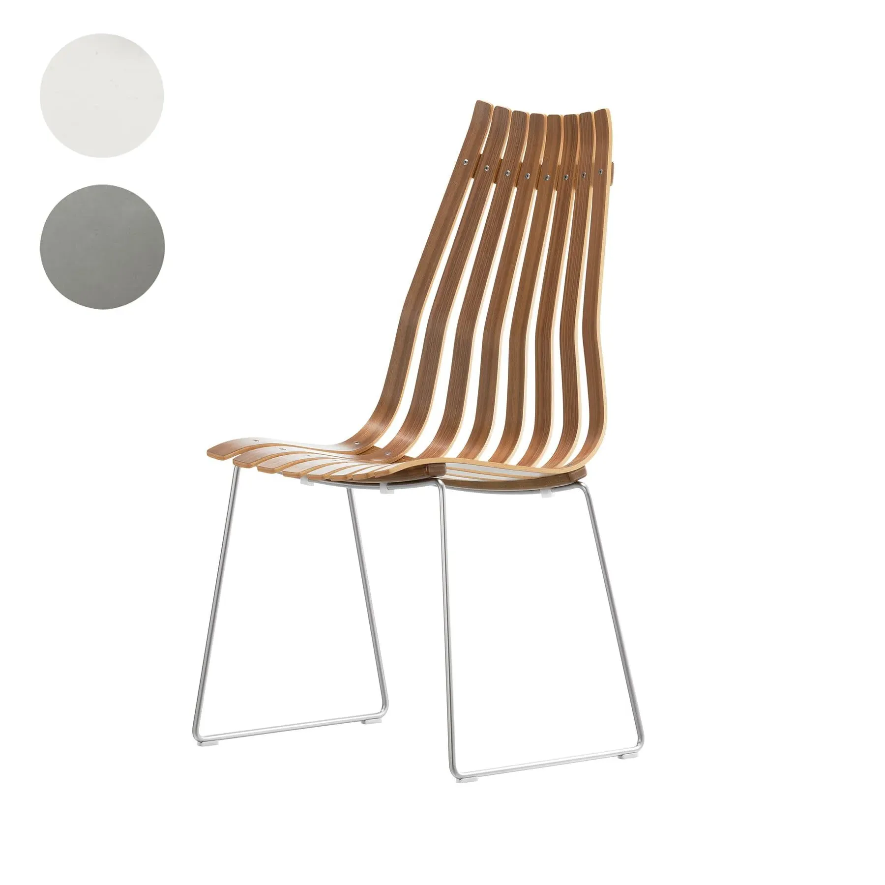 Step into the timeless allure of the Scandia Prince dining chair, a stackable masterpiece by Hans Brattrud crafted from laminated lacquered oak or walnut, with fully coloured veneer or light edges, and a sleek satin chrome or black bolt base. Designed in 1959, the Scandia Prince showcases Brattrud''s ingenious use of horizontal ribs, creating a three-dimensional form that''s both unique and enduring. The high back adds sophistication to this stackable chair, making it a versatile and stylish addition to any space. Optional accessories, such as seat cushions and plastic gliders, enhance both comfort and practicality, ensuring the Scandia Prince remains an iconic blend of design and functionality.