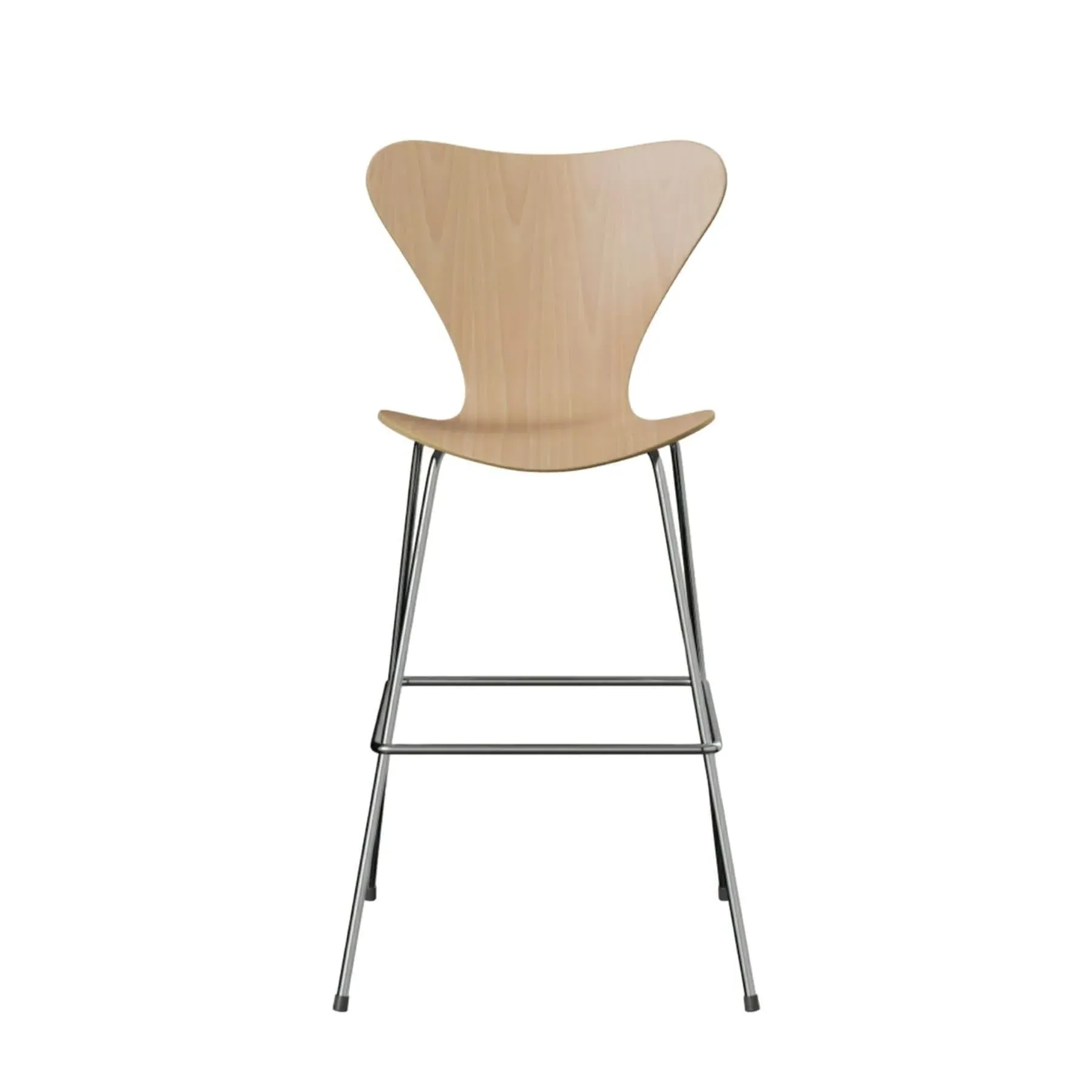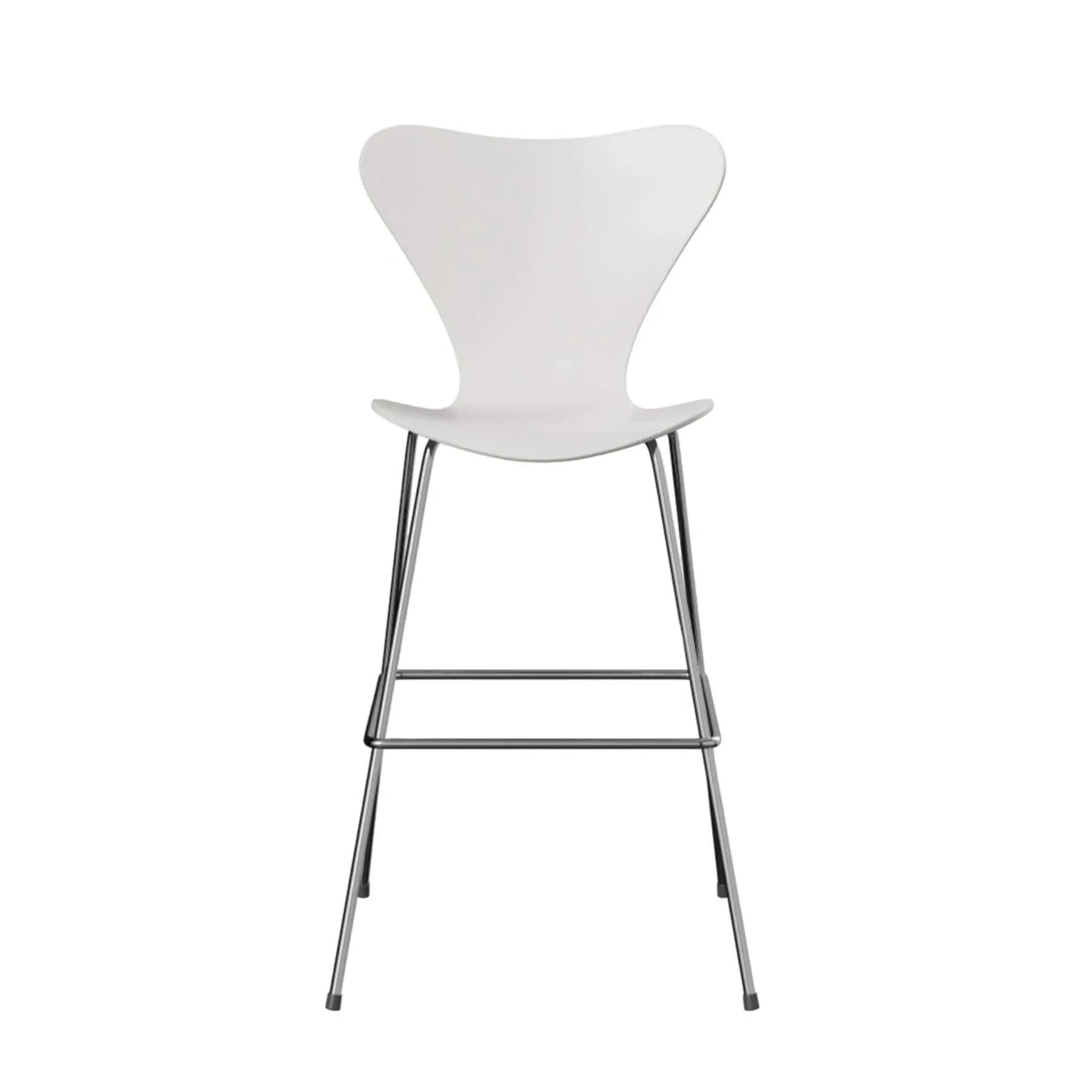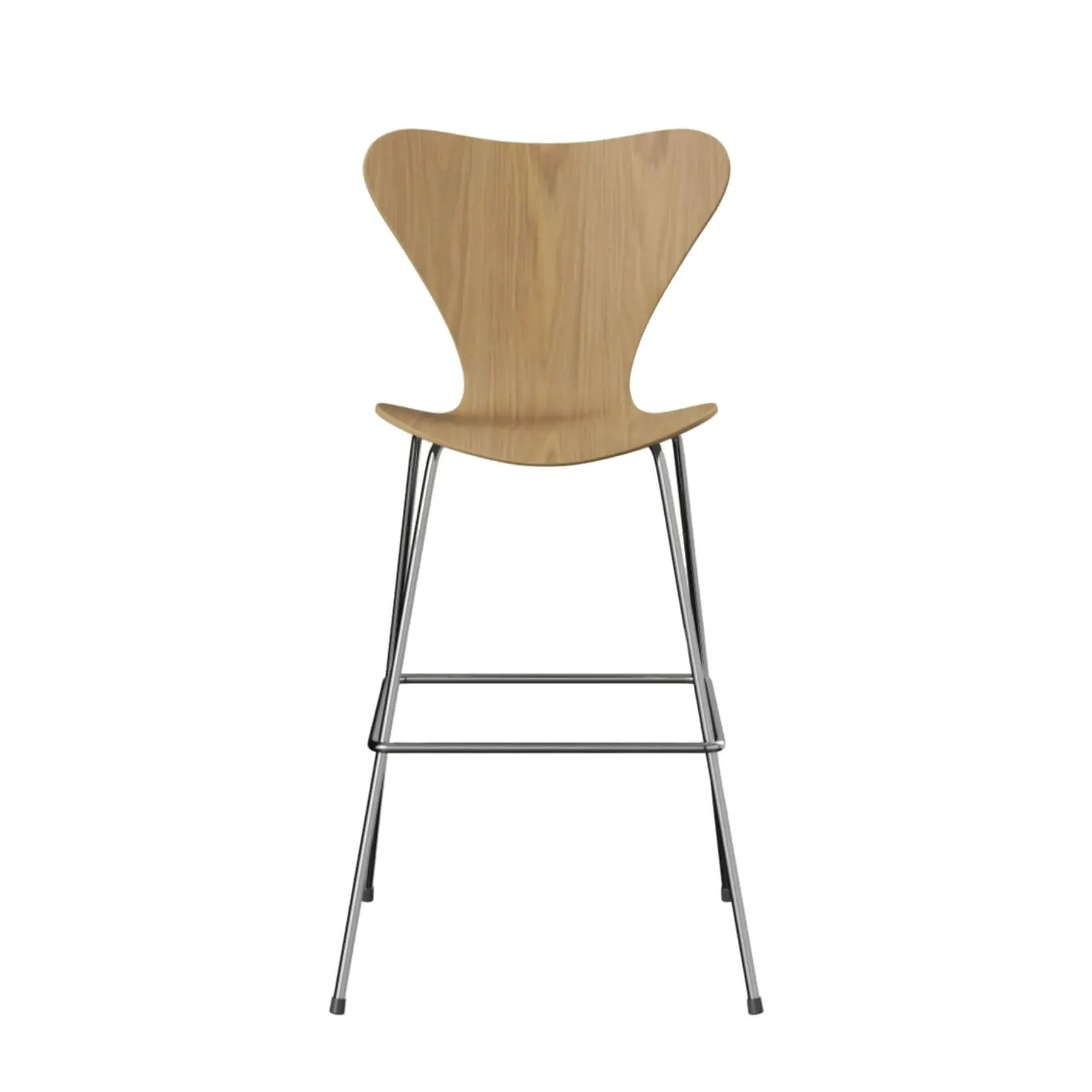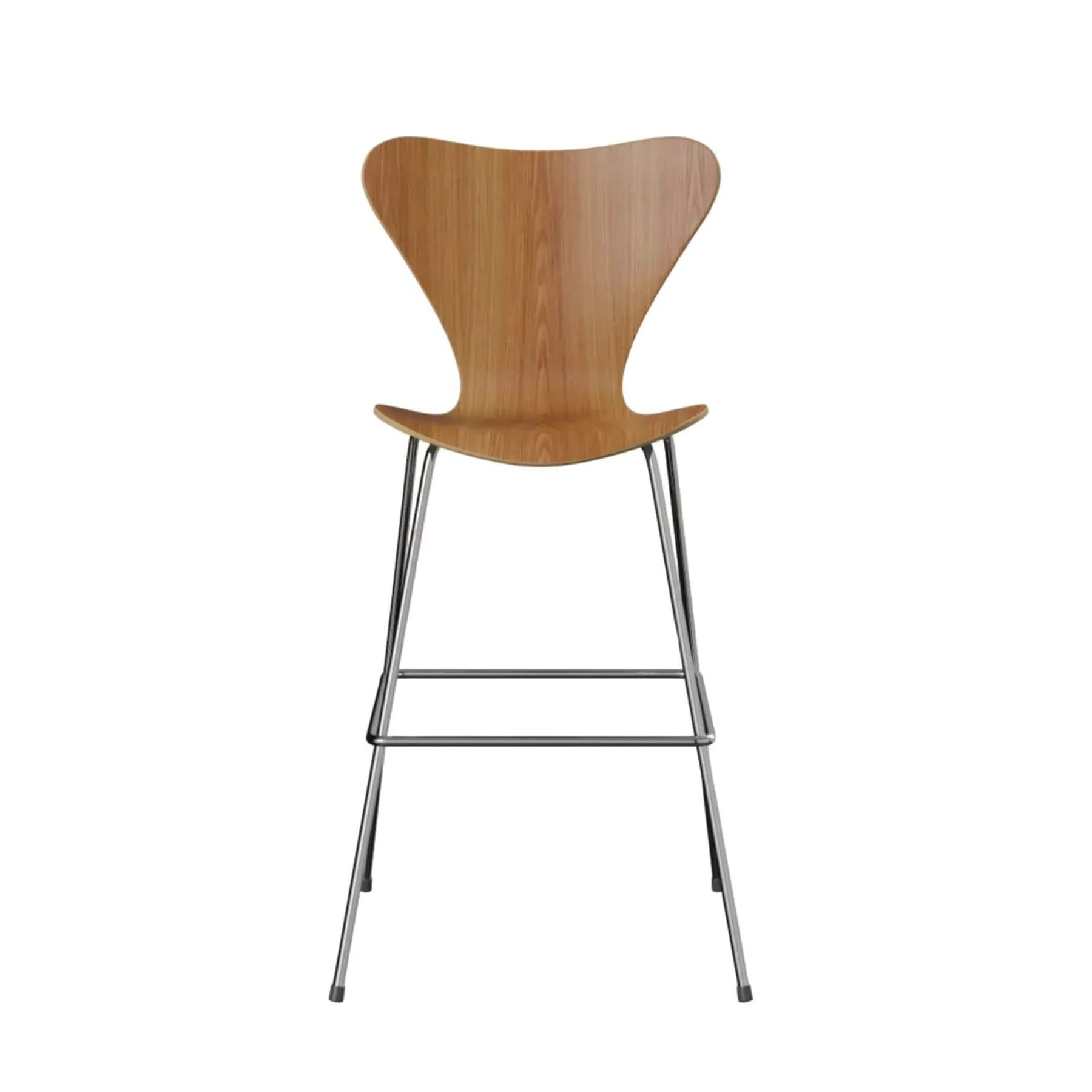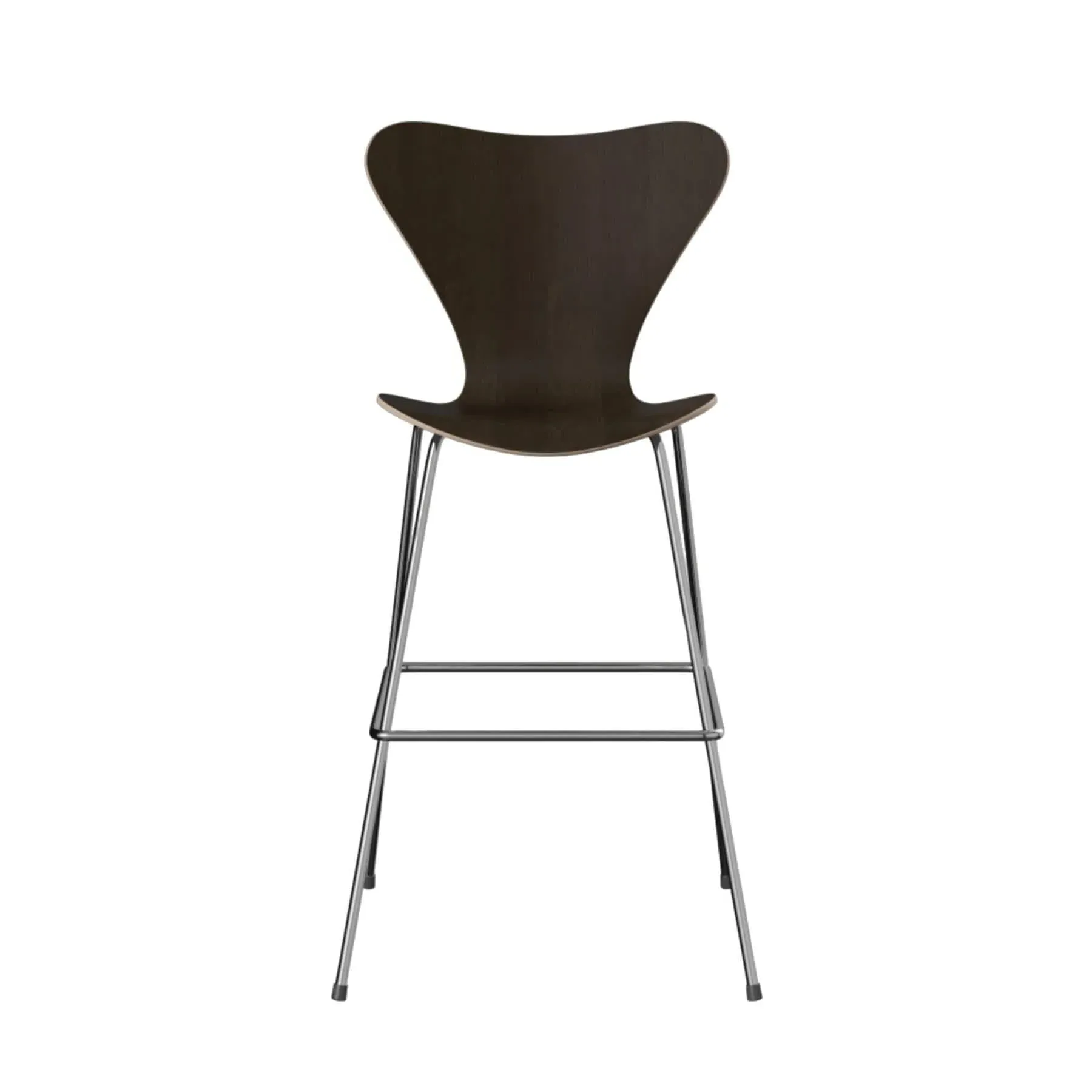 Explore the epitome of elegance and functionality with the Series 7 Bar Stool by Fritz Hansen. Pay homage to the iconic Series 7™ chair, as this barstool redefines contemporary design with its timeless allure. Crafted by visionary Arne Jacobsen in 1955, the chair''s unique shape seamlessly blends character and subtlety, making it a versatile addition to any space. Immerse yourself in the allure of a design that has withstood the test of time, bringing a touch of sophistication to your surroundings. Meticulously crafted from 9 layers of pressure-moulded veneer, the Series 7 Bar Stool embodies strength, flexibility, and durability while maintaining a slender and chic form. This exceptional construction not only pays homage to its mid-century roots but also ensures a product that stands the test of time. The four-sided footrest in tubular steel, ingeniously fixed to the extended legs, preserves the visual harmony of the chair''s clean and simple construction, elevating the overall aesthetic appeal. Unveiled in 2005 to commemorate the 50th anniversary of the Series 7 design, this barstool seamlessly combines heritage and modernity. Step into a world of sophistication and refinement with the Series 7 Bar Stool – a masterpiece within Fritz Hansen''s chair collection. Beyond being a mere piece of furniture, it represents a design legacy that continues to captivate discerning enthusiasts. Imbue your space with the enduring charm of this barstool, where classic design meets contemporary living, creating an ambiance that resonates with style and timelessness. Elevate your surroundings with a touch of iconic elegance embodied in every curve and detail of the Series 7 Bar Stool by Fritz Hansen.