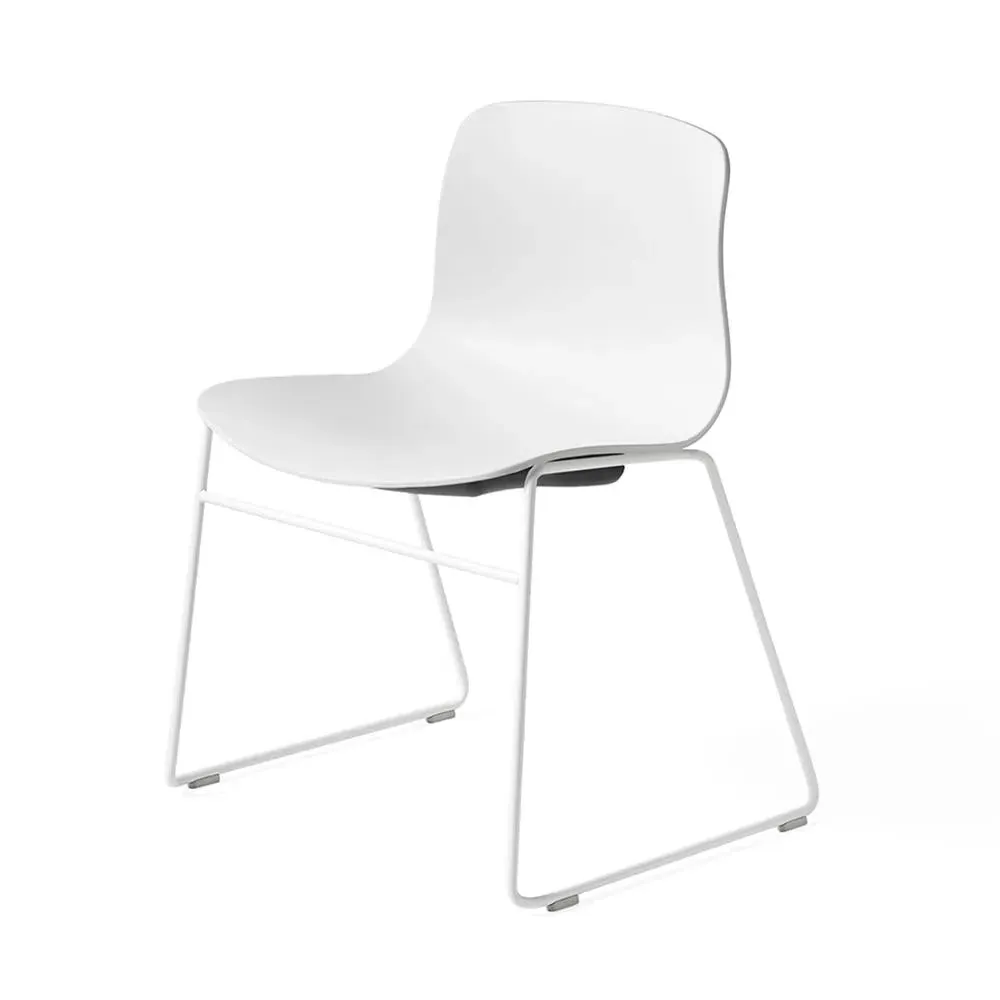 The dining chair provides contemporary seating with its upright yet rounded shell, constructed from 100% recycled post-consumer plastic for sustainable design. Its injection-moulded polypropylene shell features 10mm thickness for enhanced durability, while the lightweight structure allows for practical stackability. The open sled-like frame offers stability with white powder-coated steel finish and standard gliders. The chair combines optimal comfort and support with environmentally conscious materials.