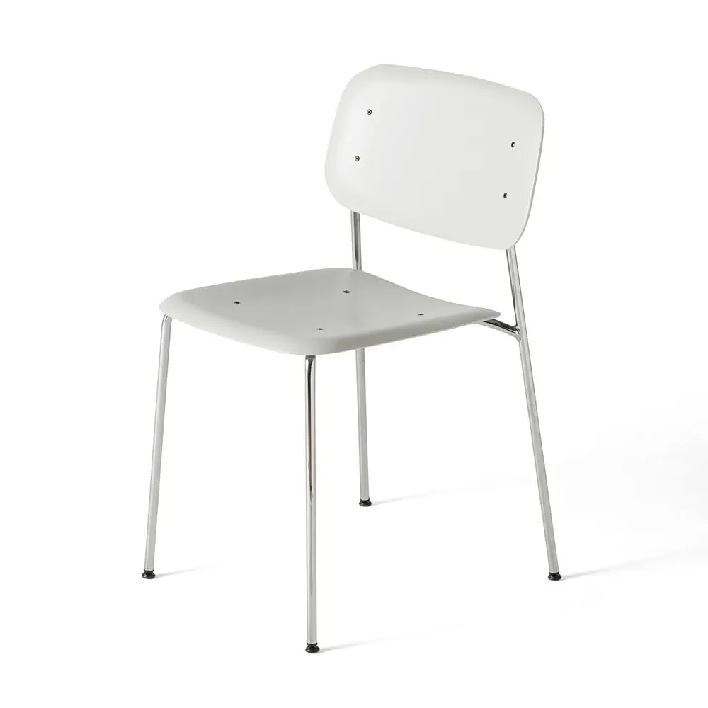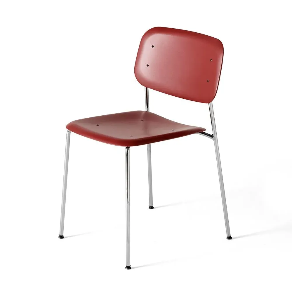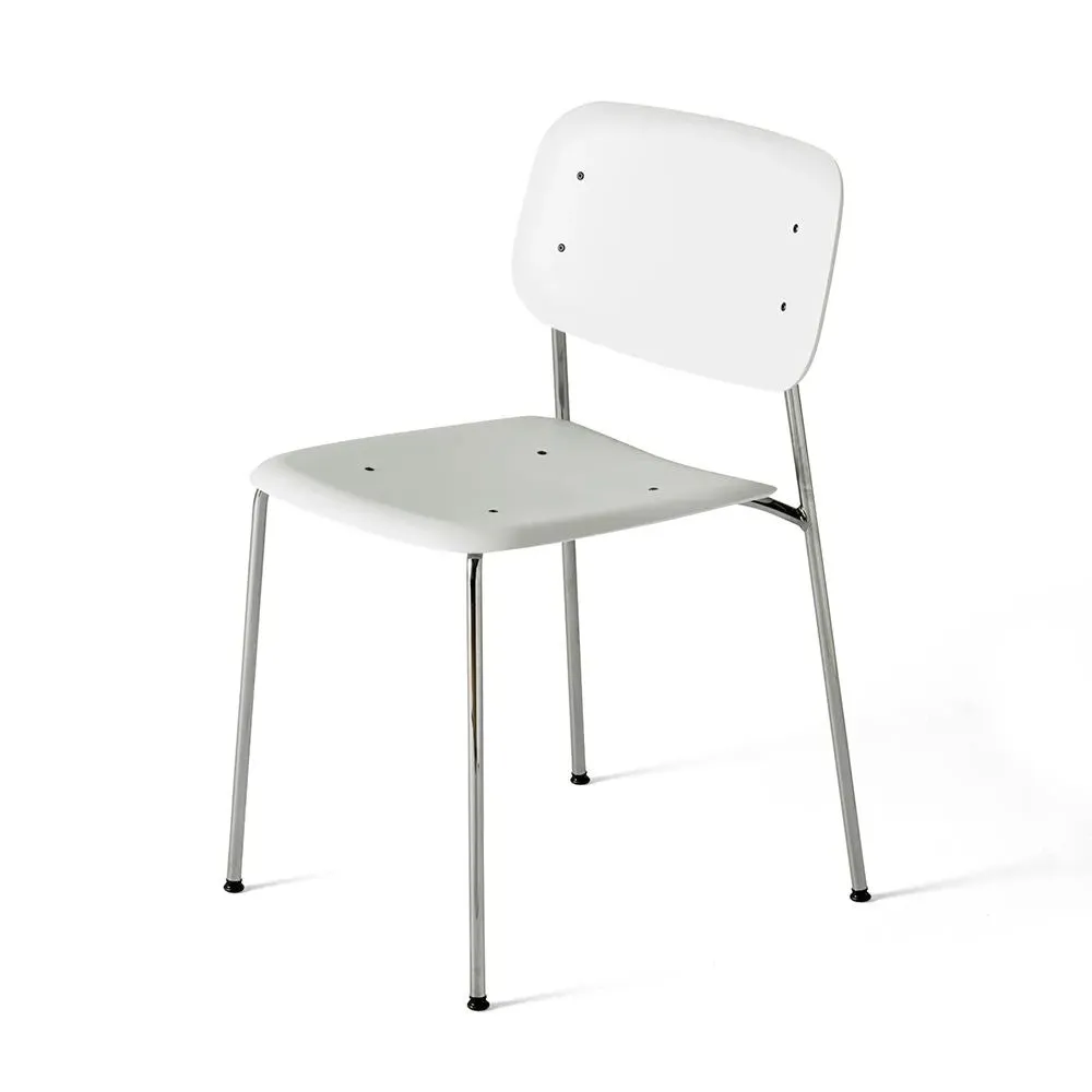 The Soft Edge 45 chair combines simplicity with functionality through its organically shaped seat and back design. Its plastic seat blends strong curves with lightweight construction to provide bodily comfort, while the powder coated steel base ensures stability. The stackable design offers practical storage solutions, and the durable materials suit various environments.