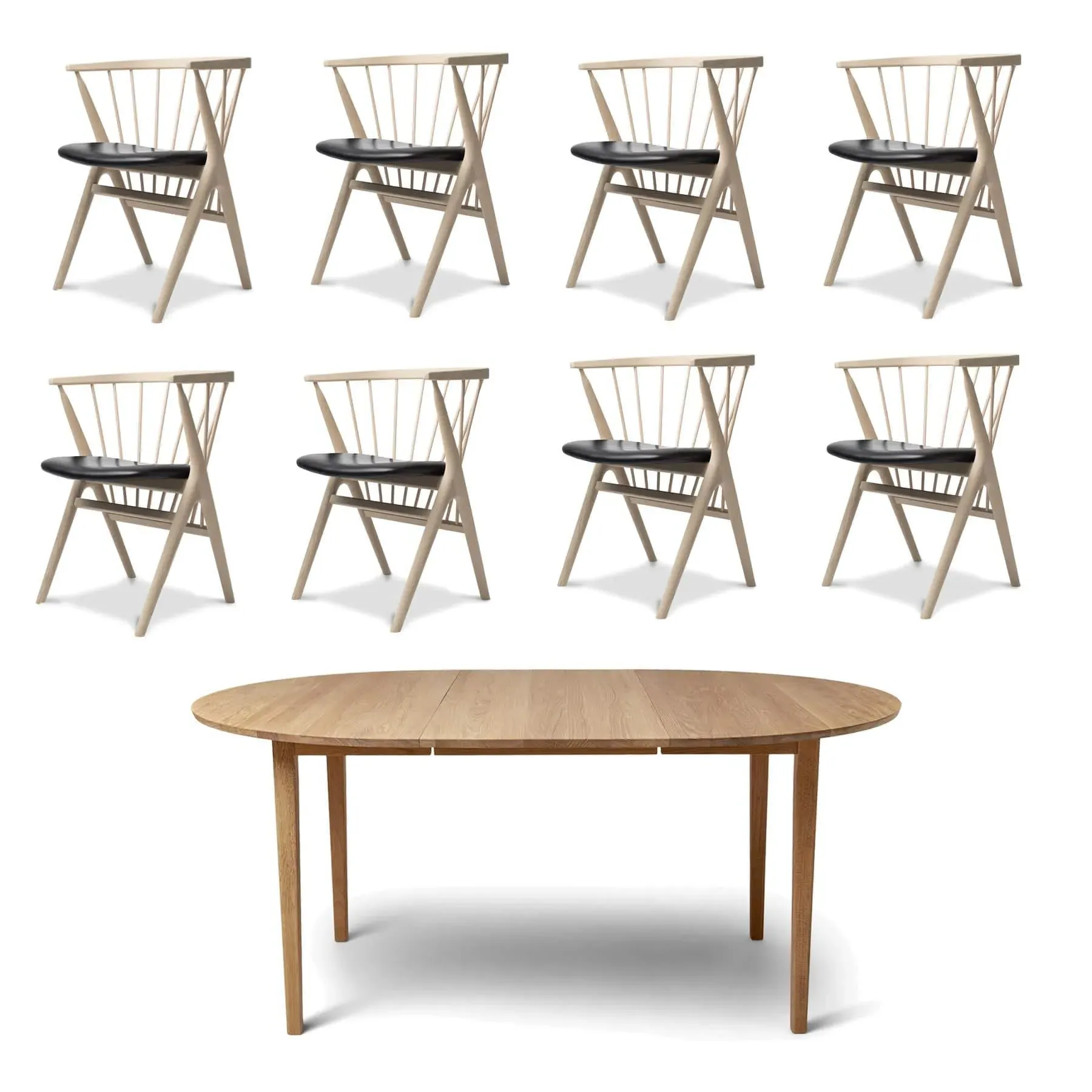 Introducing the Sibast Dining Bundle – a harmonious combination of the No3 dining table and your choice of six or eight No8 dining chairs. Crafted with meticulous attention to detail and a commitment to timeless design, this bundle encapsulates Scandinavian elegance. The centrepiece of this bundle is the No3 dining table, an embodiment of simplicity and functionality. Its clean lines and exceptional craftsmanship make it a versatile addition to any dining space, offering a welcoming surface for shared meals and conversations. Available in a choice of finishes, it seamlessly complements various decor styles. Pair the No3 table with the No8 dining chairs, known for their classic design and exceptional comfort. These chairs feature gentle curves, emphasizing their organic shapes, and come in a variety of wood and upholstery options to suit your preference. Together, the Sibast Dining Bundle delivers a dining experience that blends beauty, quality, and practicality, transforming your dining area into a place of timeless elegance. No3 dining table with extension leaf Height: 74cmDiameter (without extension leaf): 120cm Length (with extension leaf): 170cm No8 dining chairs Overall height: 73.5cm Length: 54.5cm Seat height: 45cm