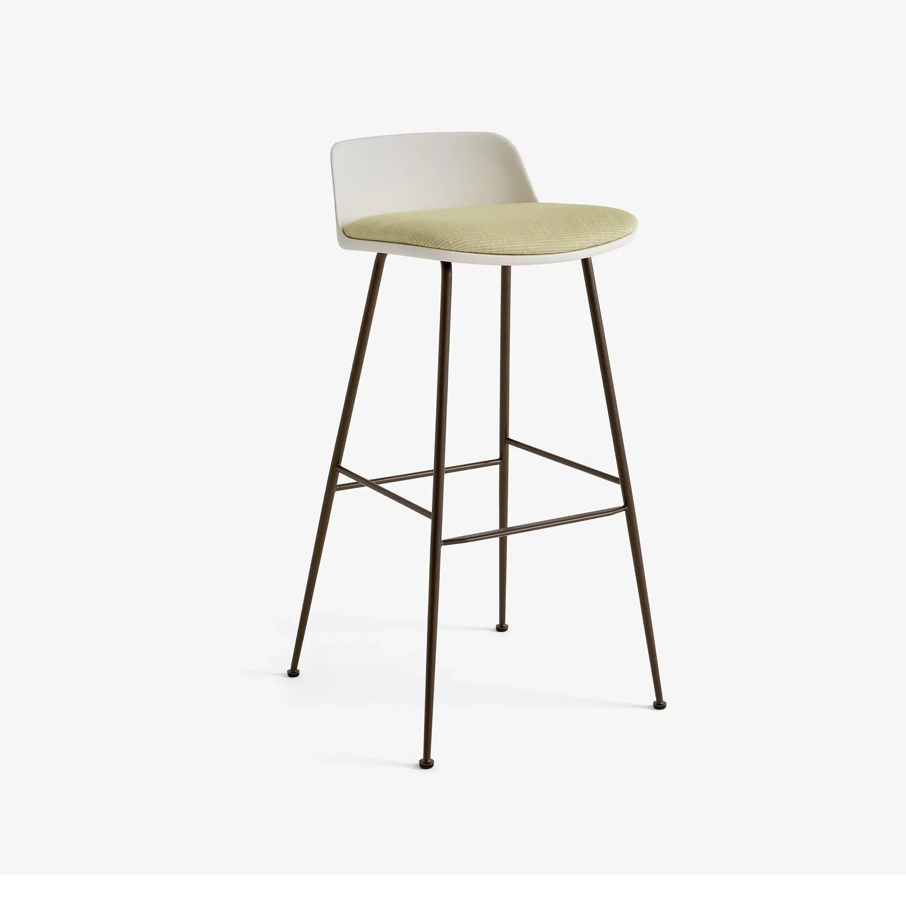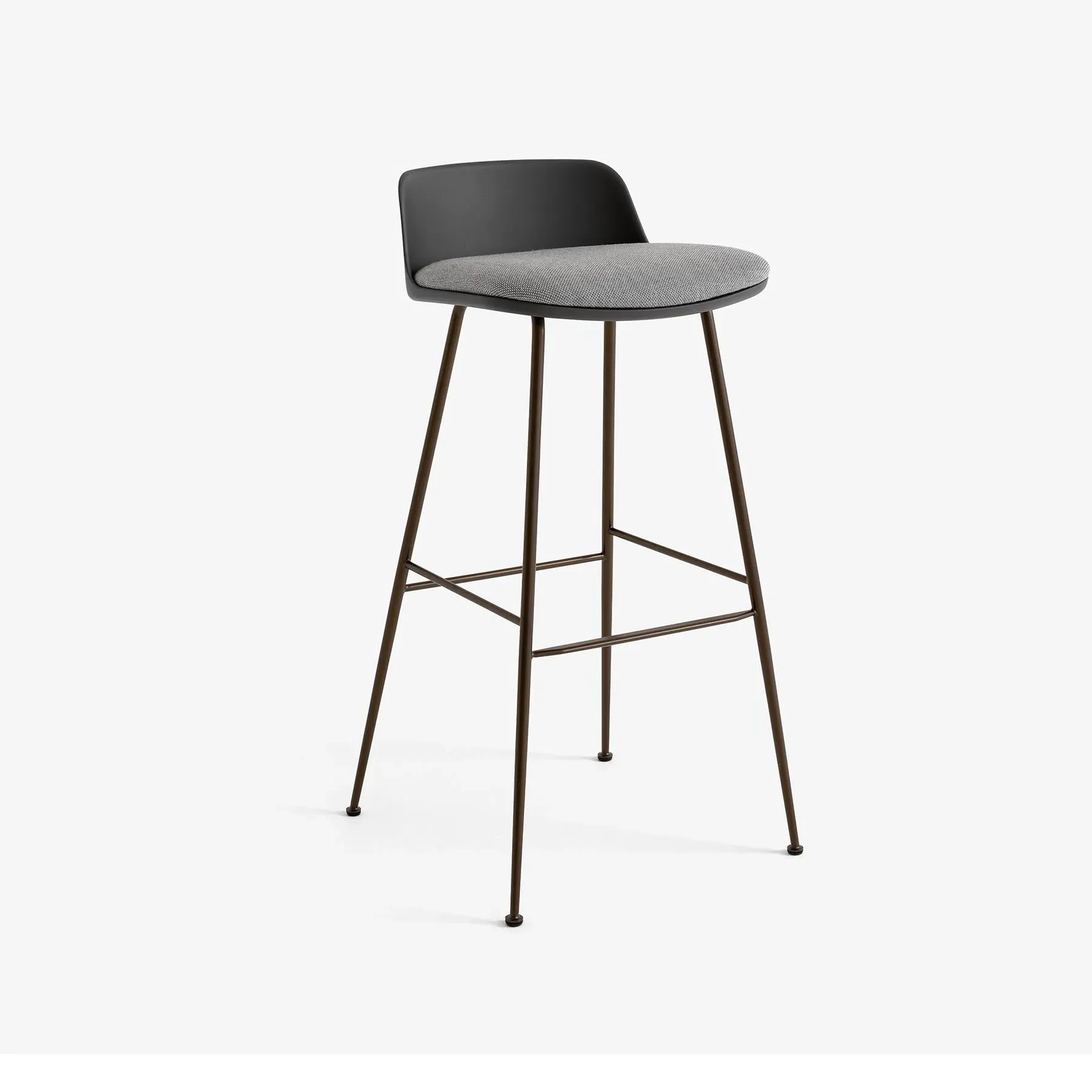 The Rely Bar Stool offers comfort with its upholstered cushion seat and recycled plastic shell construction. Its compact design provides versatile seating, while the bronzed legs add durability and support. The eco-conscious materials suit sustainable interiors, and the 66.5cm height ensures optimal bar counter compatibility.