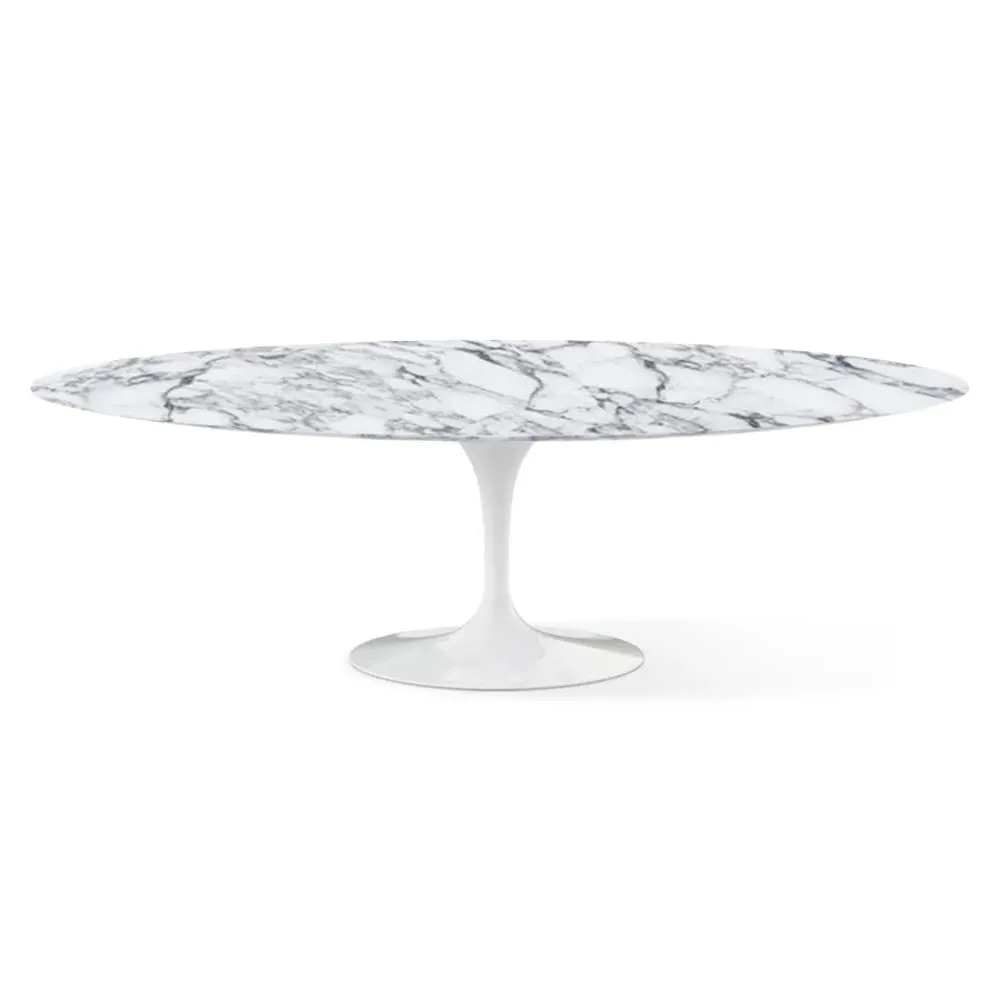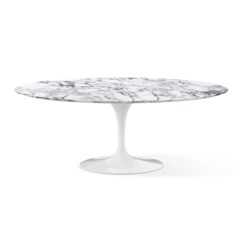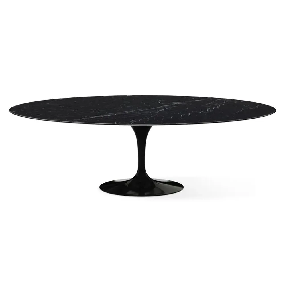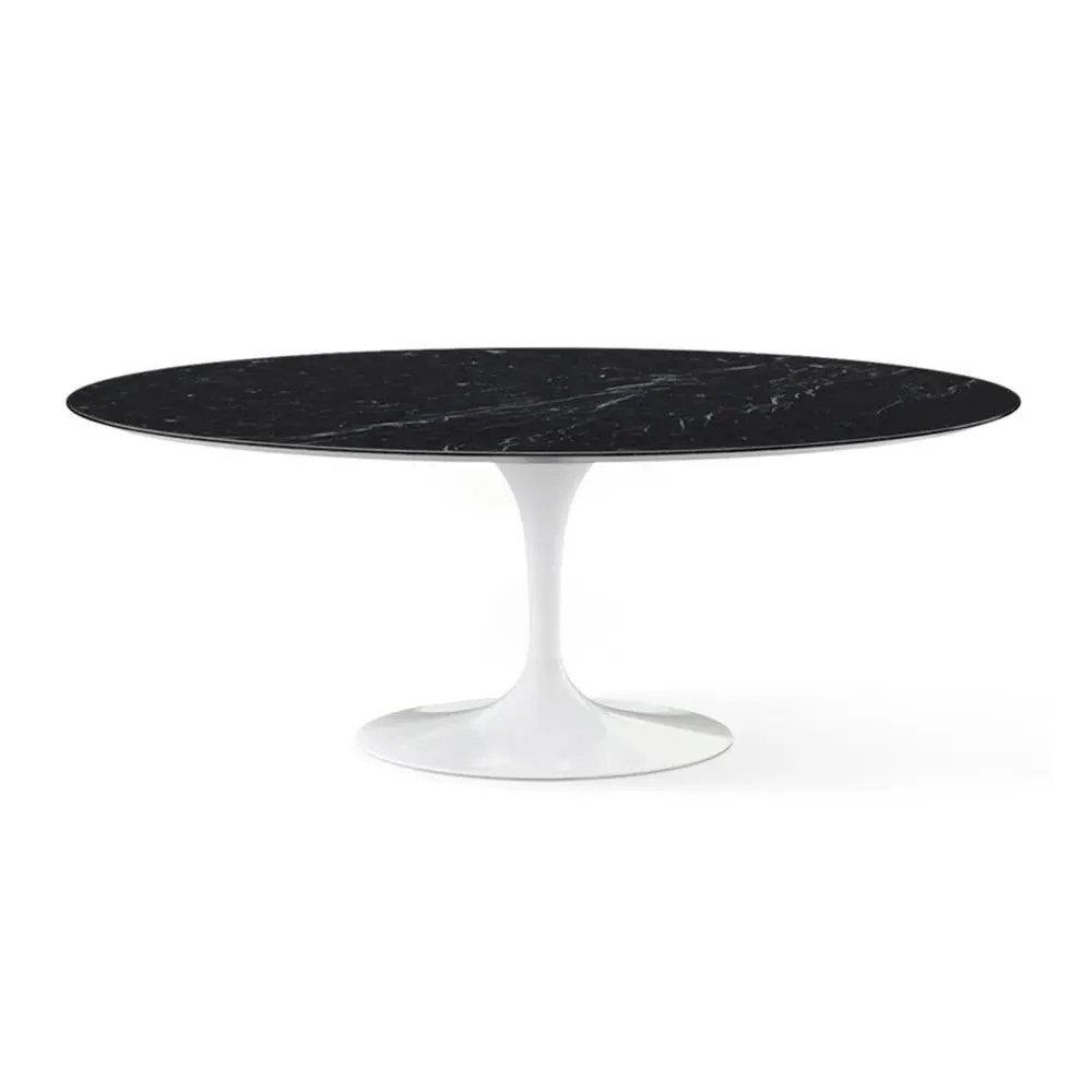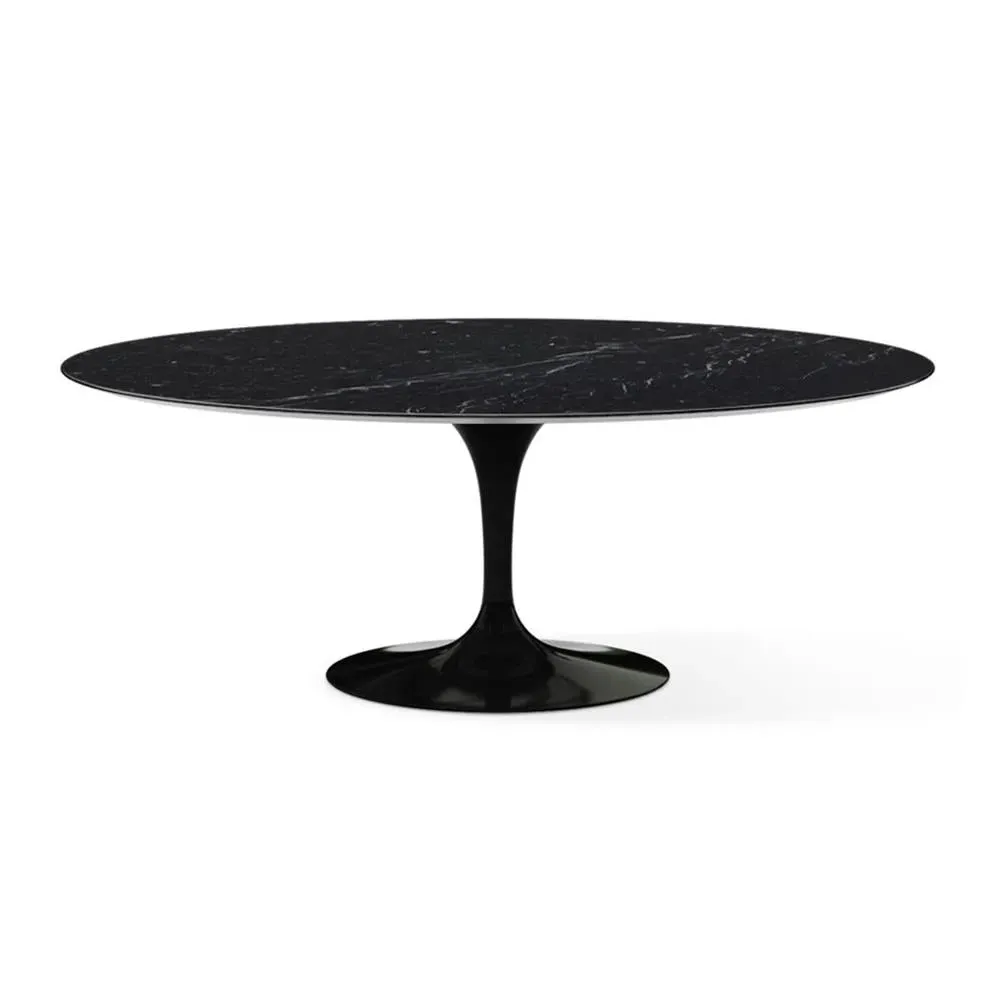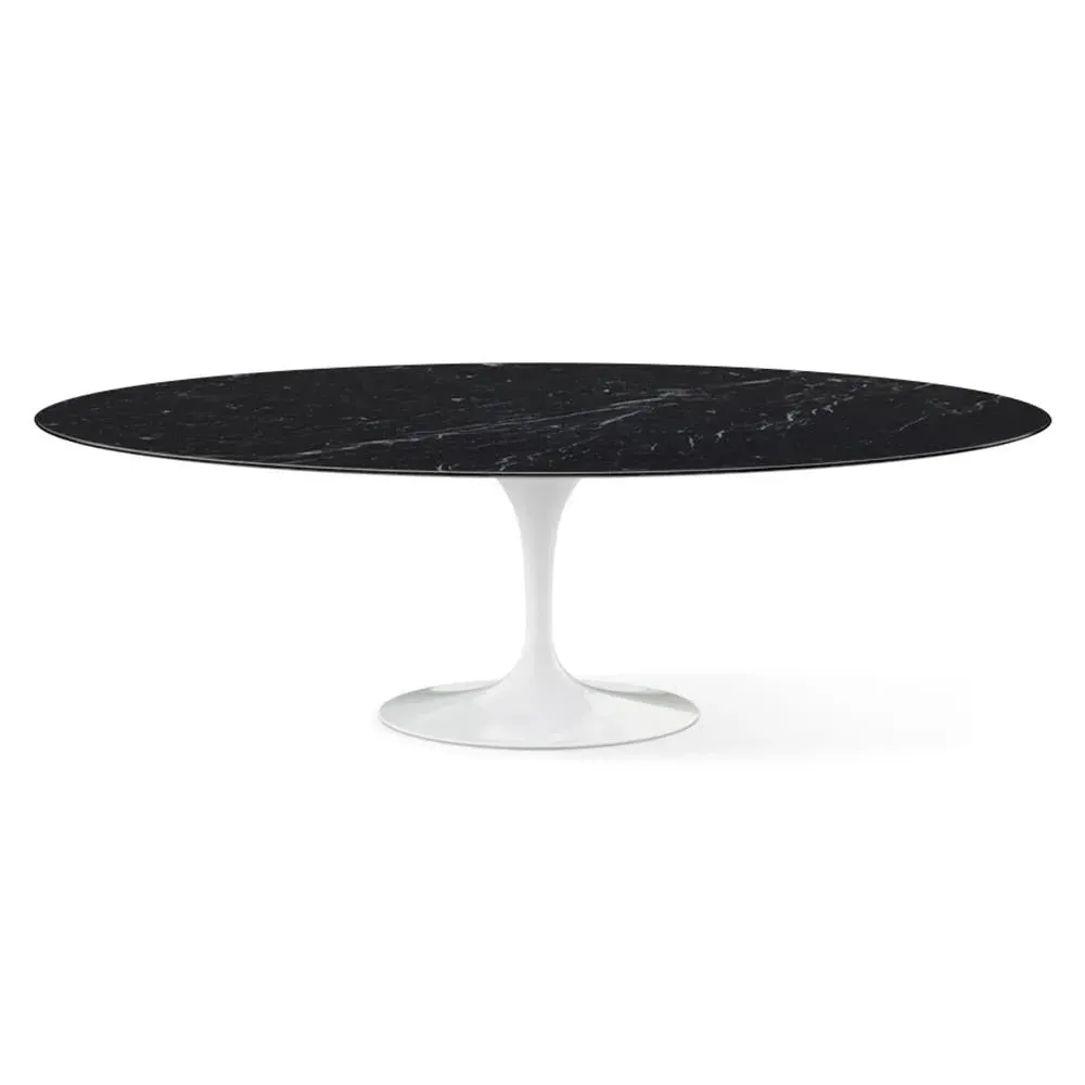 Experience timeless sophistication with the Saarinen Dining Table by Knoll. Designed by Eero Saarinen, this modern classic features a luxurious marble top, available in striking white with grey veins or dramatic black with white veins. The round tabletop, meticulously crafted from high-quality marble, exudes elegance and charm, making it a focal point in any dining space. Each piece of marble boasts unique veining patterns, ensuring no two tables are alike, adding a touch of exclusivity to your home. Supported by the iconic pedestal base, the table strikes a perfect balance between form and function. Its sculptural silhouette lends a sense of grace and stability, while seamlessly blending with various interior styles, from contemporary to traditional. Whether hosting intimate dinners or entertaining guests, the Saarinen Dining Table provides a stunning backdrop for memorable gatherings. Elevate your dining experience with this exquisite piece of design history, promising enduring beauty and sophistication for years to come. Small: 3 peopleMedium: 4-5 peopleLarge: 5-6 peopleXL: 6 peopleXXL: 7-8 people