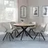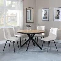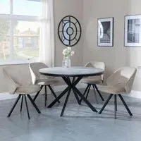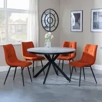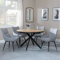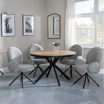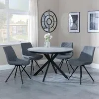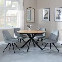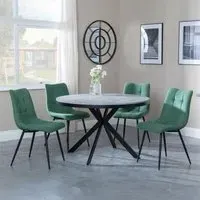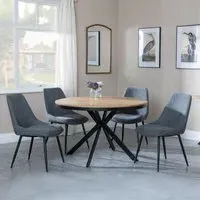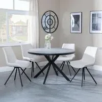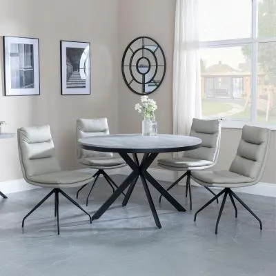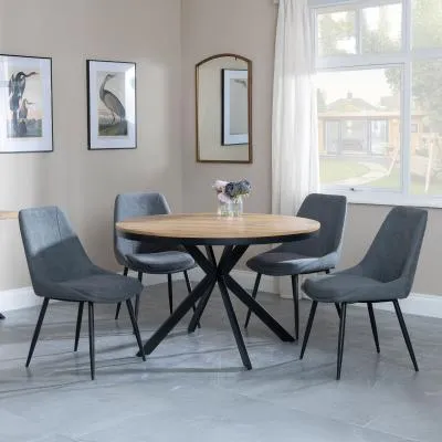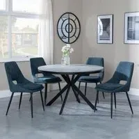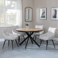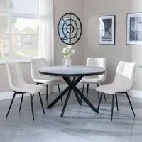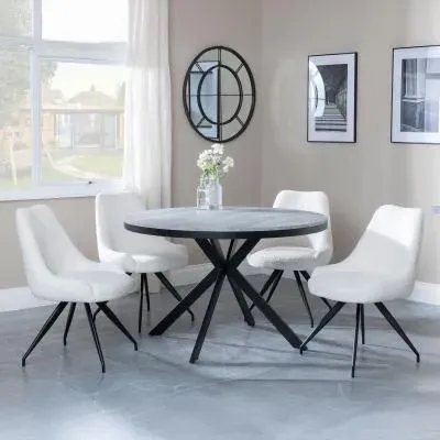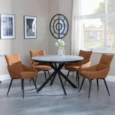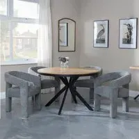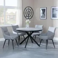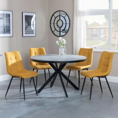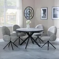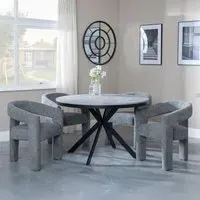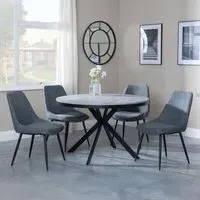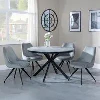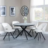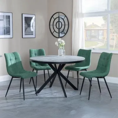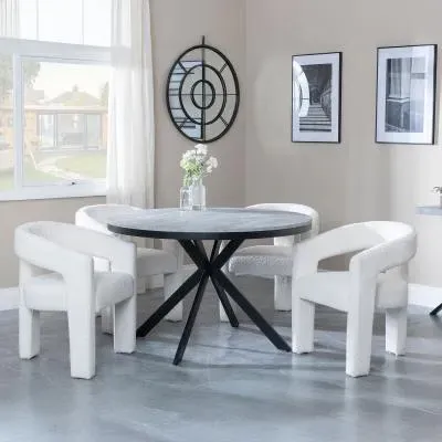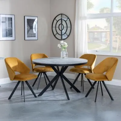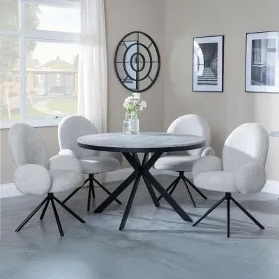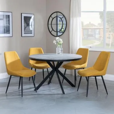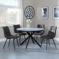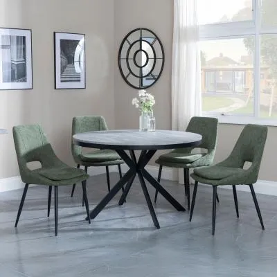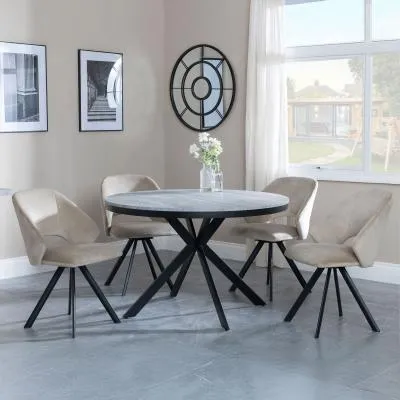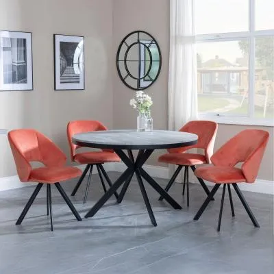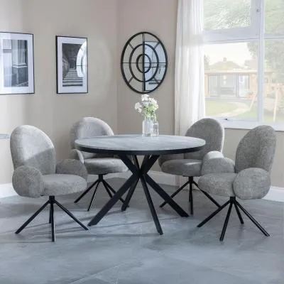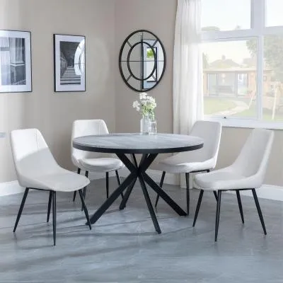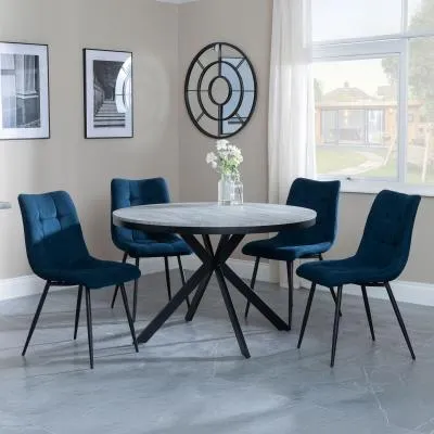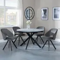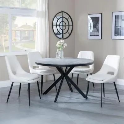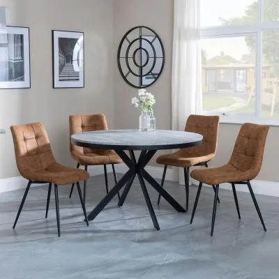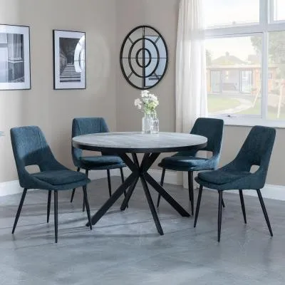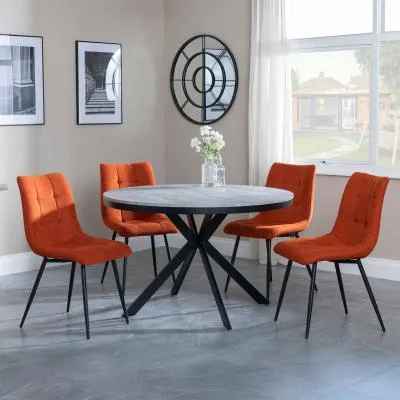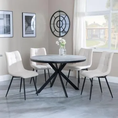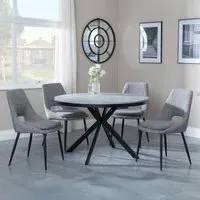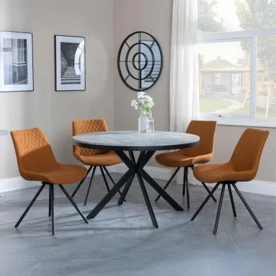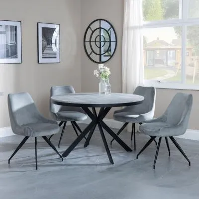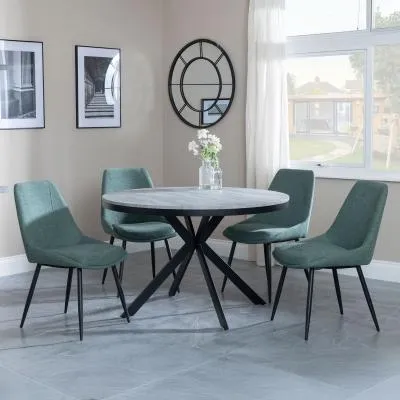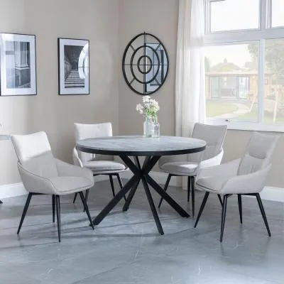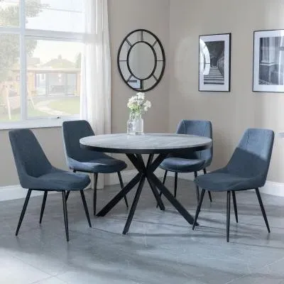 The Ezra dining set combines a round MDF table with four Corona fabric chairs for complete dining functionality. Its concrete-effect grey top features distinctive black spider legs, while the light grey upholstered chairs provide comfortable seating. The durable MDF construction ensures longevity, and the compact design fits comfortably in most dining areas. Table: W120 x D120 x H76 cm, Chairs: W44 x D61 x H88 cm.