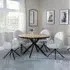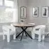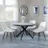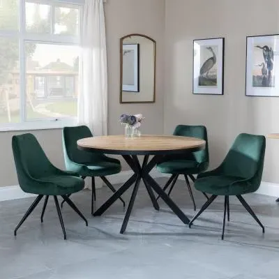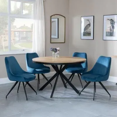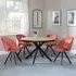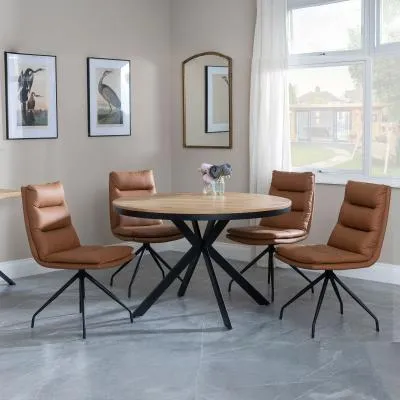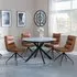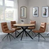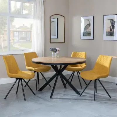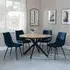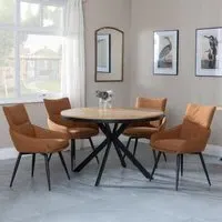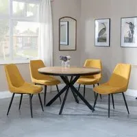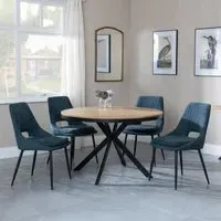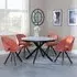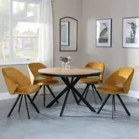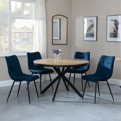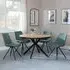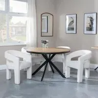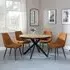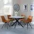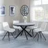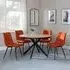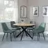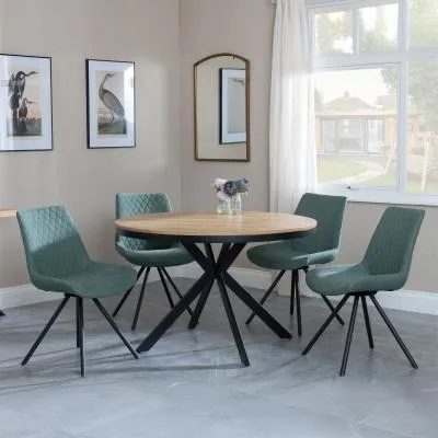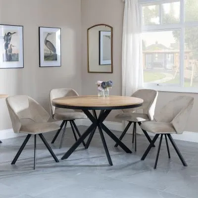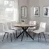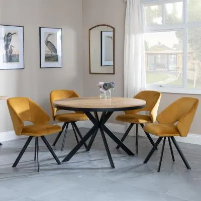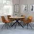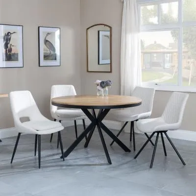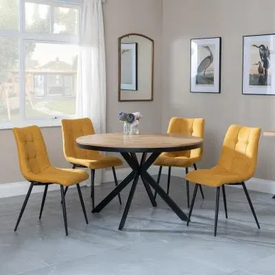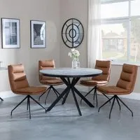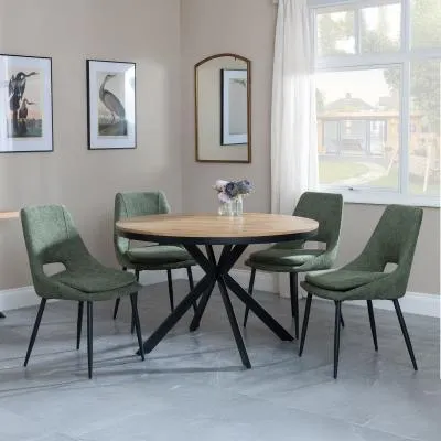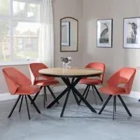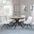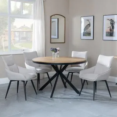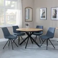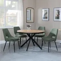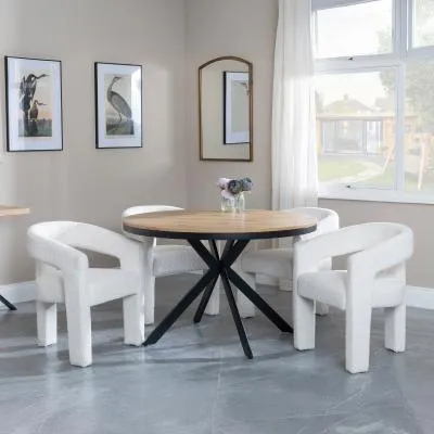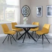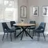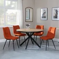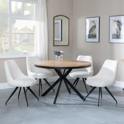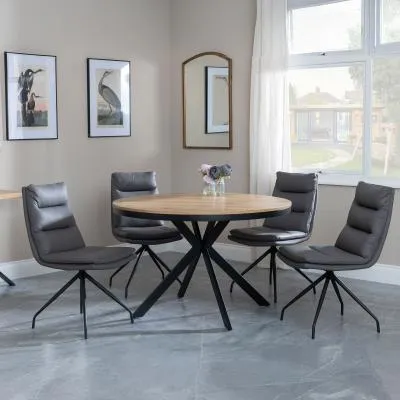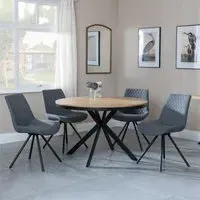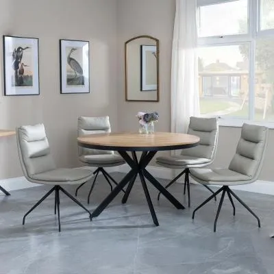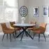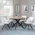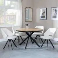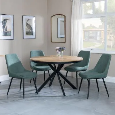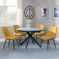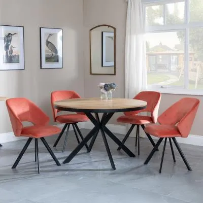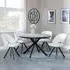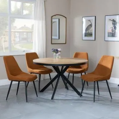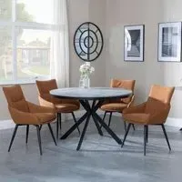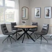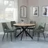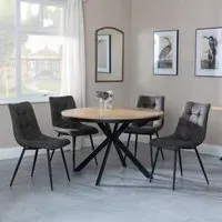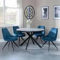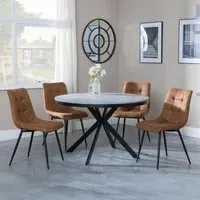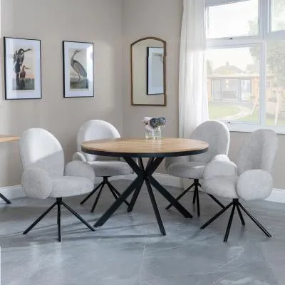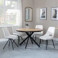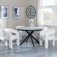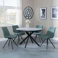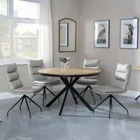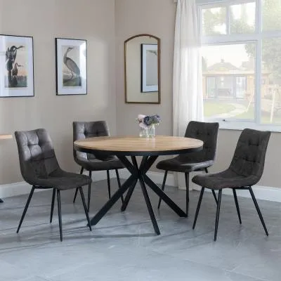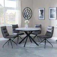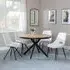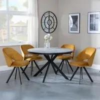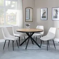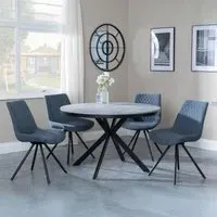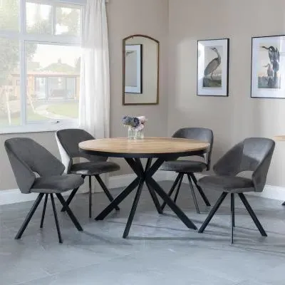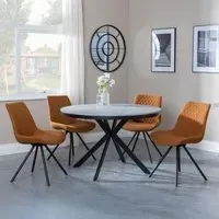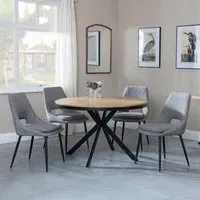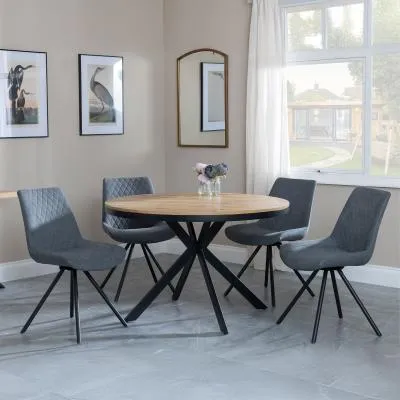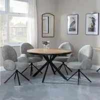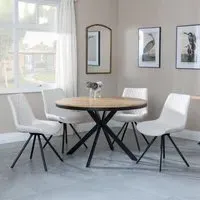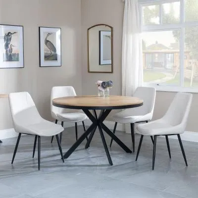 The Ezra dining set combines a round MDF table with four Corona fabric chairs for complete dining functionality. Its concrete-effect grey top features distinctive black spider legs, while the light grey upholstered chairs provide comfortable seating. The durable MDF construction ensures longevity, and the compact design fits comfortably in most dining areas. Table: W120 x D120 x H76 cm, Chairs: W44 x D61 x H88 cm.