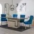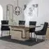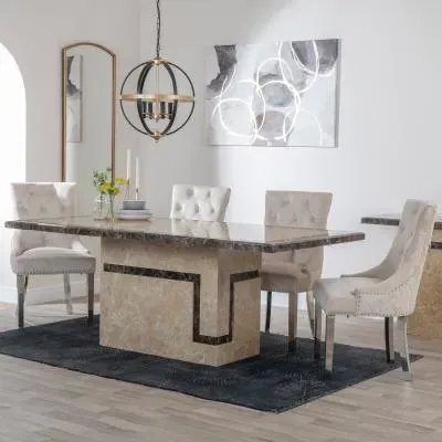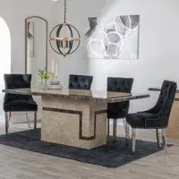 The Venice dining set combines a cream marble table with lion knocker back dining chairs in black velvet fabric. The chairs feature black wooden legs that complement the rich velvet upholstery, while the marble table surface provides durability and easy maintenance. The distinctive lion knocker detailing adds character to each chair back, and the sturdy construction ensures long-lasting use.