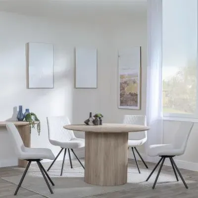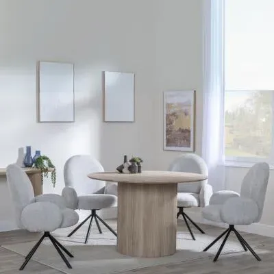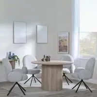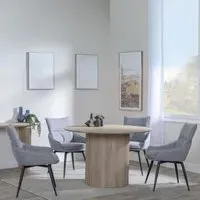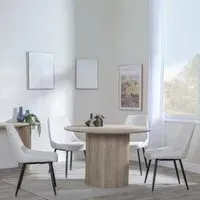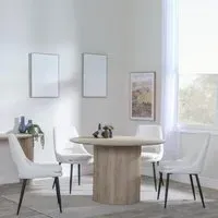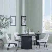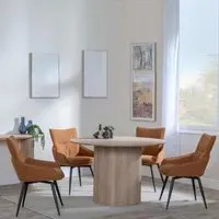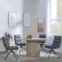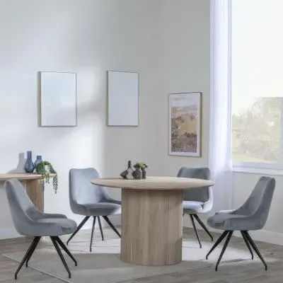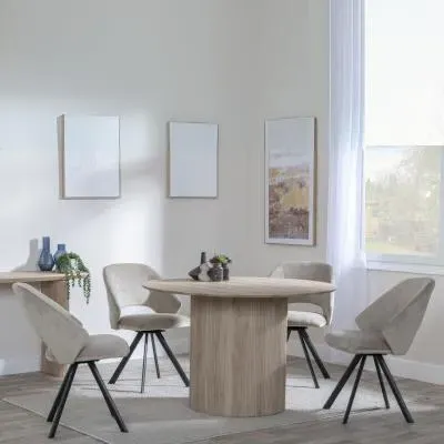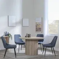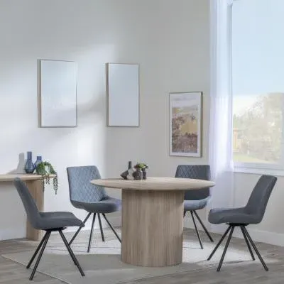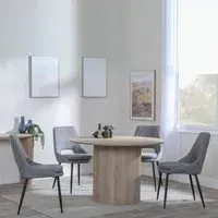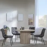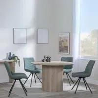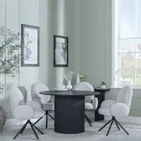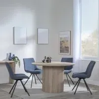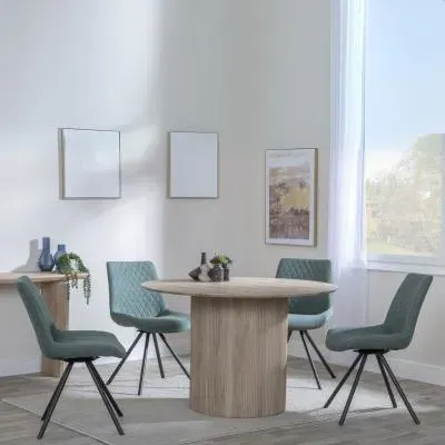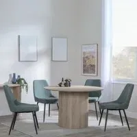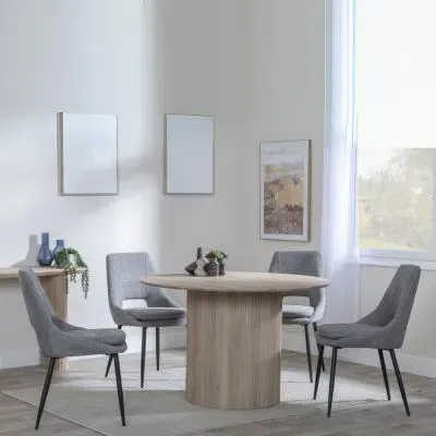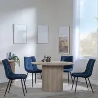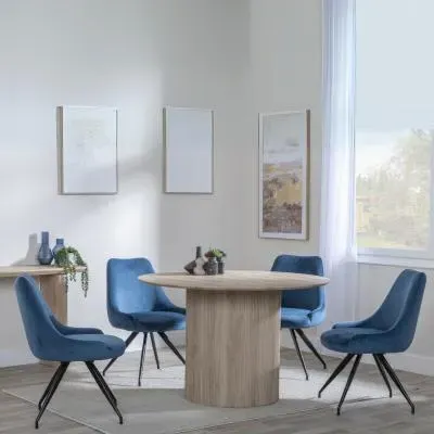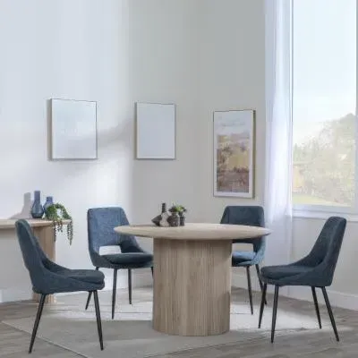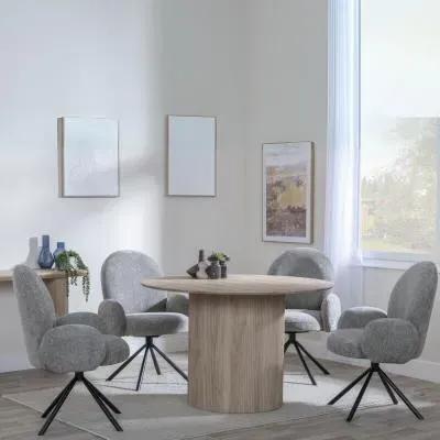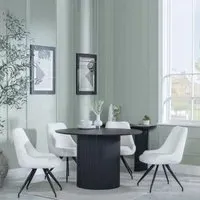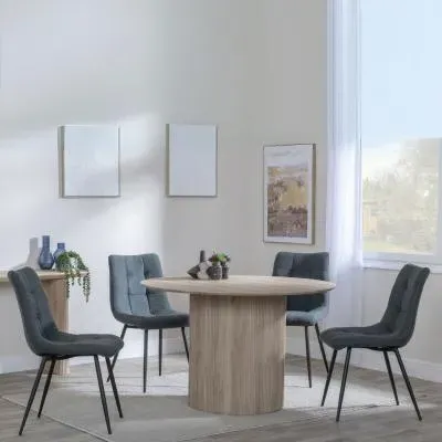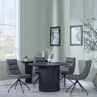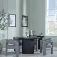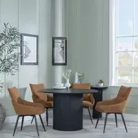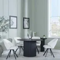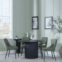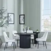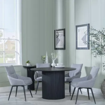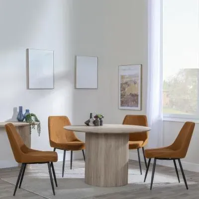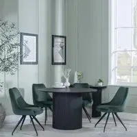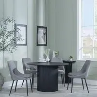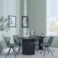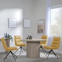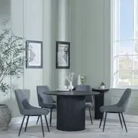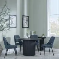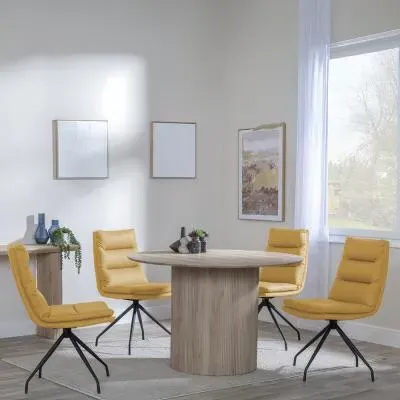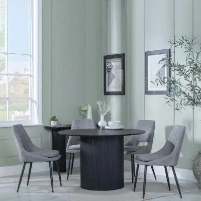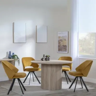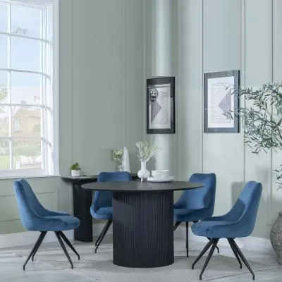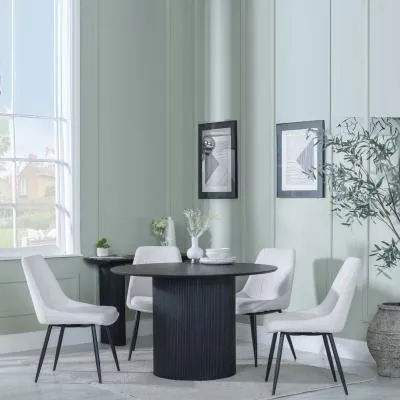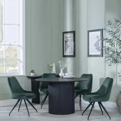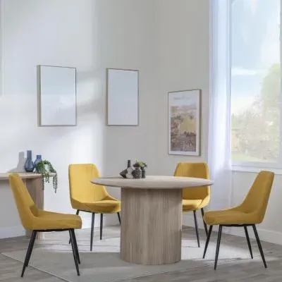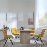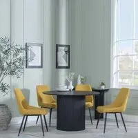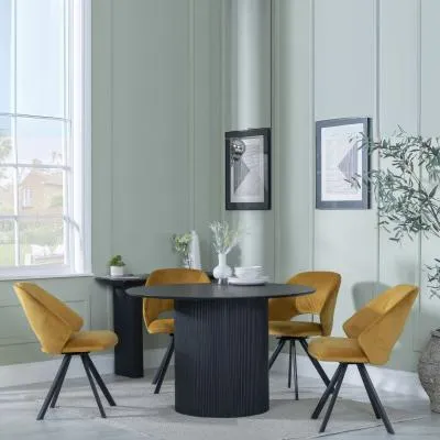 The Bern dining set combines a fluted black table with four Corona yellow fabric chairs for vibrant dining. The round MDF table features a sleek black finish, while the chairs provide comfortable seating with their bright fabric upholstery. Its 4-seater configuration suits family meals and entertaining, and the durable construction ensures long-lasting quality. Table: W120 x D120 x H76 cm, Chairs: W44 x D61 x H88 cm.
