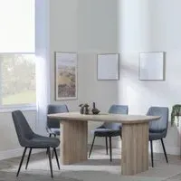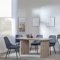 The Bern Fluted Dining Set offers a striking combination of warmth and vibrancy with its oak effect table and Darwin yellow fabric chairs. The rectangular MDF table features fluted detailing that adds texture and visual depth, while the yellow upholstery provides comfortable seating with a bold pop of color. Its sturdy construction ensures durability for daily use, and the contrasting materials create an eye-catching focal point. Table: W160 x D90 x H76 cm, Chairs: W50 x D64.5 x H87 cm.