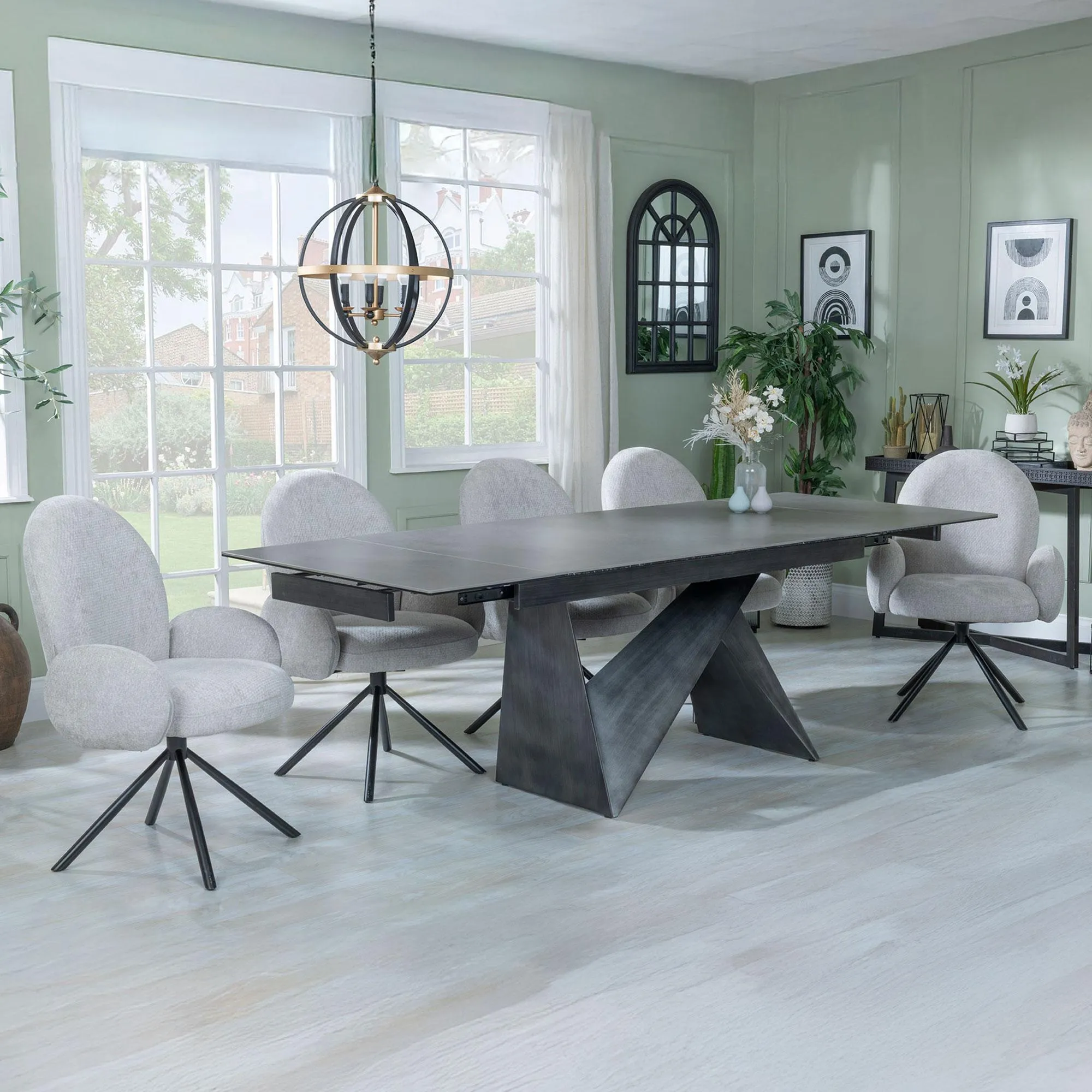 The Garvin Extending Dining Set offers versatile dining with its dark grey ceramic table surface that extends for larger gatherings. The Diego beige leather swivel chairs provide comfortable seating with smooth rotation capability, while the ceramic construction ensures lasting durability and simple upkeep. The extending function accommodates varying group sizes, and the leather upholstery adds refined comfort to every meal.