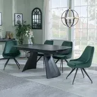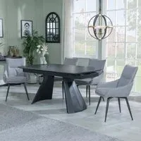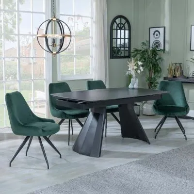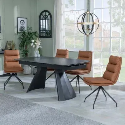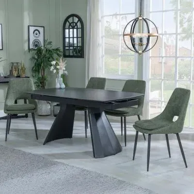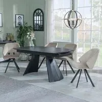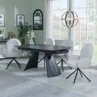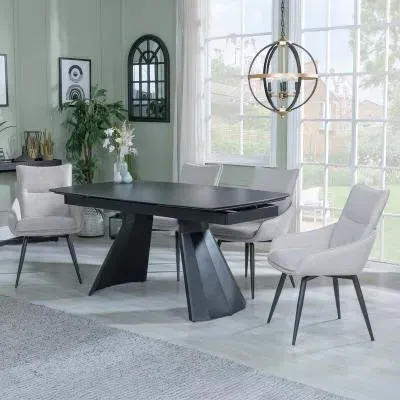 The Kinston dining set combines a black ceramic extending table with Peyton cream fabric chairs. The ceramic construction ensures resistance to daily wear and easy upkeep, while the extending feature provides flexible seating capacity. The fabric chairs offer comfortable padding and breathable material, supported by a sturdy frame design.