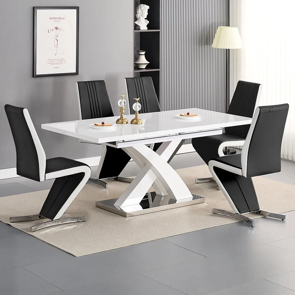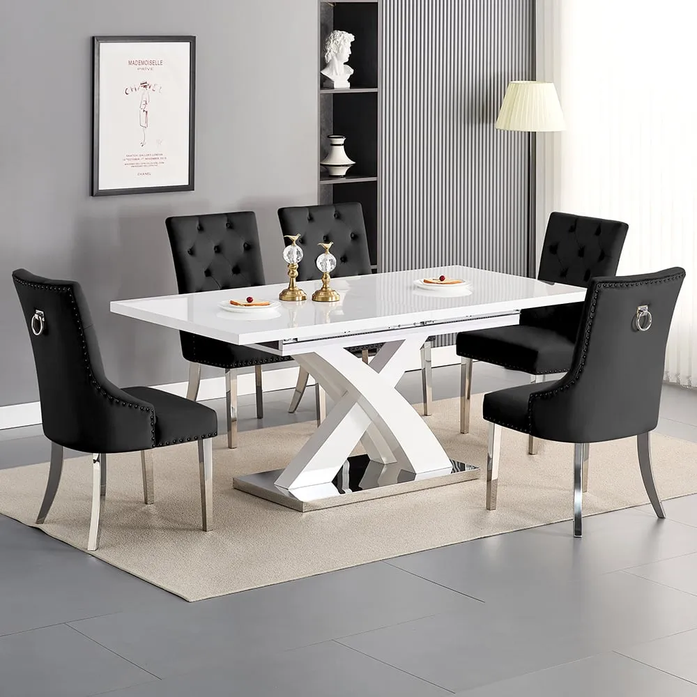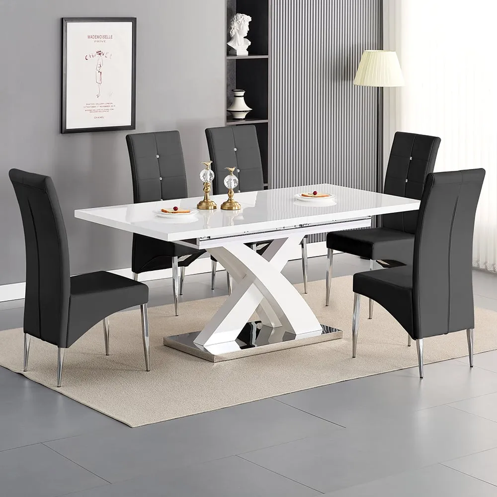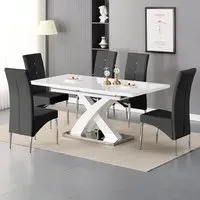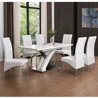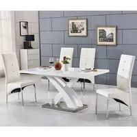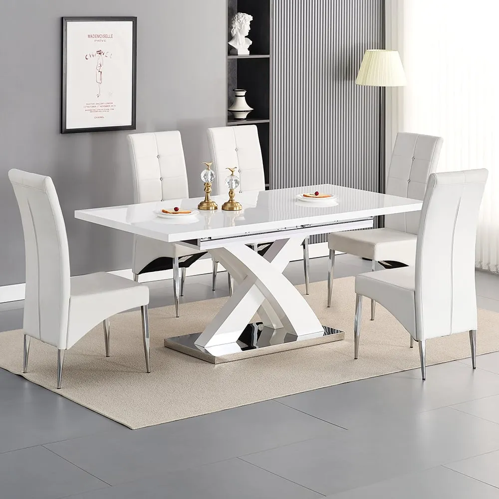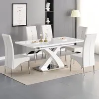The Axara dining set offers a cohesive white finish with its high gloss lacquered table and four white faux leather Vesta chairs. The table extends from 120cm to 160cm using a central extension system, while its MDF construction with stainless steel base ensures stability. The Vesta chairs feature chrome legs with padded seats and backrests for comfort, and their ergonomic design complements the table's X-shaped support structure. Table: W120-160 x D85 x H75 cm, Chairs: W50 x D45 x H96 cm.