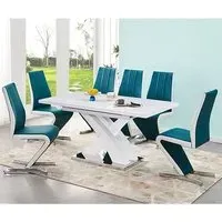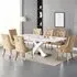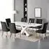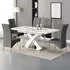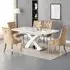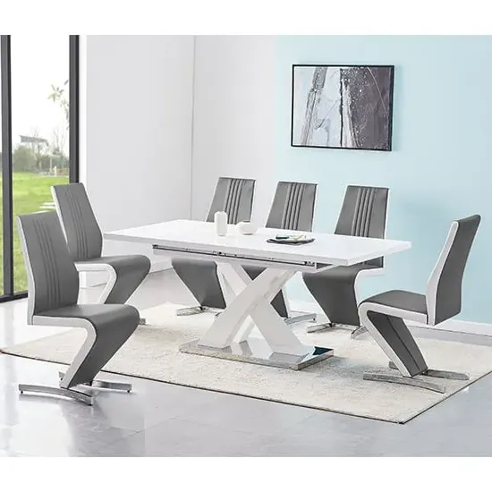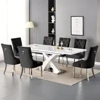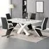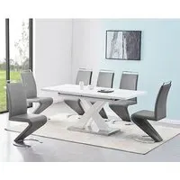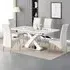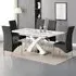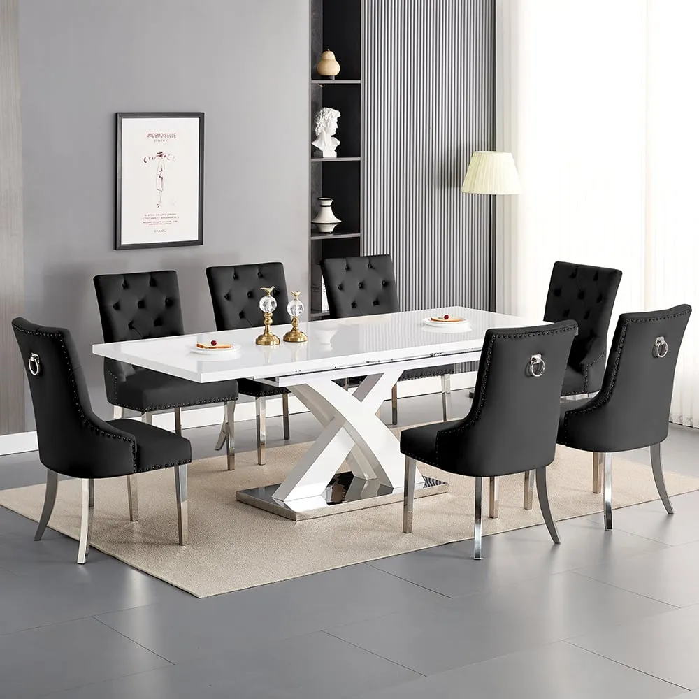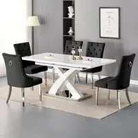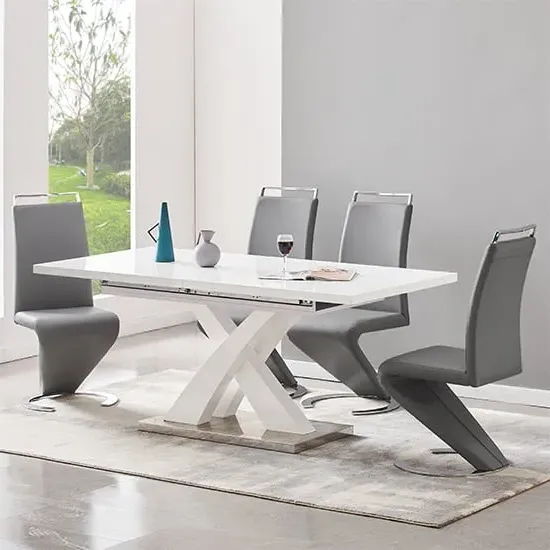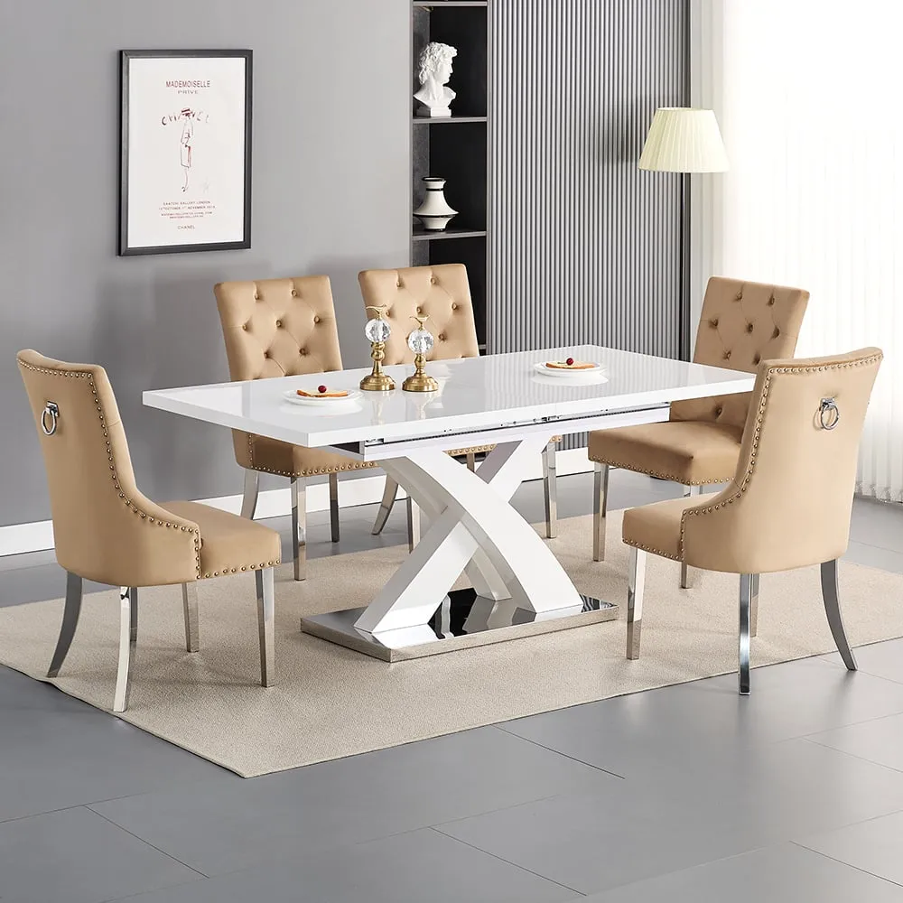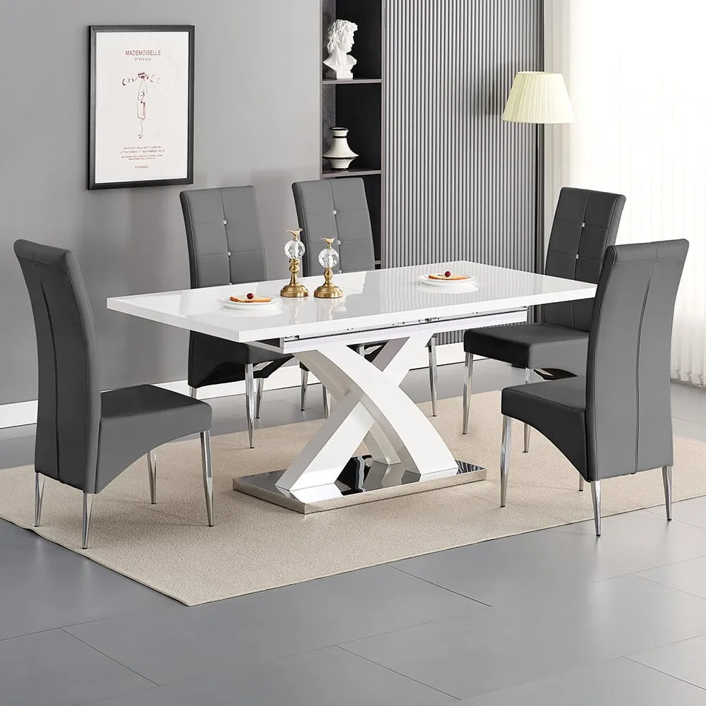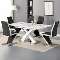 The Axara dining set offers a cohesive white finish with its high gloss lacquered table and four white faux leather Vesta chairs. The table extends from 120cm to 160cm using a central extension system, while its MDF construction with stainless steel base ensures stability. The Vesta chairs feature chrome legs with padded seats and backrests for comfort, and their ergonomic design complements the table's X-shaped support structure. Table: W120-160 x D85 x H75 cm, Chairs: W50 x D45 x H96 cm.