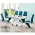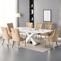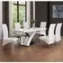 The Axara Small Extending White Dining Table with 4 Vesta White Chairs is a stylish and practical dining set that's perfect for any modern home. The table is finished in a glossy white lacquer and features a minimalist design that exudes elegance and simplicity. It can comfortably seat four people, but can easily extend to accommodate up to six with the included extension leaf. The chairs feature a white faux leather upholstery and are ergonomically designed for maximum comfort, with a supportive backrest and padded seat. The sleek chrome legs of the chairs complement the table's legs perfectly, creating a cohesive and stylish aesthetic. This dining set is not only beautiful, but also practical, as it is constructed with high-quality materials to ensure durability and longevity. It's perfect for intimate dinners or entertaining guests, and will make a stunning addition to any dining room. Features: Axara Extending Small Dining Table White Gloss And 4 Vesta White Dining Chairs Axara Extendable Small Dining Table In All White High Gloss All White High Gloss And Stainless Steel Base Structure MDF High Gloss lacquered Wood Lacquered Base Contour in Stainless Steel Stylish 'X' Shape White High Gloss Support The Furniture Surface is Waterproof and Can be Cleaned Very Easily It Can Easily Extended into 120 to 160cm By its Clever System of Central Extension 4 x Vesta studded dining chair with thick cushioned padded seat and back in white faux leather Also Available in Black And Grey Faux Leather It Would compliment any dining table and adds beauty to the dining room Dining Table Also Available in White And Black High Gloss Ideal for your Dining room Available at an Affordable Price Dimension: Dining Table:(DTM_7530) W 120cm-160cm x D 85cm x H 75cm Dining Chair: (dc_040) L 50cm x H 96cm x D 45cm