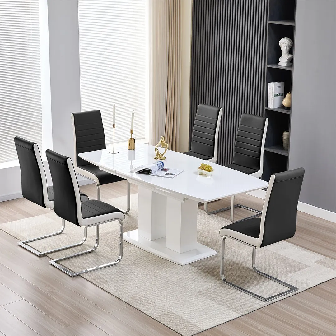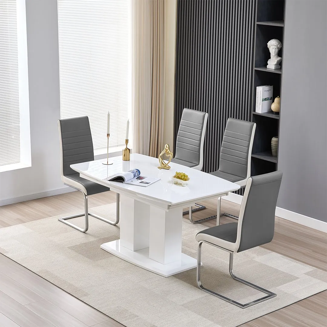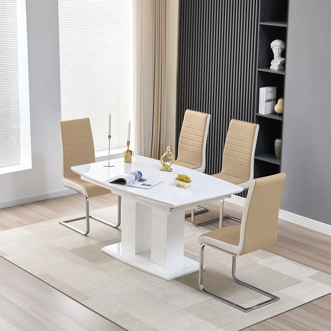 The Genisimo dining set offers versatile dining with its extendable high-gloss table and striking Symphony chairs. The white MDF table extends from 140cm to 180cm using a pull-out mechanism, supported by a robust dual-column pedestal base. Four Symphony chairs feature two-tone faux leather upholstery with chrome stainless steel frames for comfort and durability. Table dimensions: W90 x D140-180 x H76 cm.
