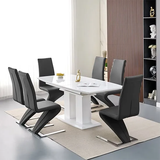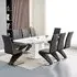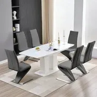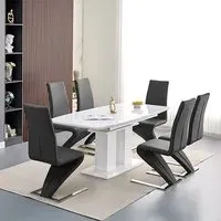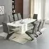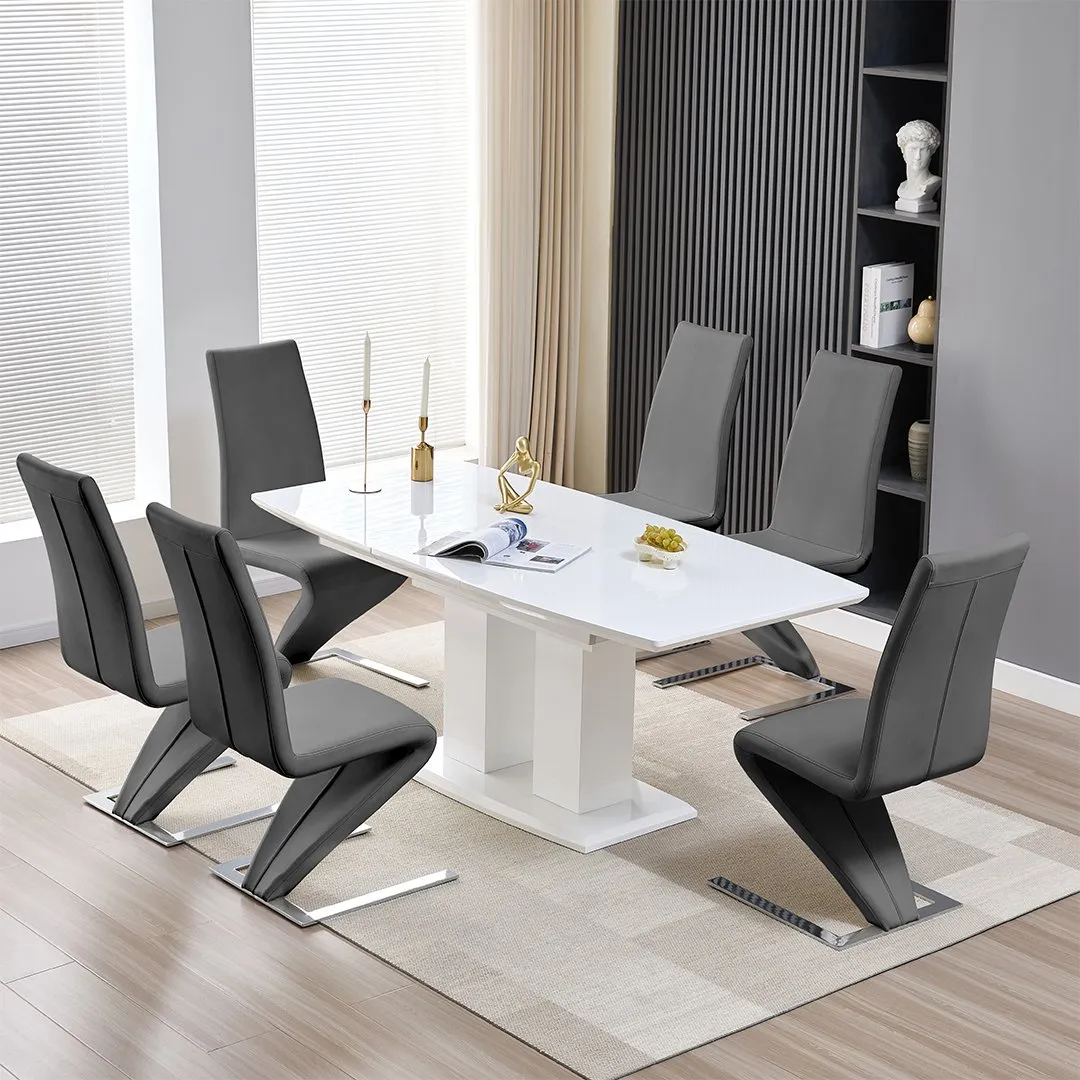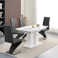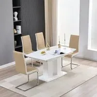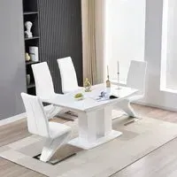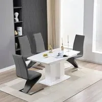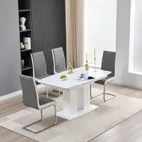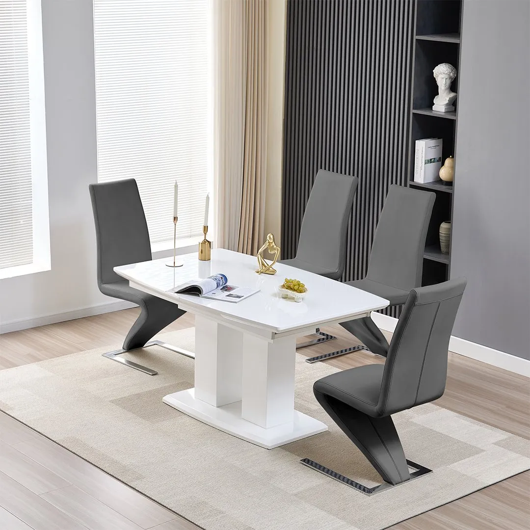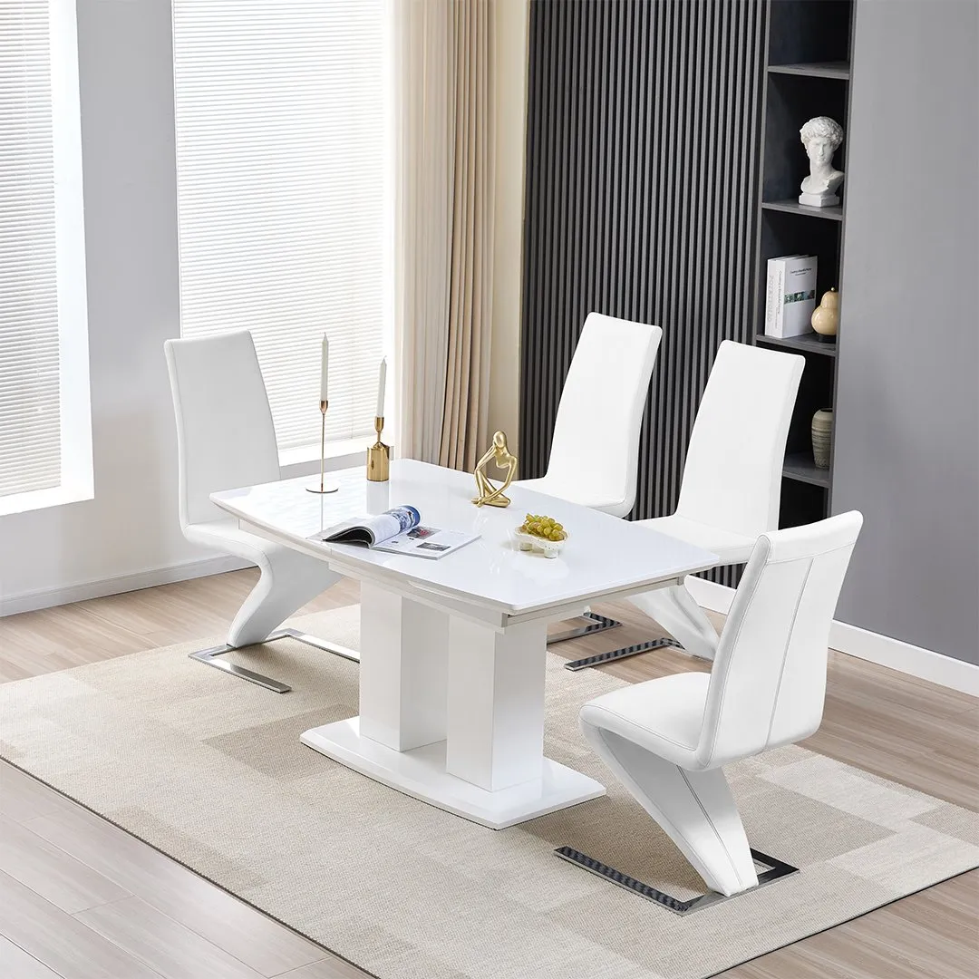 The Genisimo dining set offers versatile dining with its extendable high-gloss table and striking Symphony chairs. The white MDF table extends from 140cm to 180cm using a pull-out mechanism, supported by a robust dual-column pedestal base. Four Symphony chairs feature two-tone faux leather upholstery with chrome stainless steel frames for comfort and durability. Table dimensions: W90 x D140-180 x H76 cm.