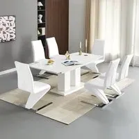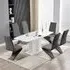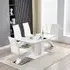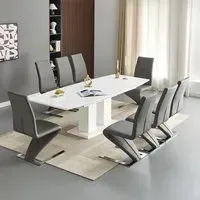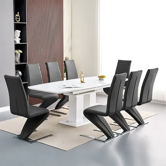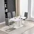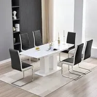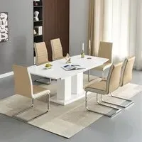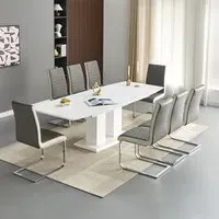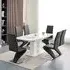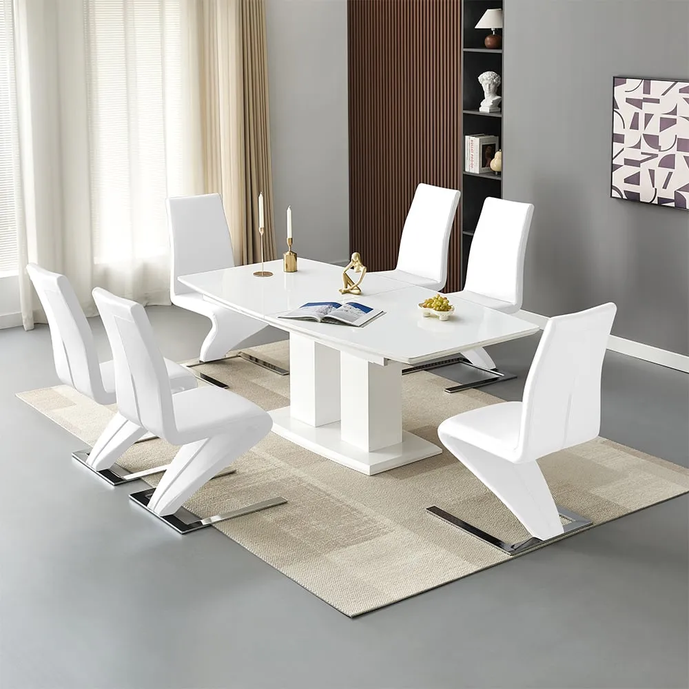 The Genisimo Small Gloss Extending Dining Table with 4 Symphony Black and White Chairs from Furniture in Fashion brings a stylish and contemporary touch to your dining space. The table features a sleek high-gloss finish that radiates modern elegance, and its extending design offers flexibility for both everyday use and entertaining guests. Paired with four Symphony Black and White Chairs, which boast a striking two-tone design and comfortable seating, this set creates a visually stunning dining area. Crafted from high-quality materials, the Genisimo Dining Set offers durability and timeless appeal, exclusively from Furniture in Fashion. FEATURES : Table Material : Painted MDF (Medium Density Fibreboard) Table Finish : White High Gloss Chair Material : Faux Leather, Stainless Steel Chair Finish : Black And White, Chrome Modern pedestal table with pull-out function Exceptional foot with 2 columns White high gloss finish exudes chic elegance Futuristic design with lasting impression High-quality materials Excellent workmanship Stable construction A lint-free cotton cloth moistened with water is sufficient for cleaning the surface Not use abrasive or solvent-based cleaning agents Wipe clean with a dry cloth Extendable Dinning Table 18mm+25mm MDF E1+PU white high gloss Pillar Dimension - 20x20x54cm Base Dimension - 80x48x4cm DINING TABLE DIMENSIONS (GENI14WH-DT) : Height : 76cm Length : 140cm to 180cm Width : 90cm DINING CHAIR DIMENSIONS (SYMPHONY-BLWH) : Height : 104cm Width : 42cm Depth : 56cm