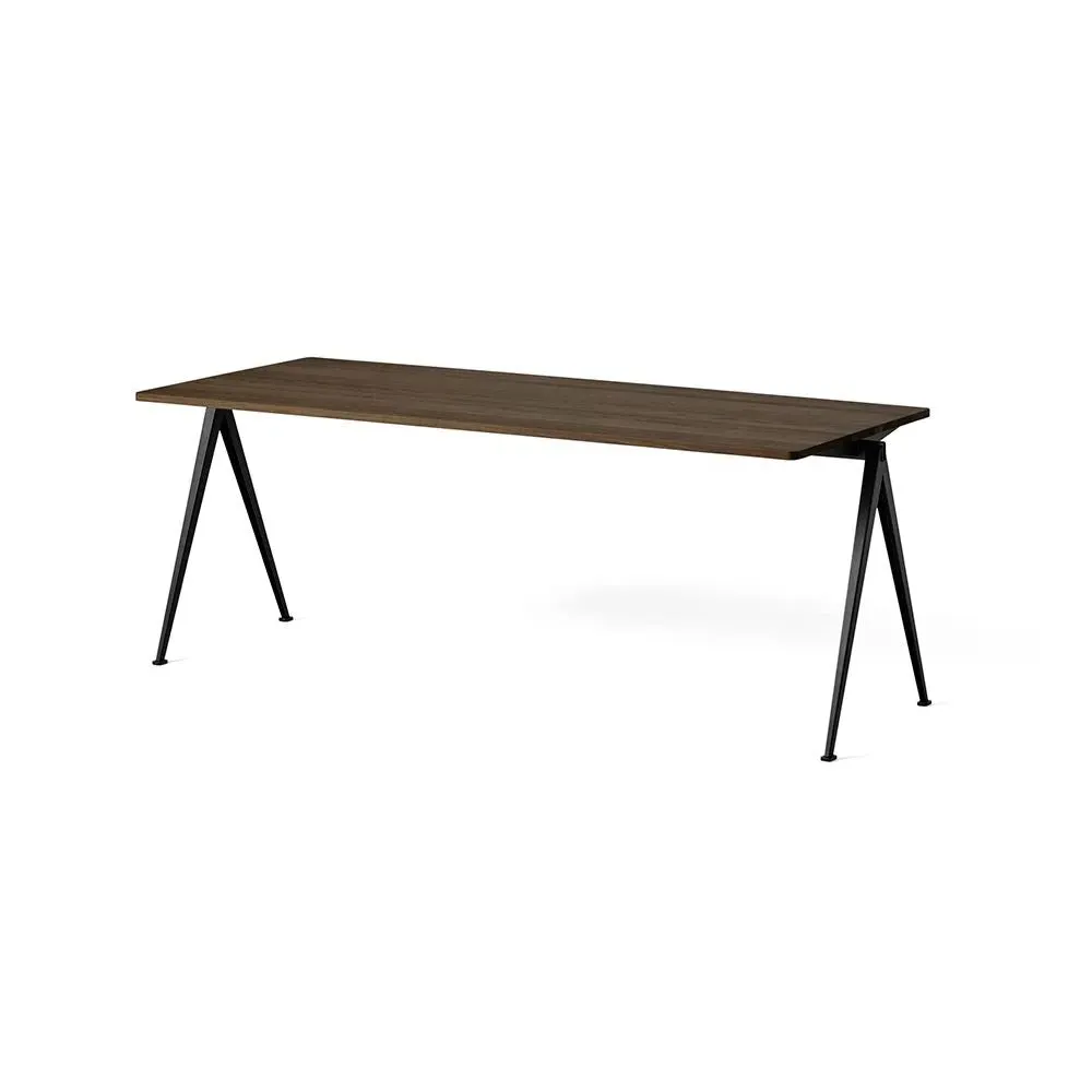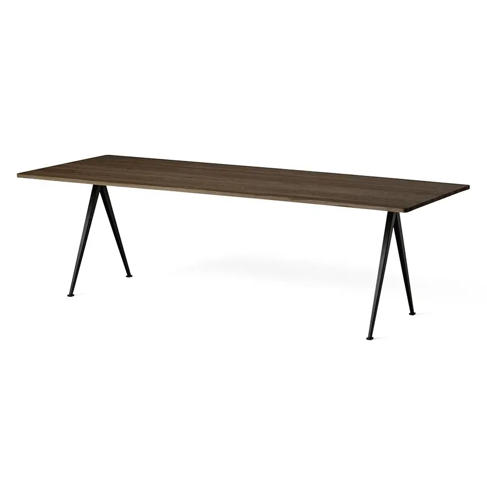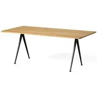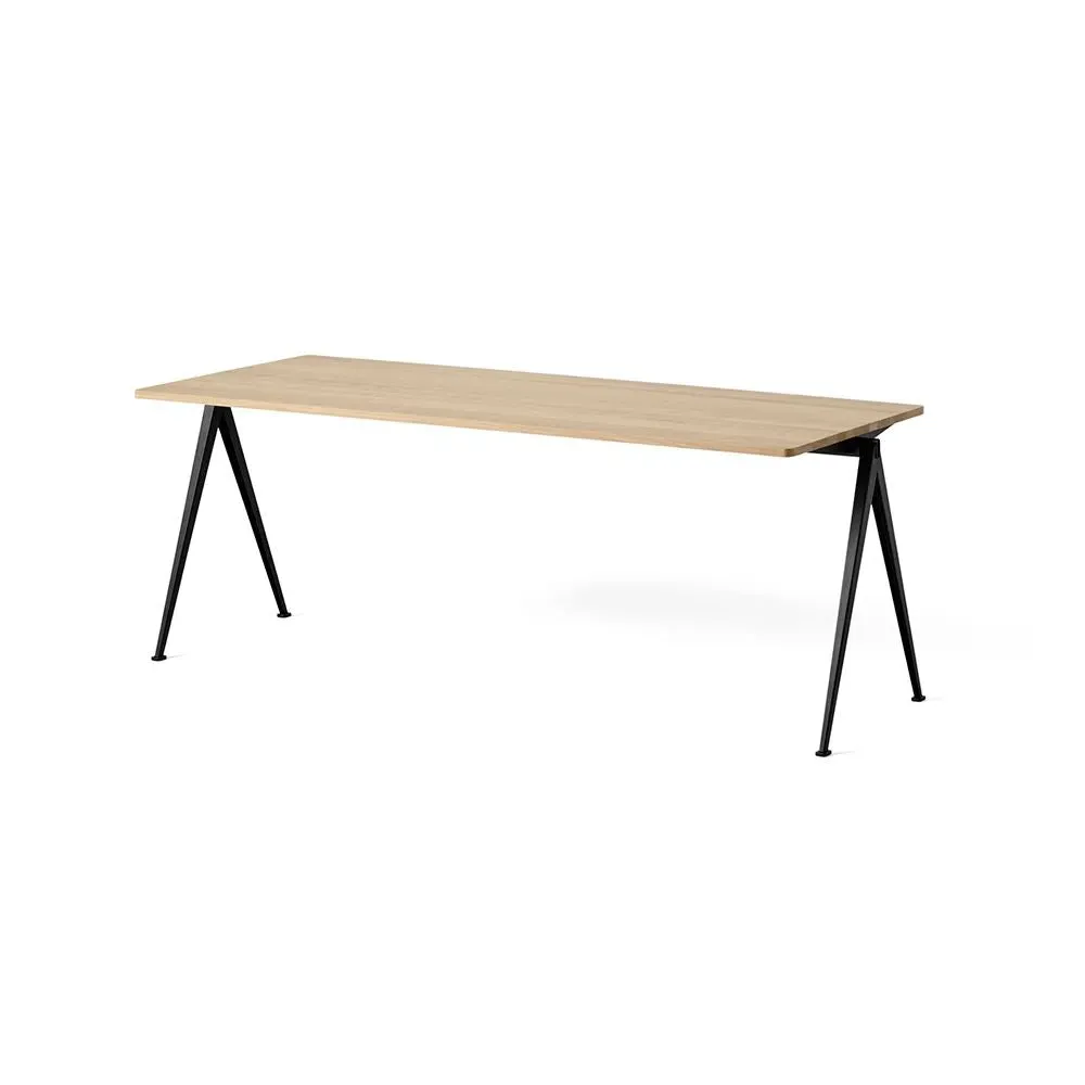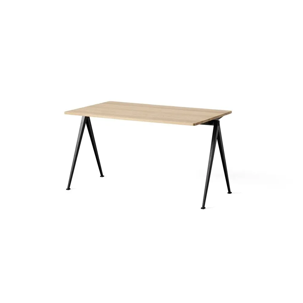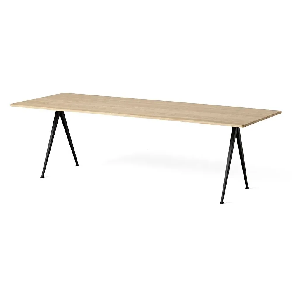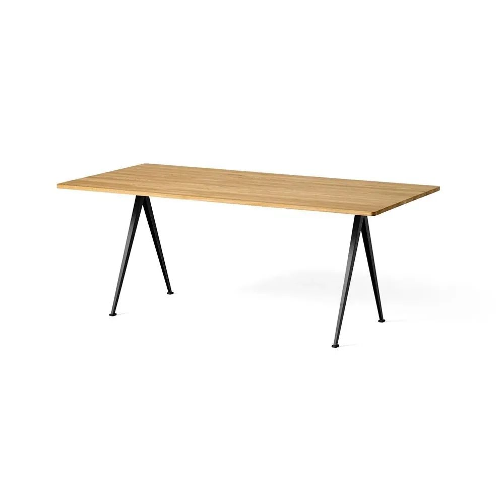 The Pyramid table 01/02 was designed to be lightweight yet strong and functional yet aesthetic. Featuring slim steel-sheet legs and a rectangular oak top, the table€™s sparing use of materials within its simple, organic construction was an innovative triumph when it was originally released in the 1950s. Contrasting clean lines with curved corners, warm oak with cool steel, the Pyramid table 01/02 is ideal for contemporary dining rooms and offices and pairs beautifully with the Result Chair. Available in four sizes with three solid oak top finishes and two powder coated steel frame colours.
