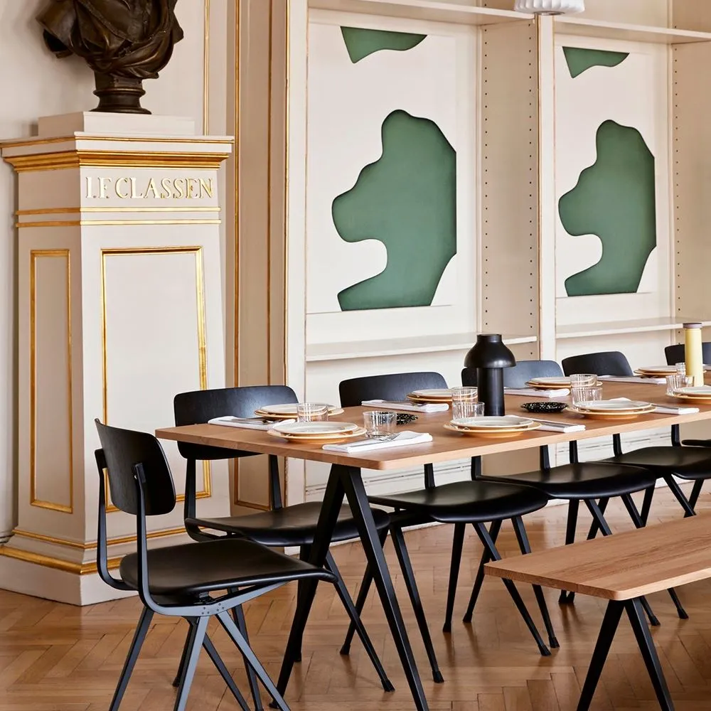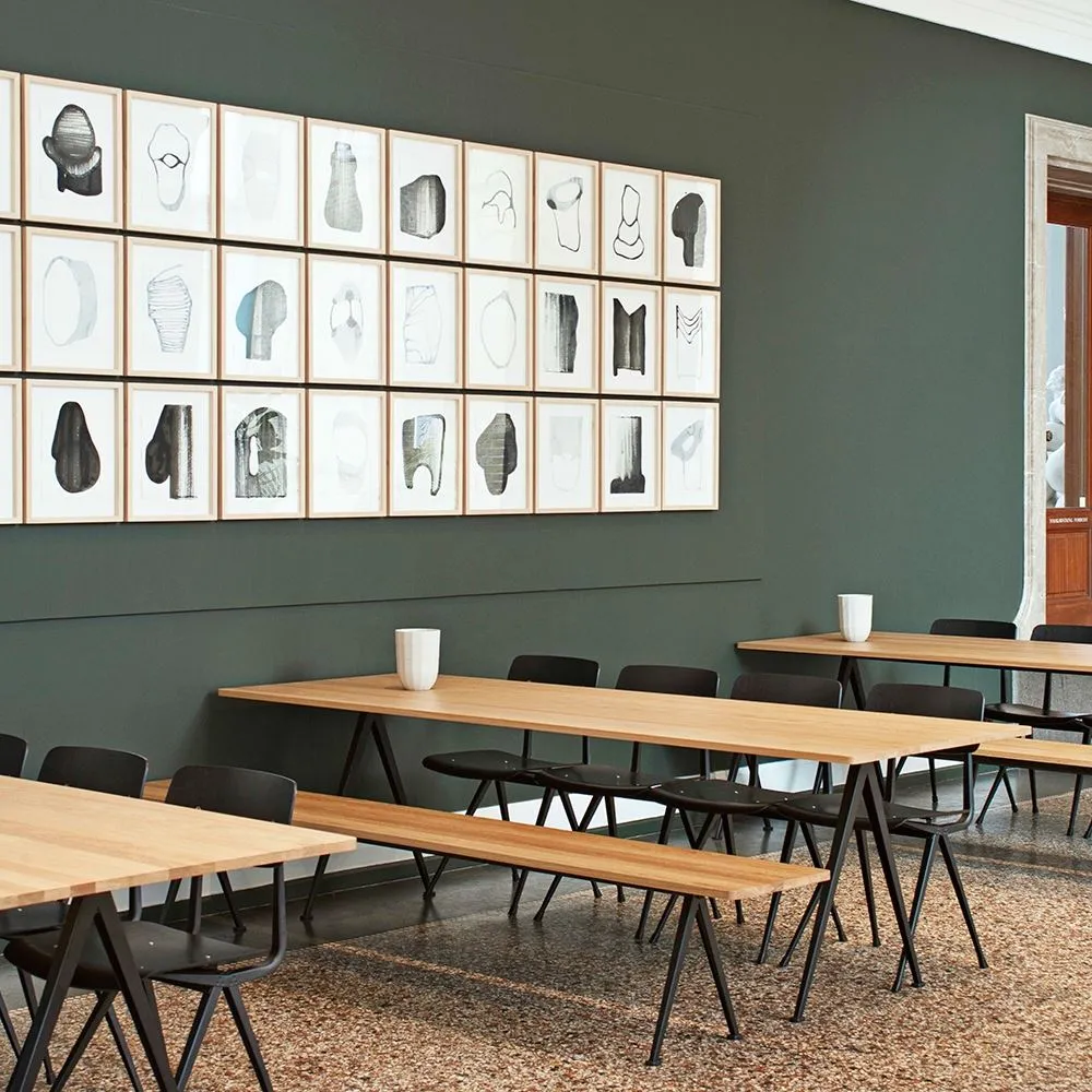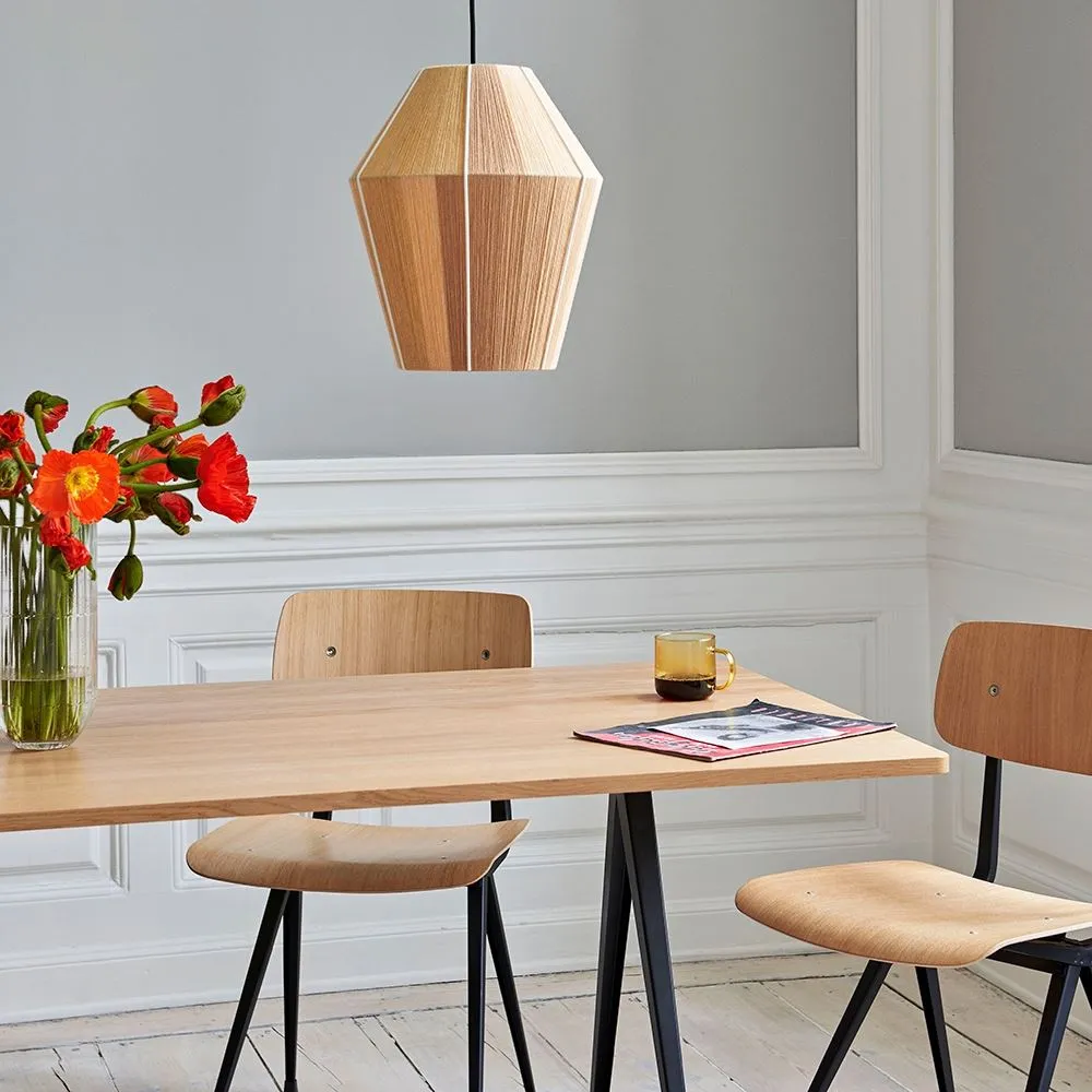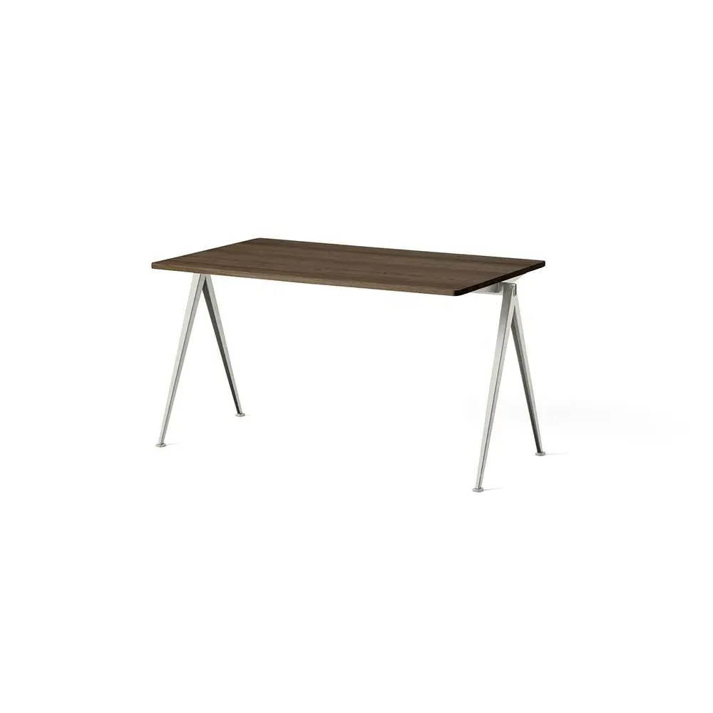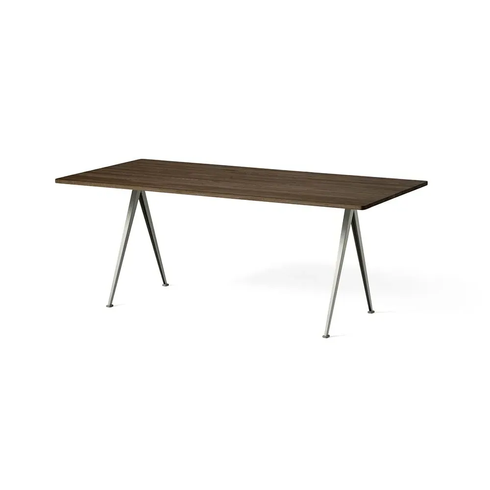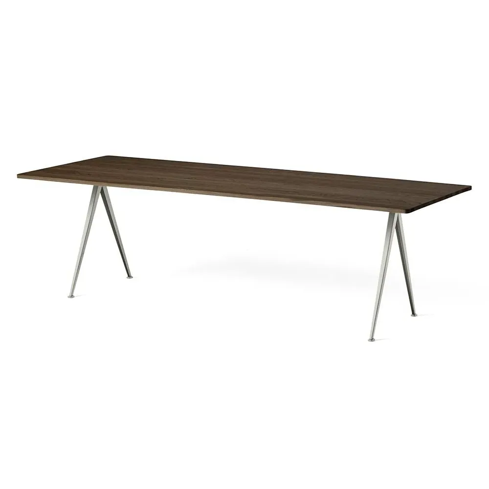 The Pyramid table 01/02 was designed to be lightweight yet strong and functional yet aesthetic. Featuring slim steel-sheet legs and a rectangular oak top, the table€™s sparing use of materials within its simple, organic construction was an innovative triumph when it was originally released in the 1950s. Contrasting clean lines with curved corners, warm oak with cool steel, the Pyramid table 01/02 is ideal for contemporary dining rooms and offices and pairs beautifully with the Result Chair. Available in four sizes with three solid oak top finishes and two powder coated steel frame colours.