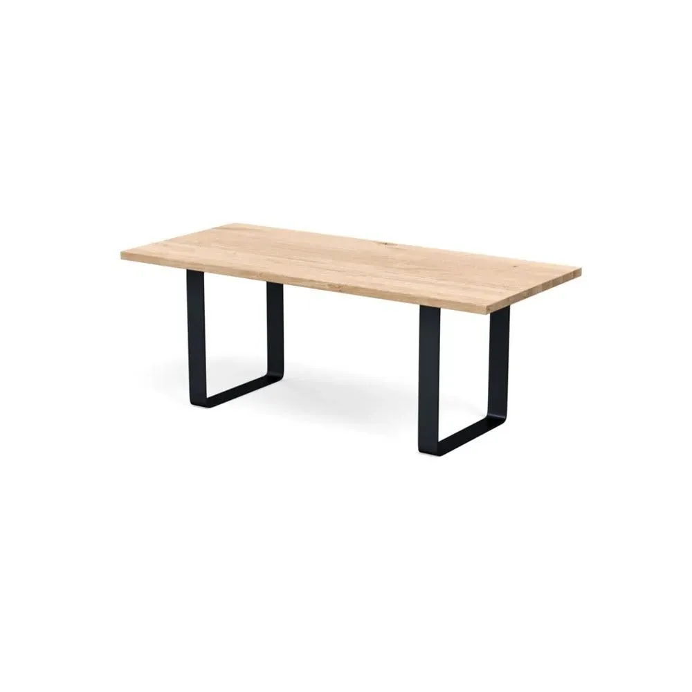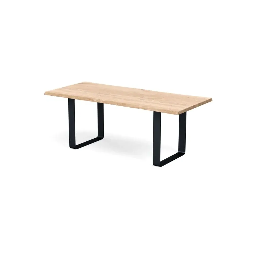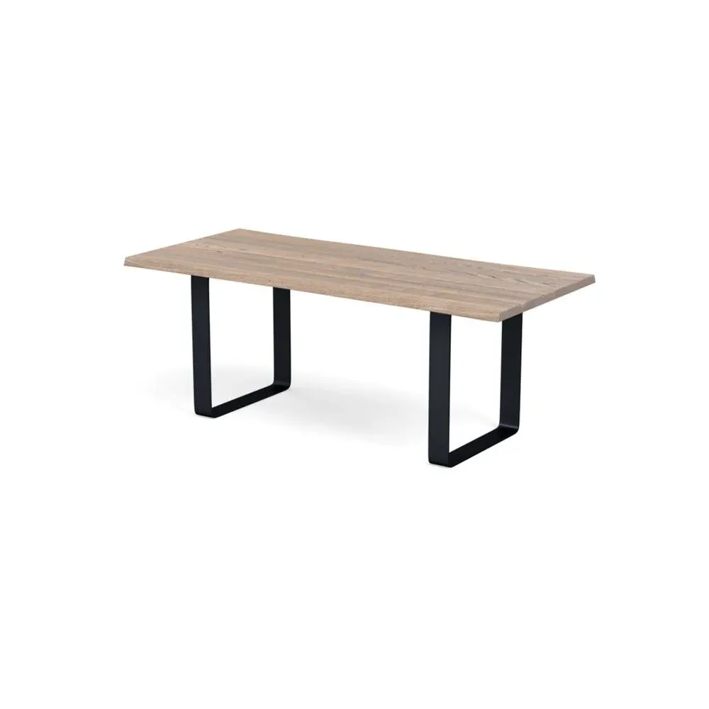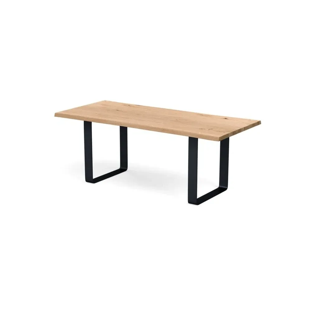 The dining table combines solid grey oak construction with a wide metal leg frame for contemporary appeal. Its oiled finish enhances the natural grain patterns and wood characteristics, while the natural edge profile adds organic character. The solid wood construction develops unique character over time, and the metal frame provides sturdy support for daily use. W160 x D90 cm