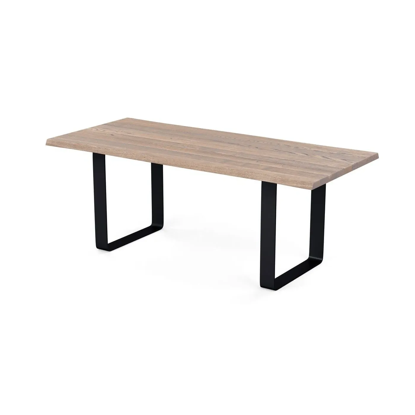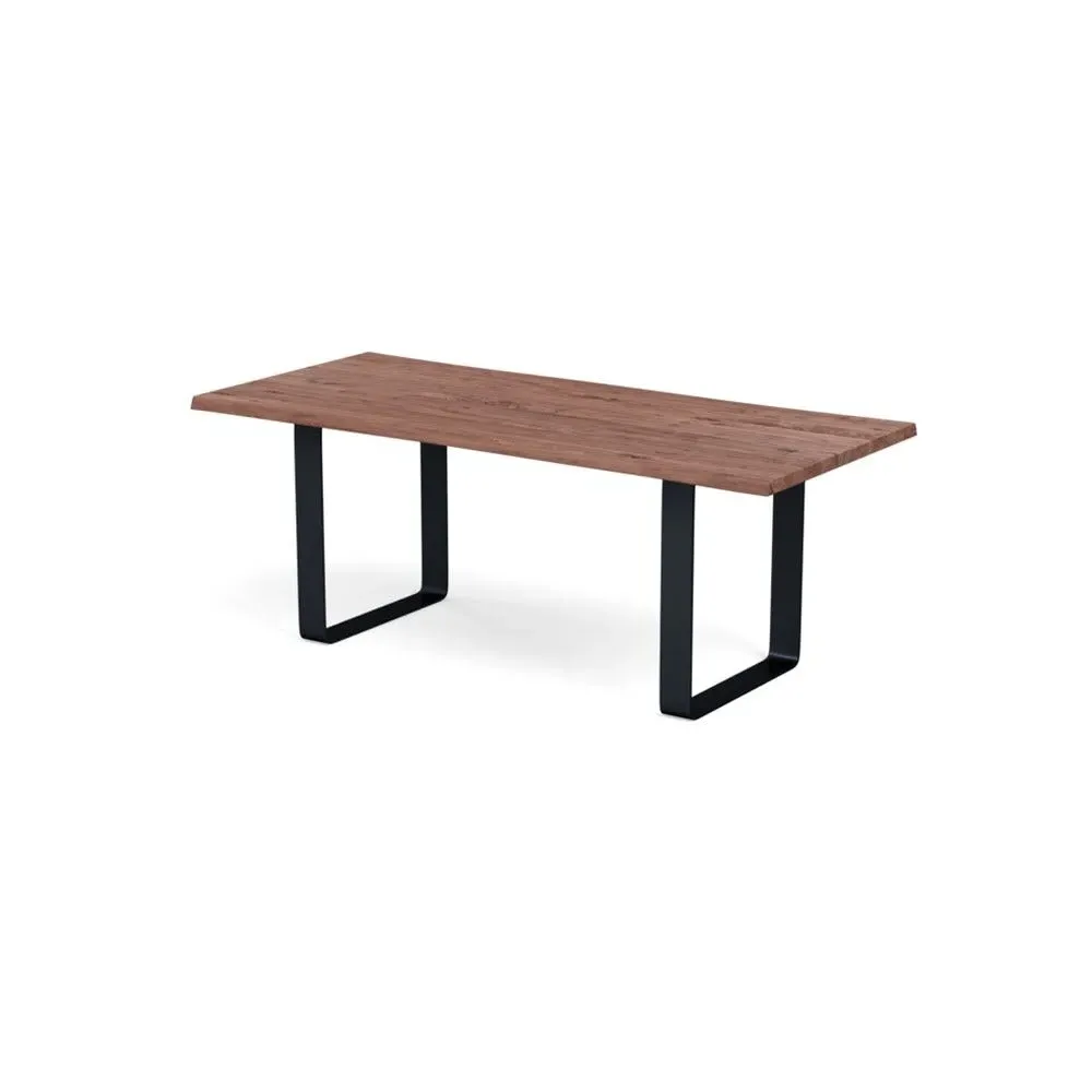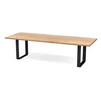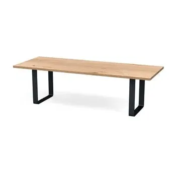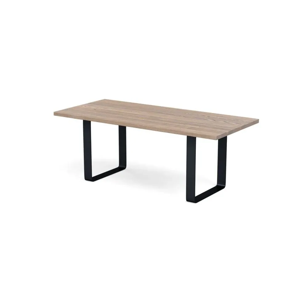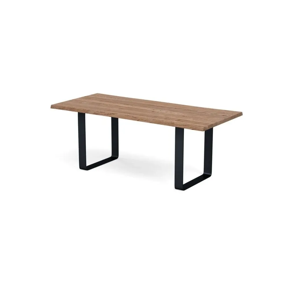 The dining table combines solid grey oak construction with a wide metal leg frame for contemporary appeal. Its oiled finish enhances the natural grain patterns and wood characteristics, while the natural edge profile adds organic character. The solid wood construction develops unique character over time, and the metal frame provides sturdy support for daily use. W160 x D90 cm