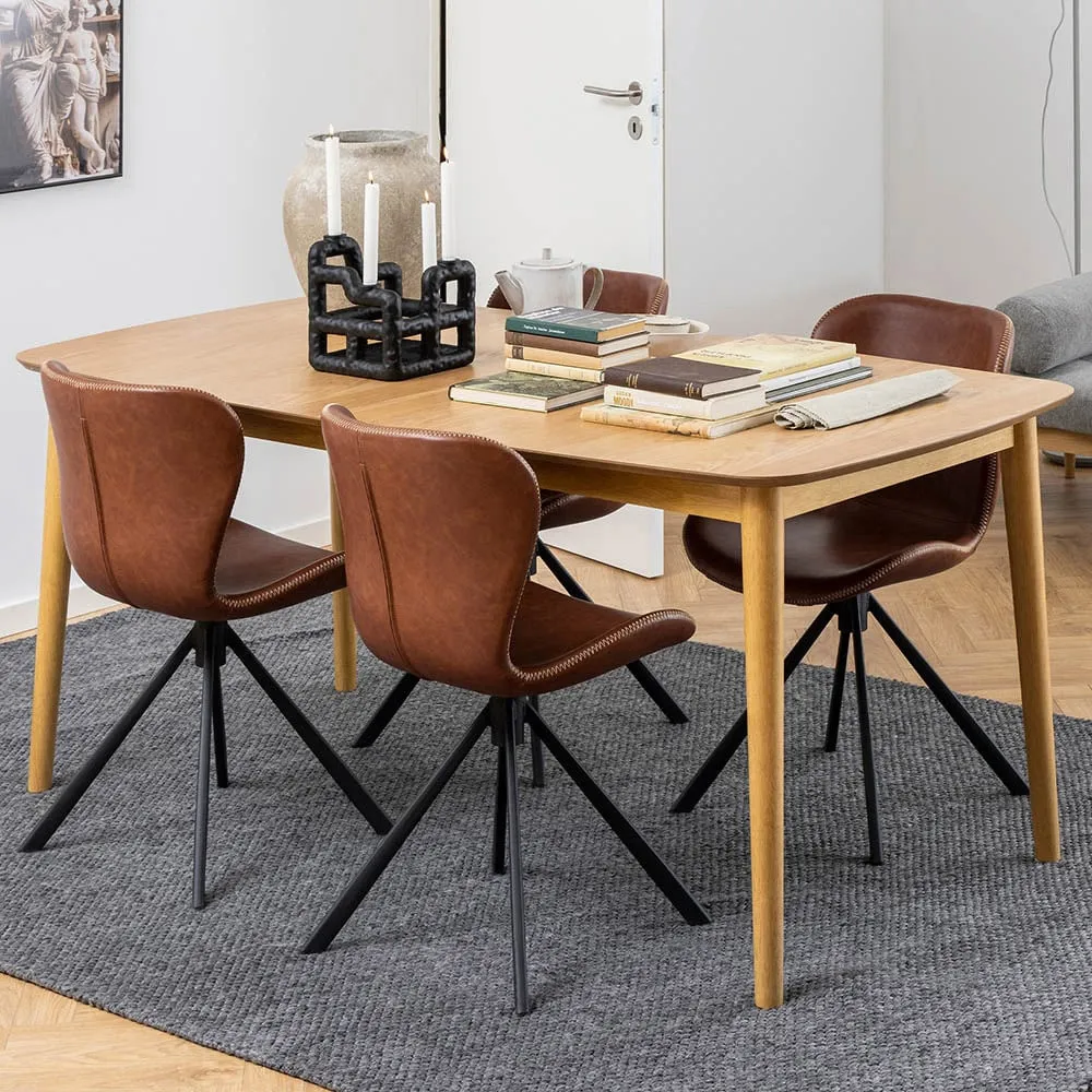 The Florence Nagano dining table features rounded corners and oiled oak veneer that embraces natural simplicity. Its smooth edges create a cosy atmosphere while comfortably seating six people. The oiled finish enhances the wood's natural characteristics, and the thoughtful proportions suit intimate dining settings.