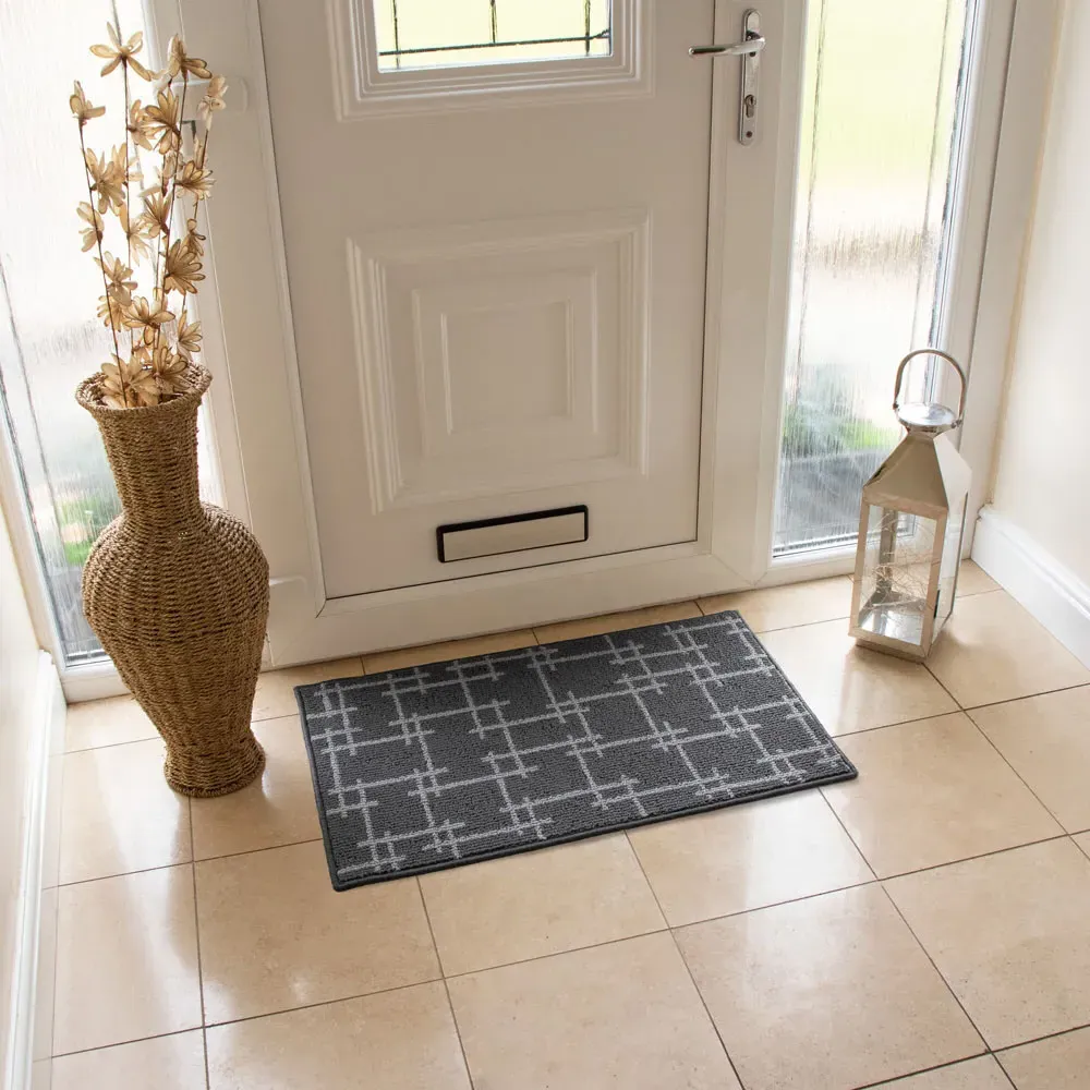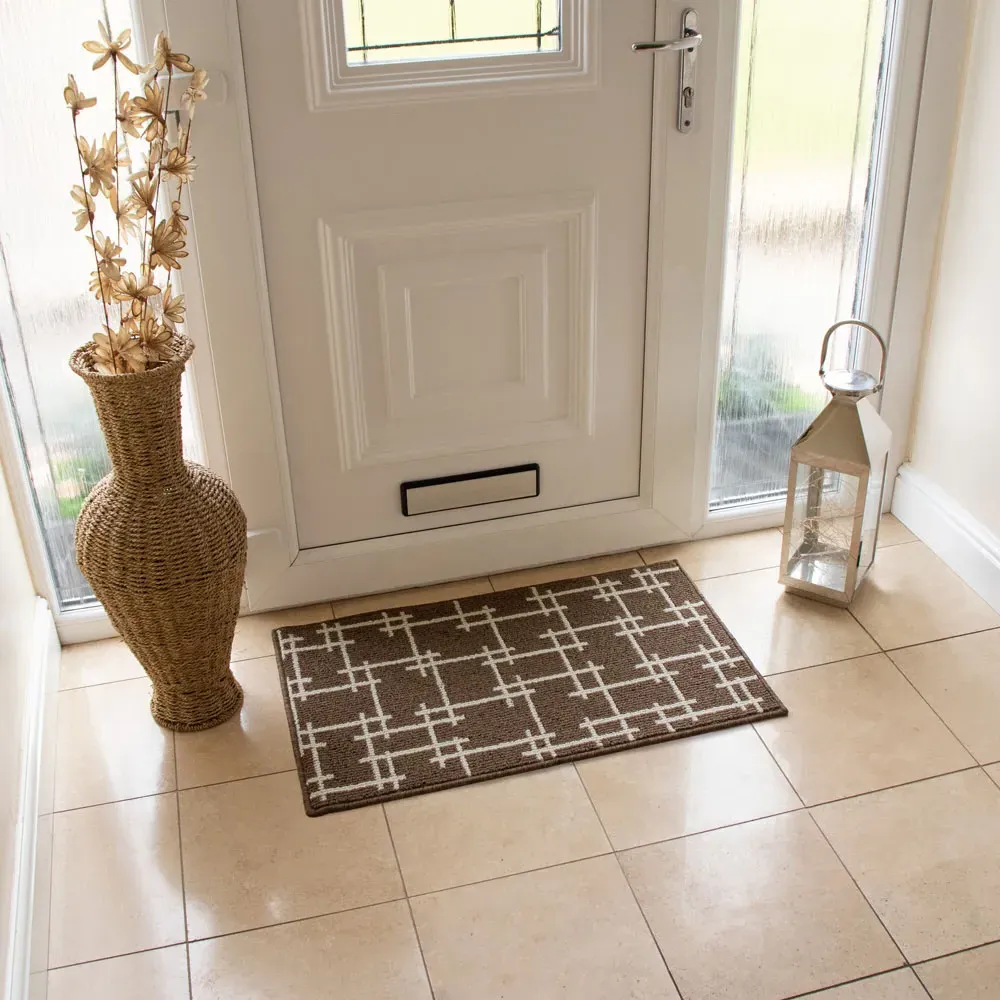 The Arona doormat provides brown striped patterns with secure latex backing to prevent movement. Its absorbent fibres collect moisture and debris while protecting underlying flooring surfaces. The machine washable feature maintains cleanliness at 30 degrees, and the durable construction suits various floor types. W40 x D60 cm.