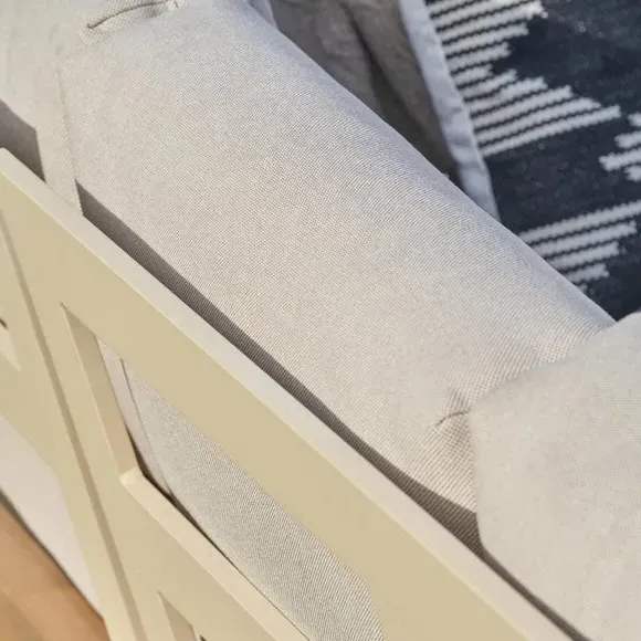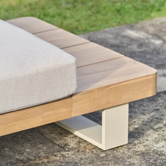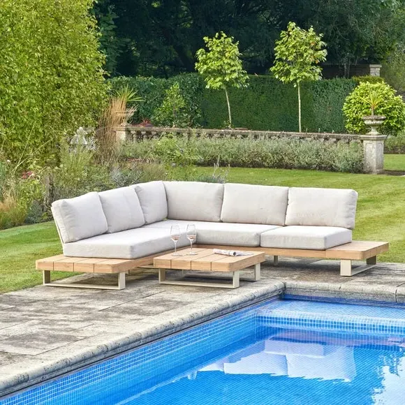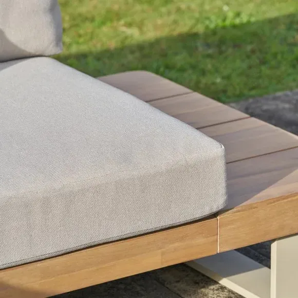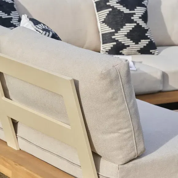 * 1 x Table and 1 x Corner Sofa* Acacia wood frame* Linen fabric* Season-proof Crafted from sustainable acacia wood with a light teak finish, this set combines style with sustainability. The light linen natural cushions offer supreme comfort, while the latte-coloured frame complements the modern design, featuring an extended base that doubles as side tables for your drinks. The low-maintenance, durable aluminium frame and season-proof cushions make it the perfect choice for long-lasting outdoor relaxation. Keep it looking new with an Aerocover and enjoy a 3-Year Structural Guarantee.