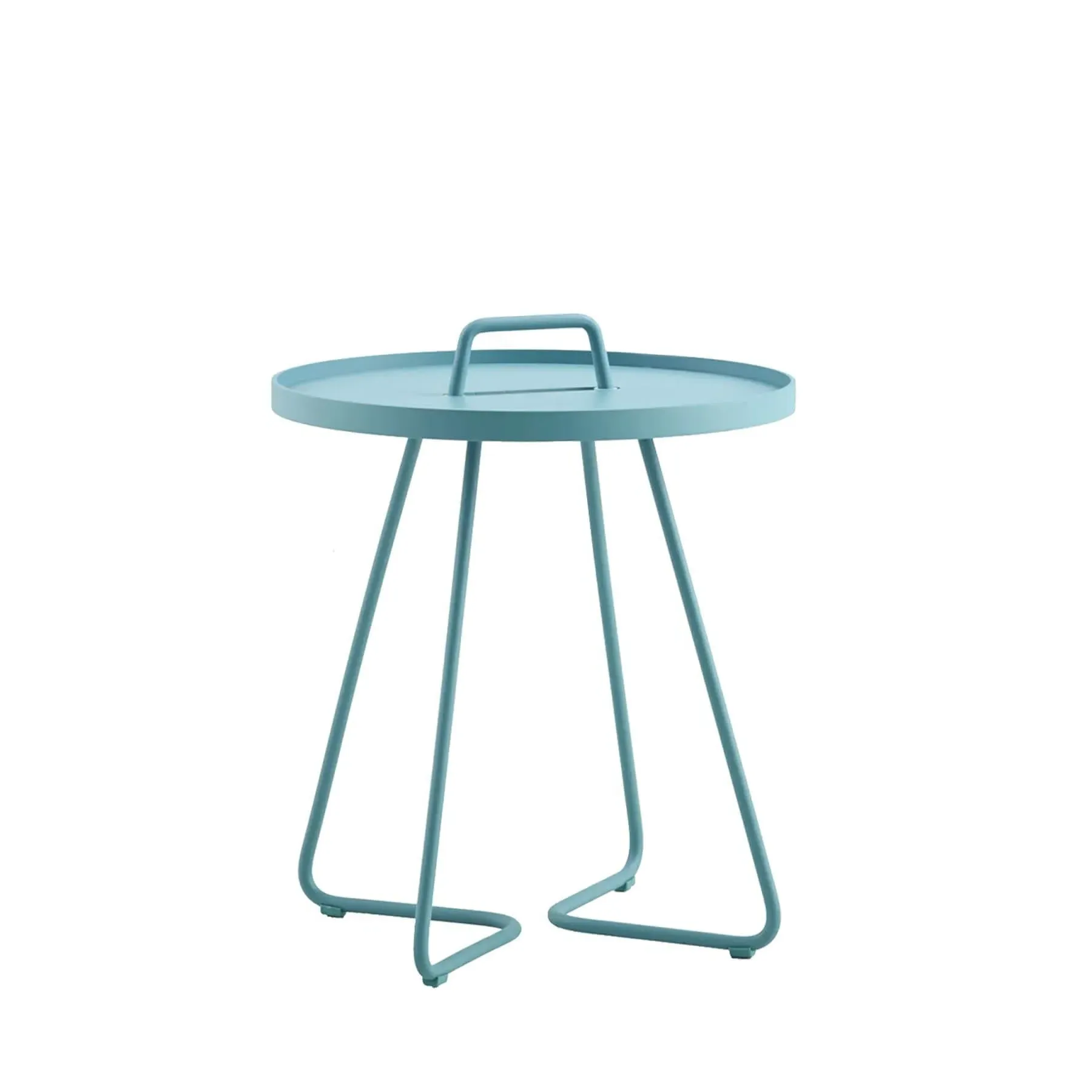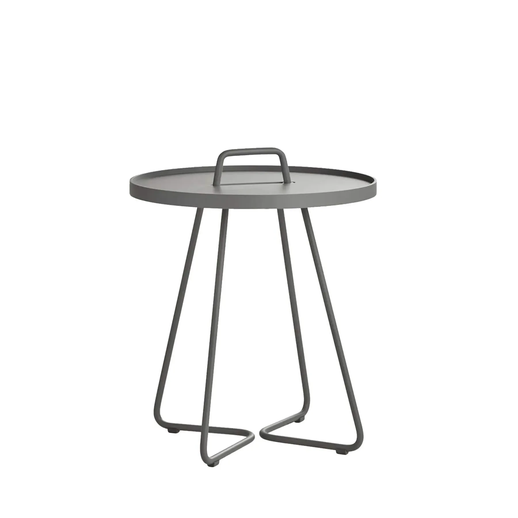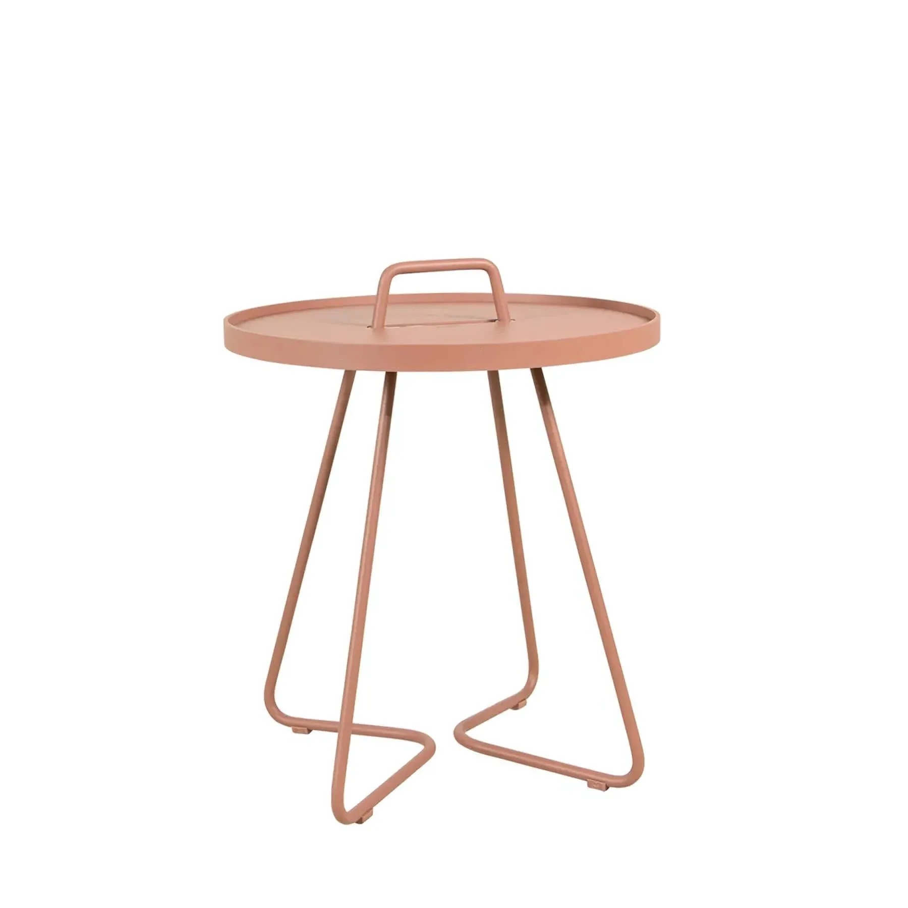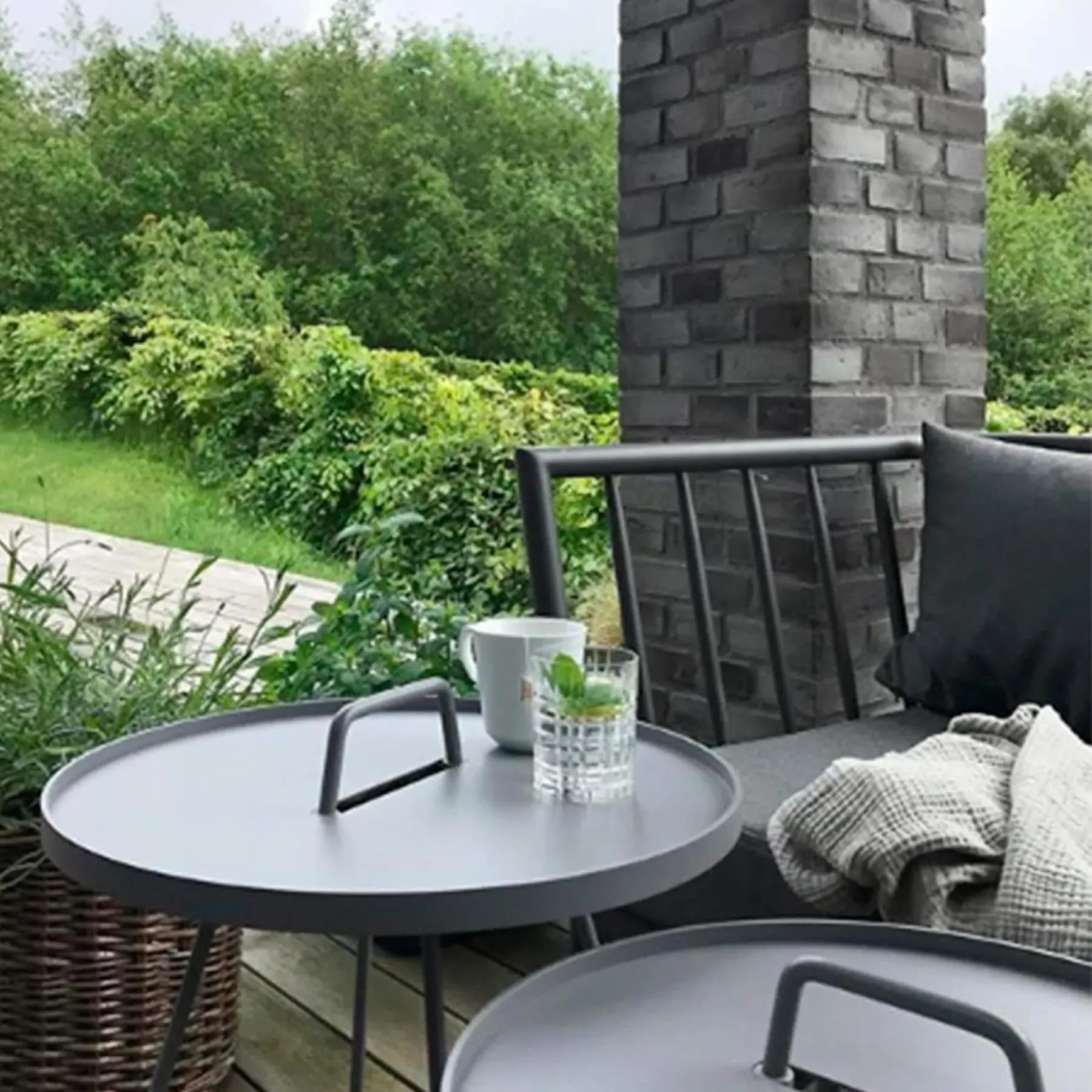 The side table combines portability with functionality through its integrated handle design. Its removable countertop converts the piece from a side table to a serving tray, while the powder-coated aluminium construction provides weather resistance and minimal maintenance requirements. The lightweight build allows easy movement between spaces, and the durable finish ensures long-lasting performance. Dimensions: 37cm diameter.