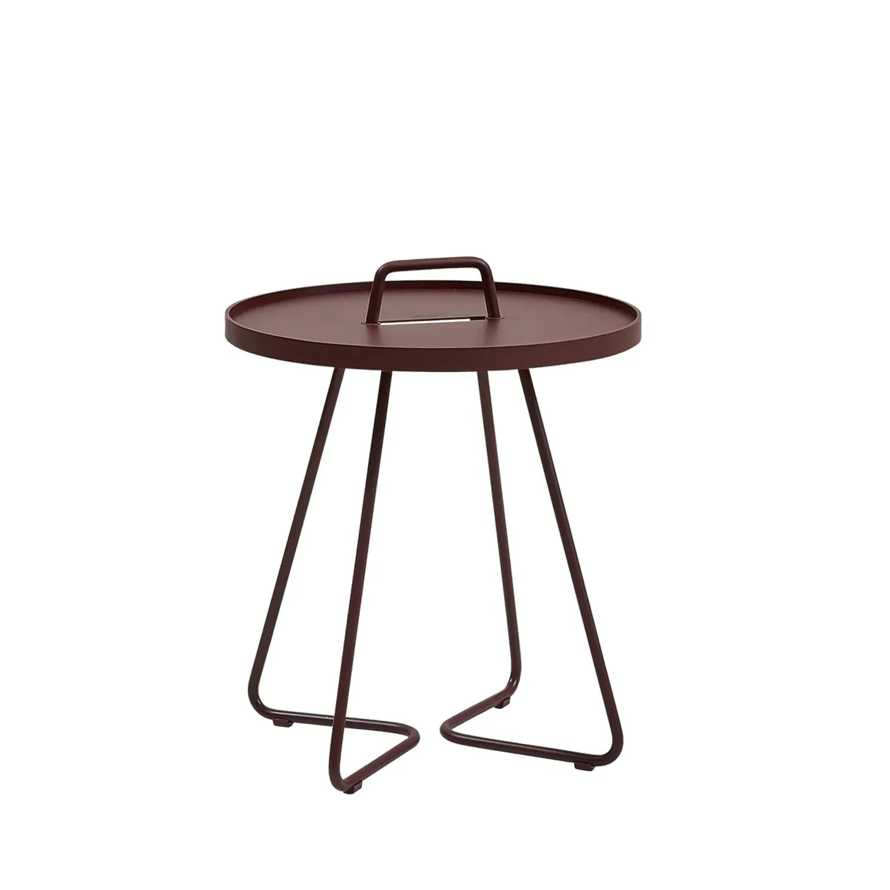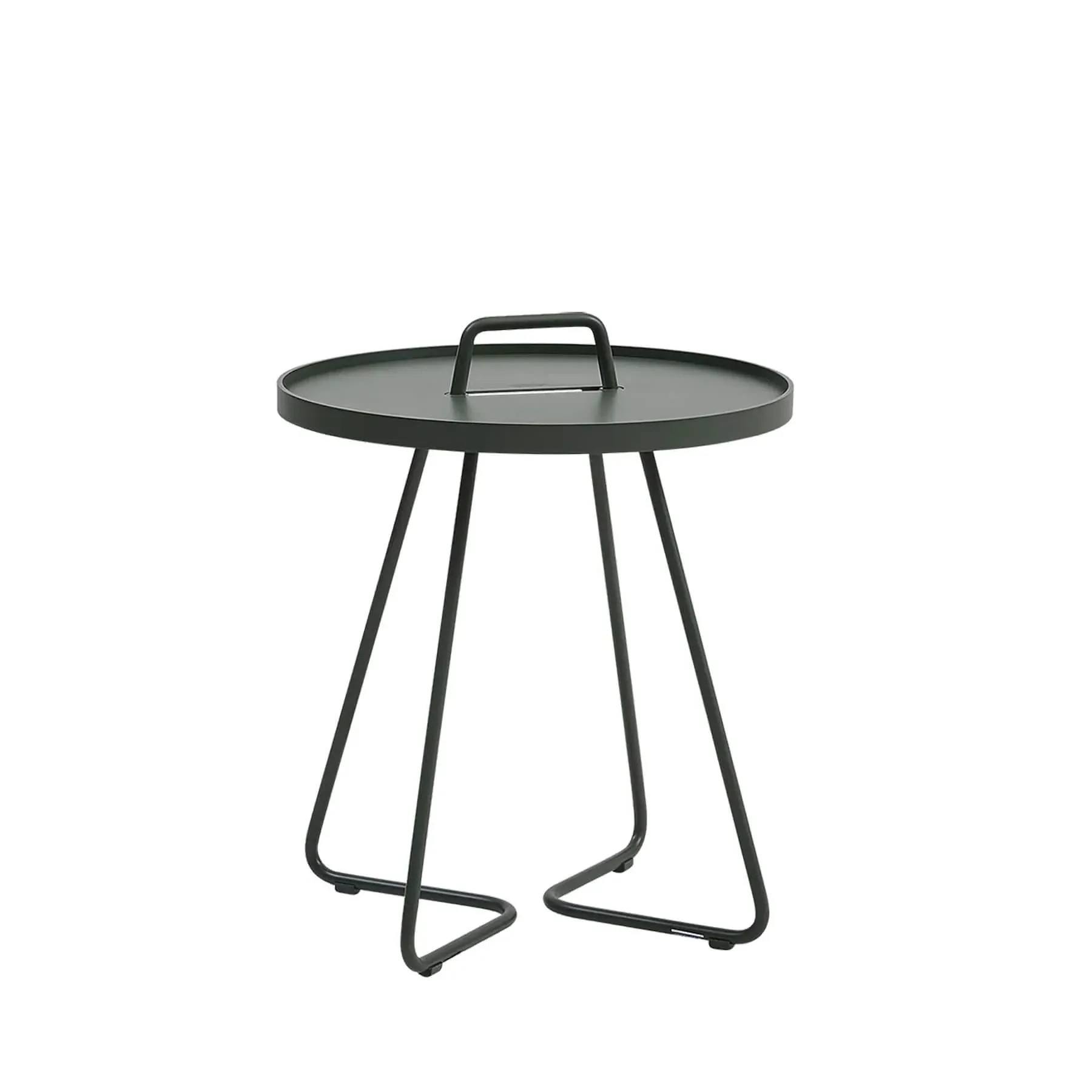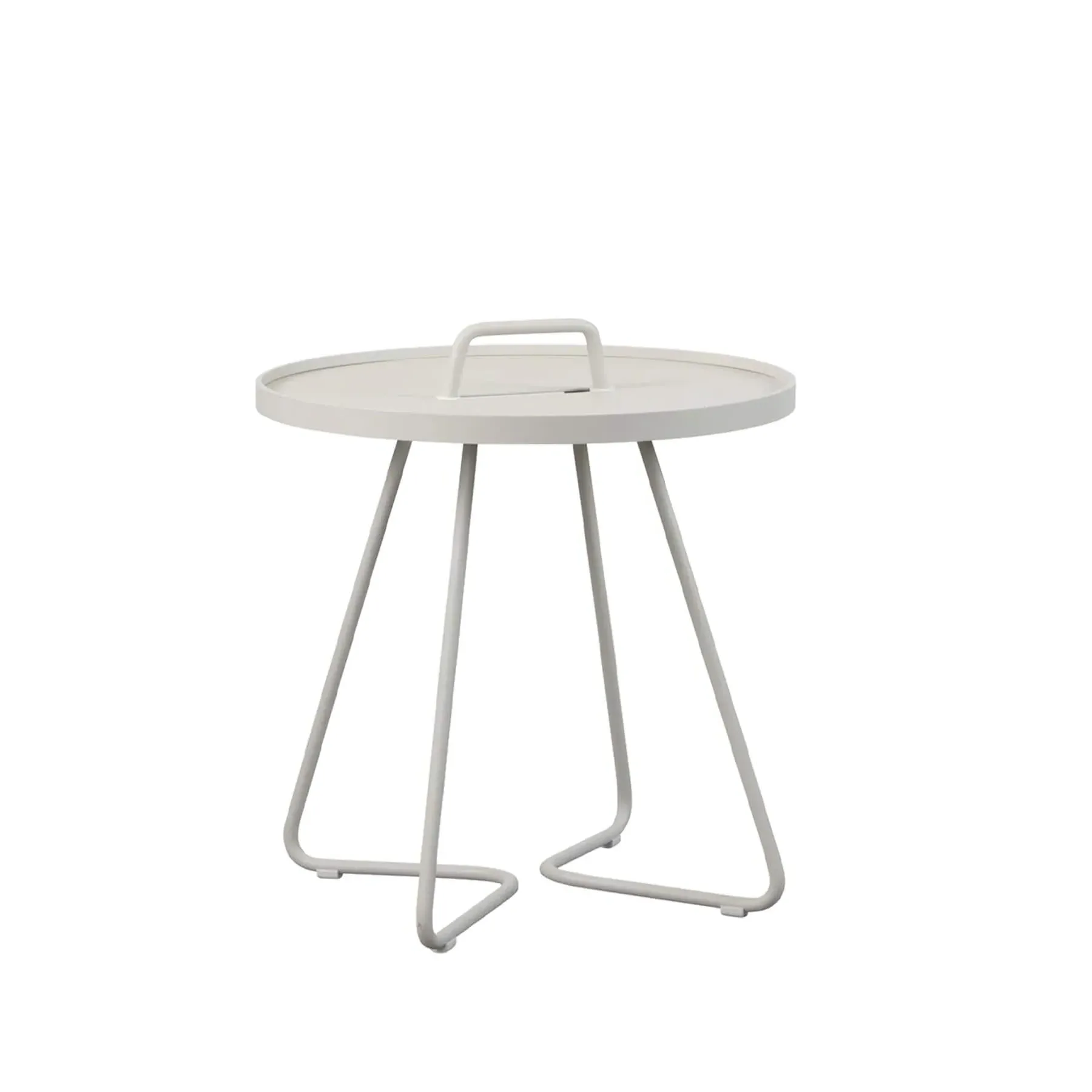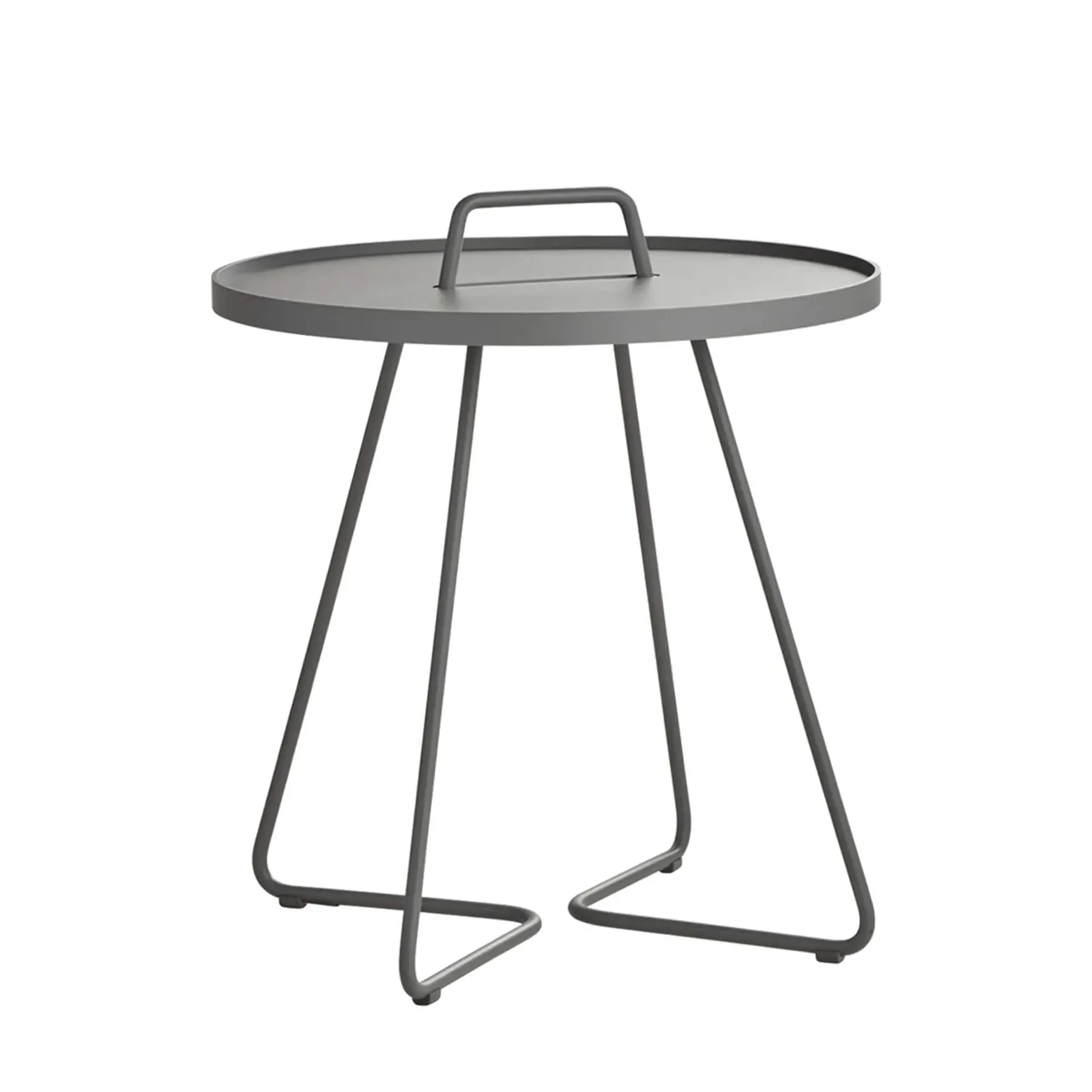 The side table combines portability with functionality through its integrated handle design. Its removable countertop converts the piece from a side table to a serving tray, while the powder-coated aluminium construction provides weather resistance and minimal maintenance requirements. The lightweight build allows easy movement between spaces, and the durable finish ensures long-lasting performance. Dimensions: 37cm diameter.