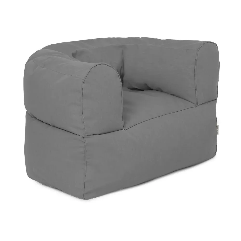 The outdoor armchair features an evolved beanbag design crafted from Sunbrella Plus coated canvas for superior weather resistance. Its water-repellent, UV-resistant, and algae-resistant construction allows for year-round outdoor placement without deterioration. The comfortable seating provides relaxed lounging while maintaining its taupe color and structural integrity through all seasons.