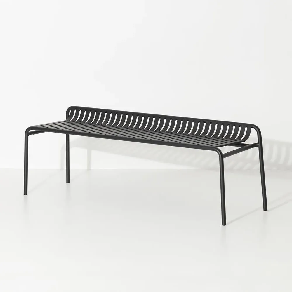 The bench combines practicality with distinctive design through its horizontal and vertical slat construction. Its oval-shaped backrest creates a graphic statement, while the striped pattern highlights contrasting full and empty spaces. The slatted framework provides ventilation and visual interest, and the sturdy construction ensures reliable outdoor durability.