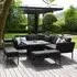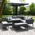 The Pulse corner dining set features a versatile rising table that adjusts from coffee to dining height for flexible outdoor entertaining. Its square configuration provides ample seating with corner design, while the charcoal fabric cushions offer comfort and weather resistance. The rattan construction ensures durability for outdoor use, and the rising mechanism allows seamless transition between casual lounging and formal dining.