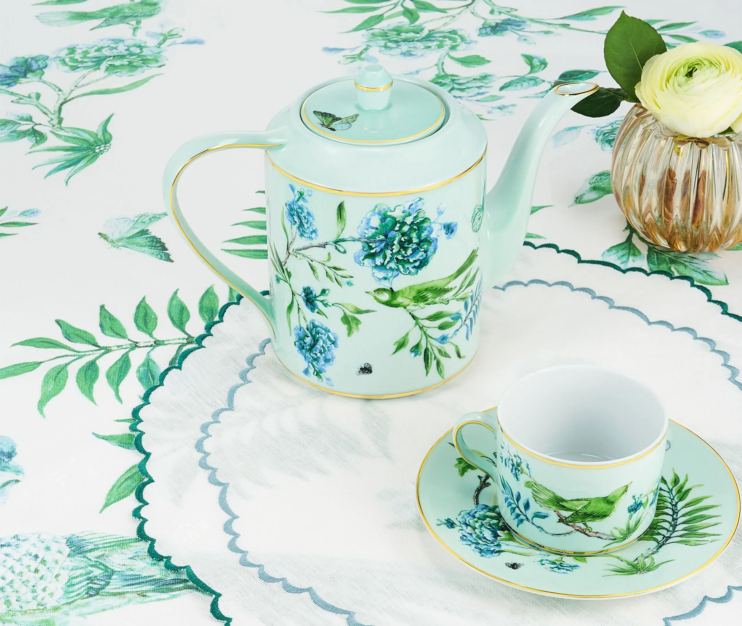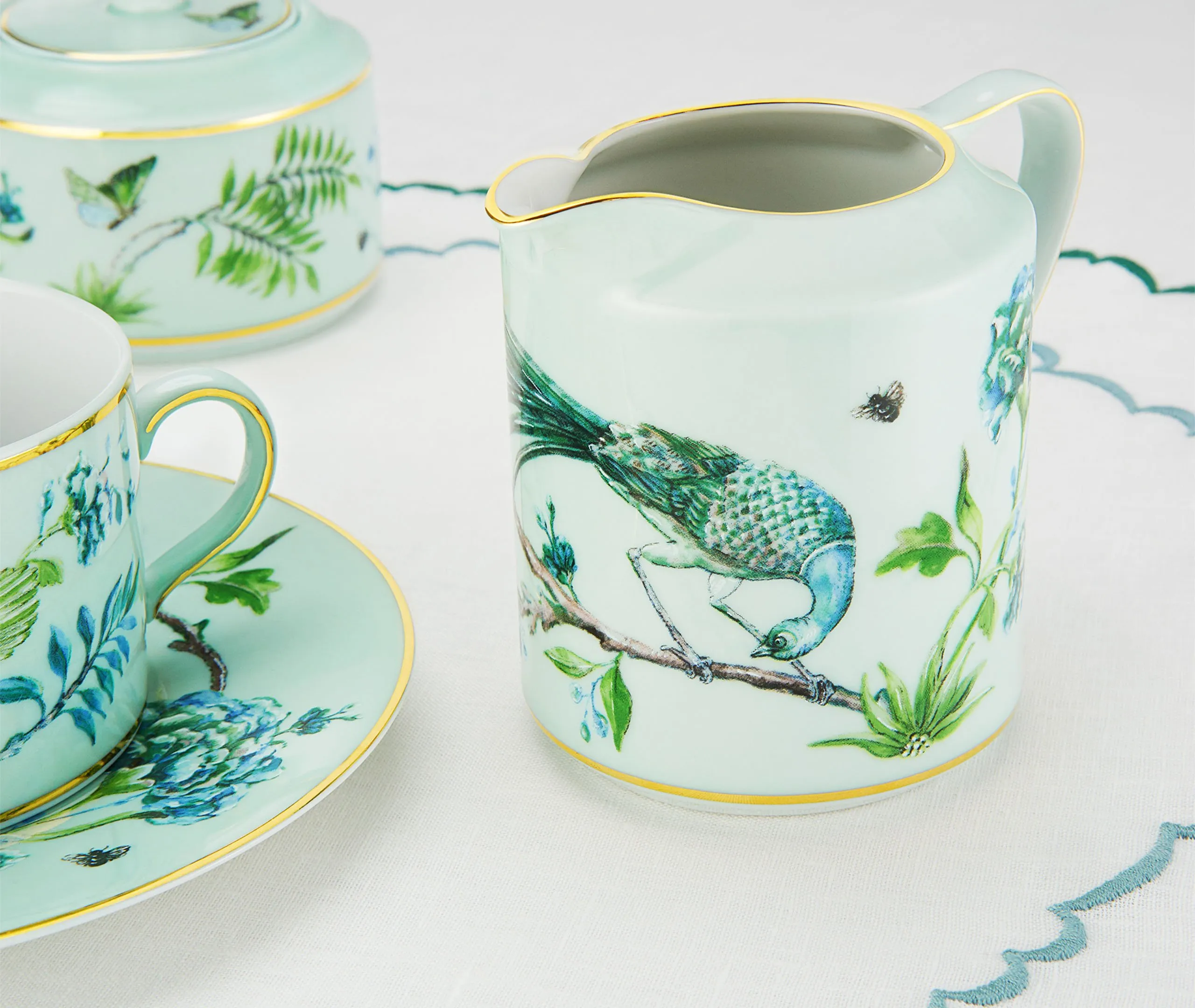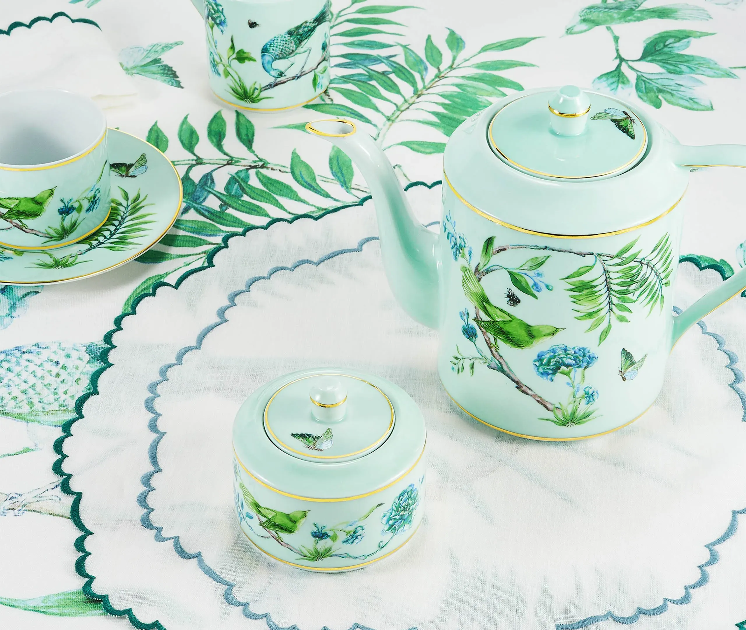 In Aquazzura Casa’s 'Secret Garden' collection, delicate boughs, blossoms, birds, bees, and butterflies coalesce in a naturalistic, ecstatic symphony. The collection includes this set of fine linen Italian-made napkins. In minute detail and finished with elegant English corners, the design can be blended with tableware from the series for a lush, abundant tablescape.