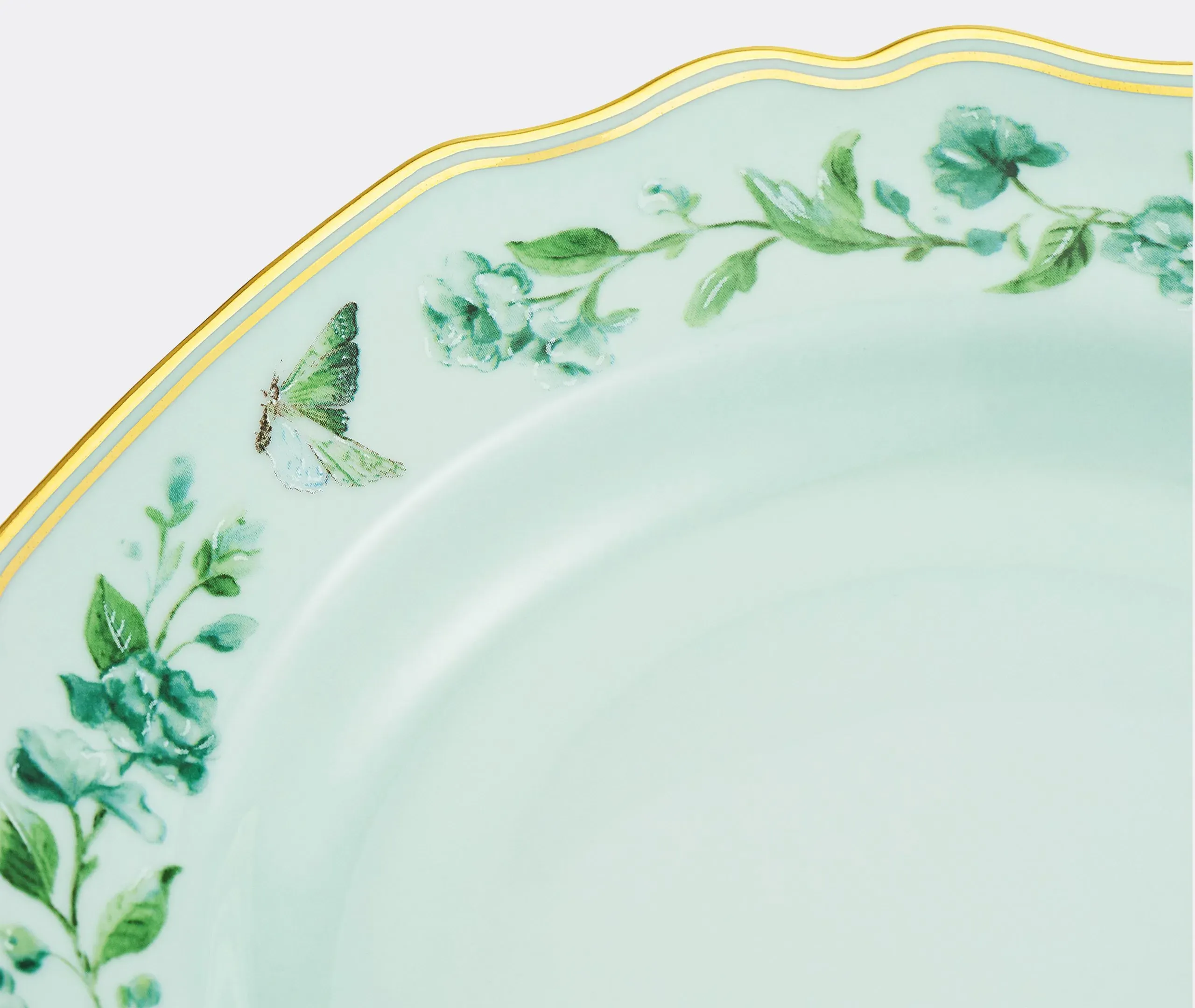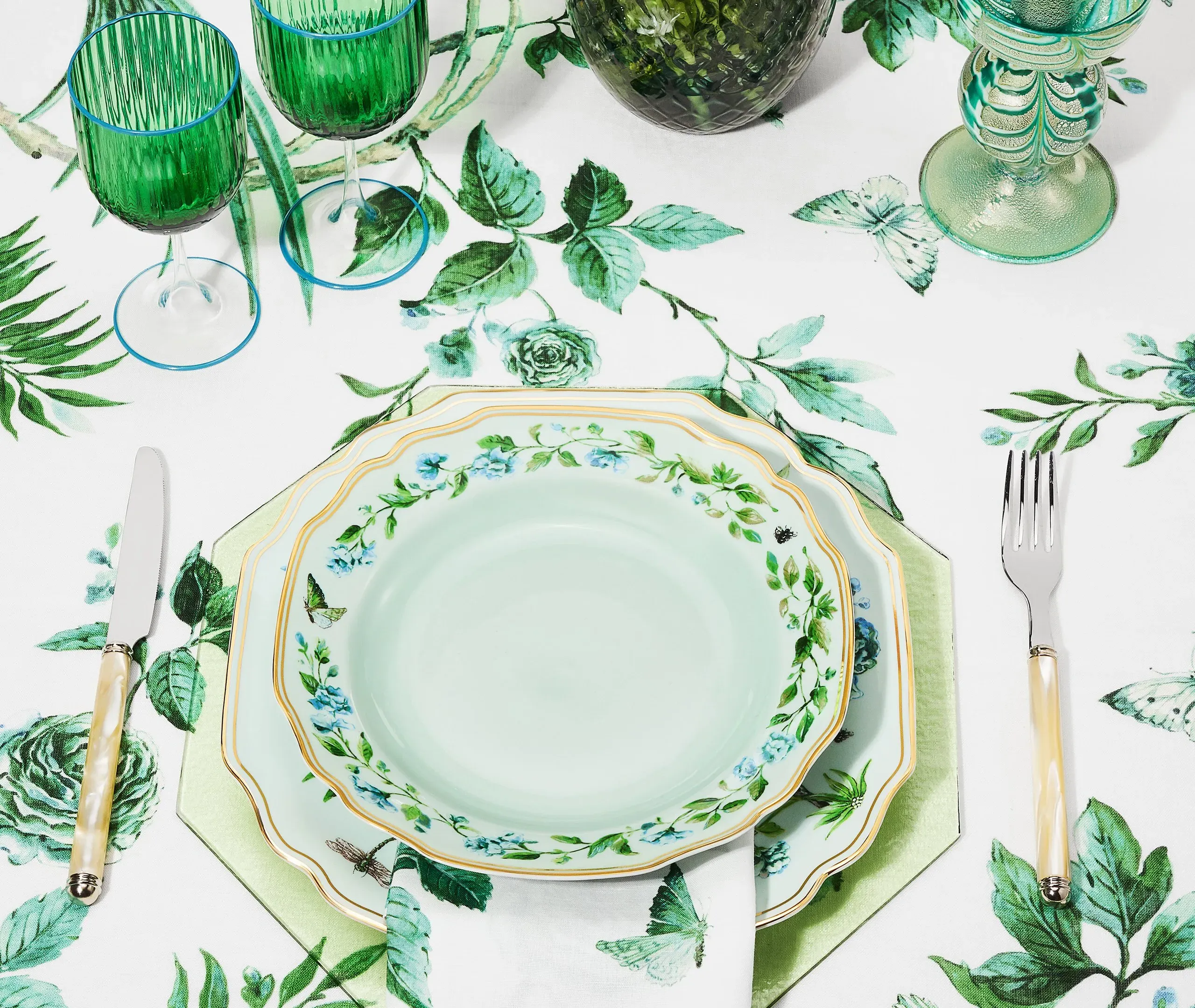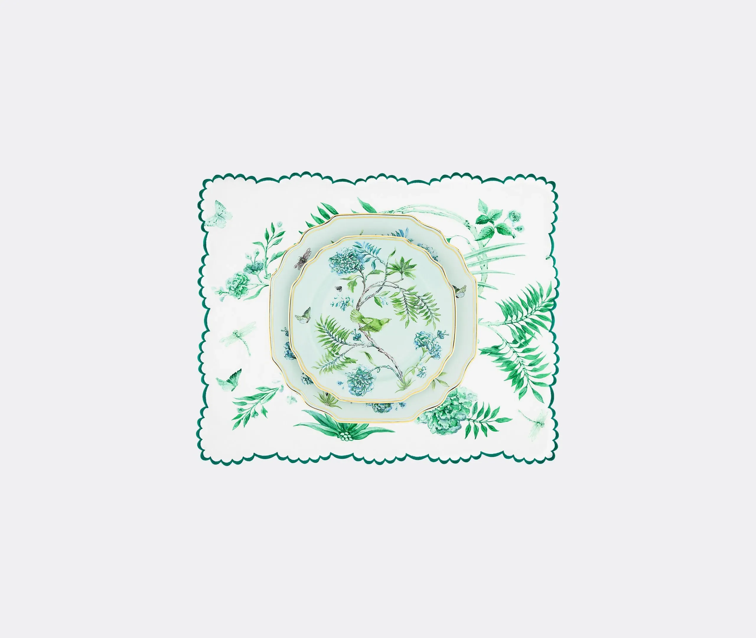 The napkin set features botanical motifs with delicate boughs, blossoms, birds, bees, and butterflies drawn in minute detail. Its fine linen construction provides durability for daily use, while the English corners add refined finishing. The naturalistic design coordinates with tableware from the collection, and the Italian craftsmanship ensures quality construction.