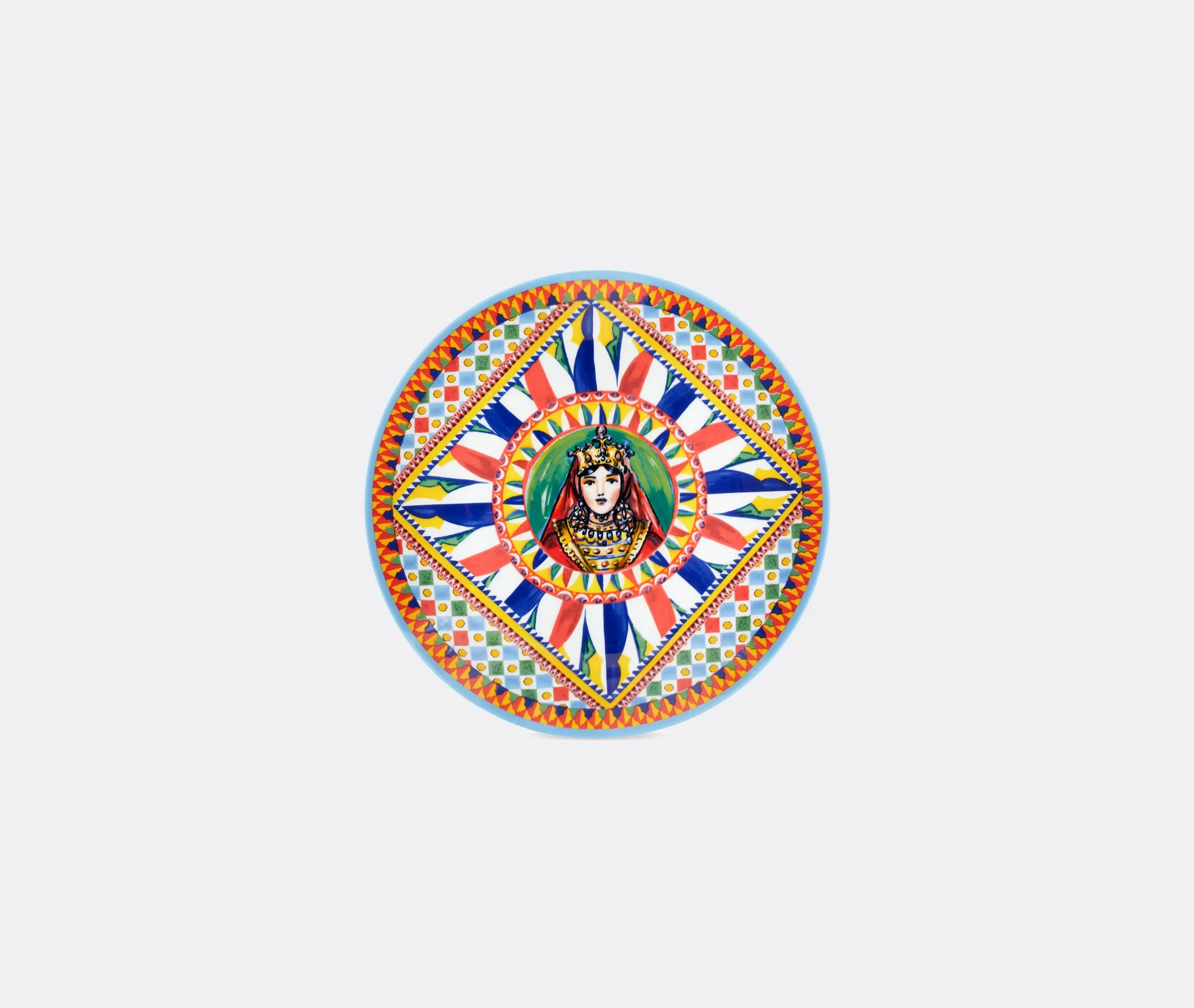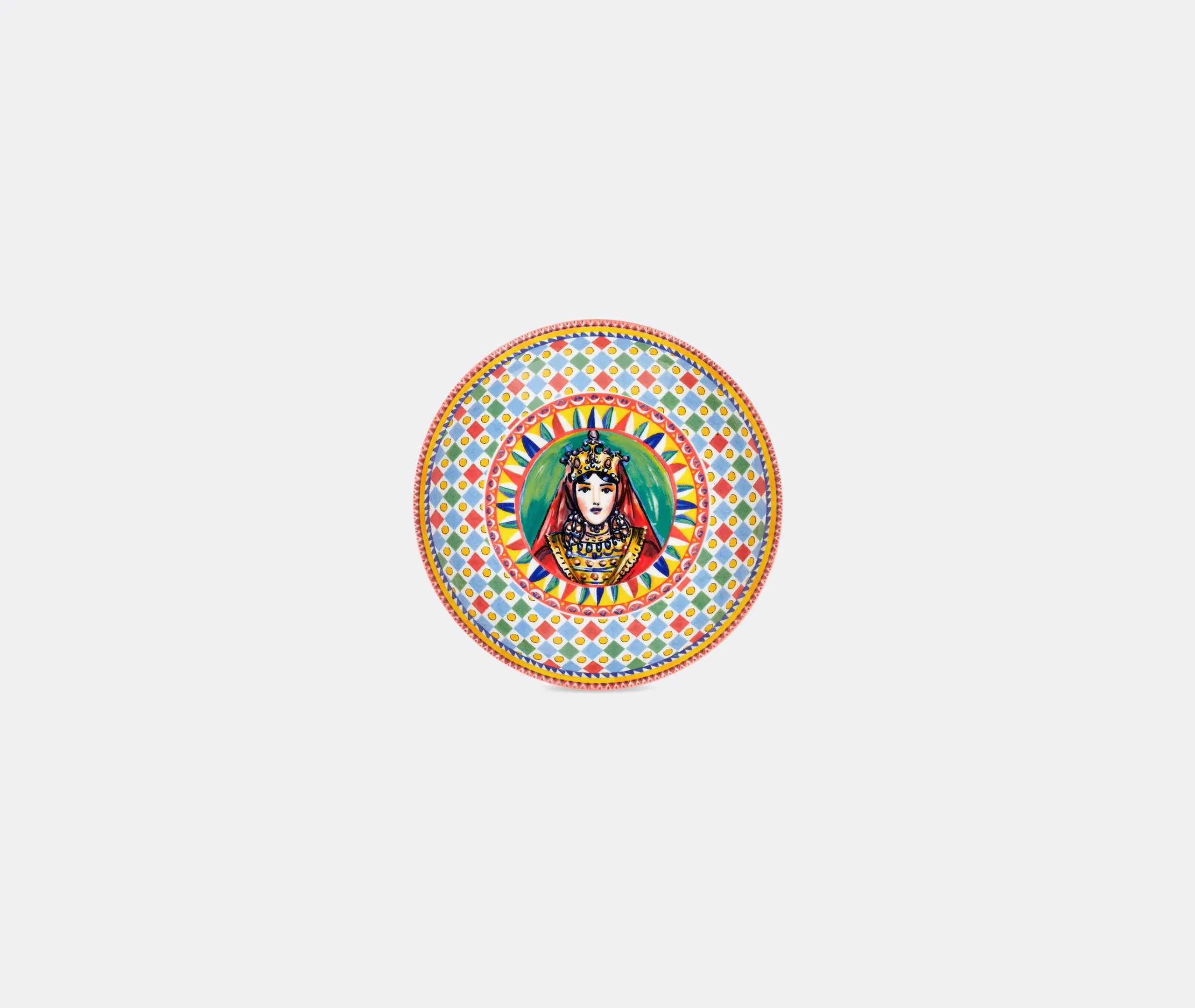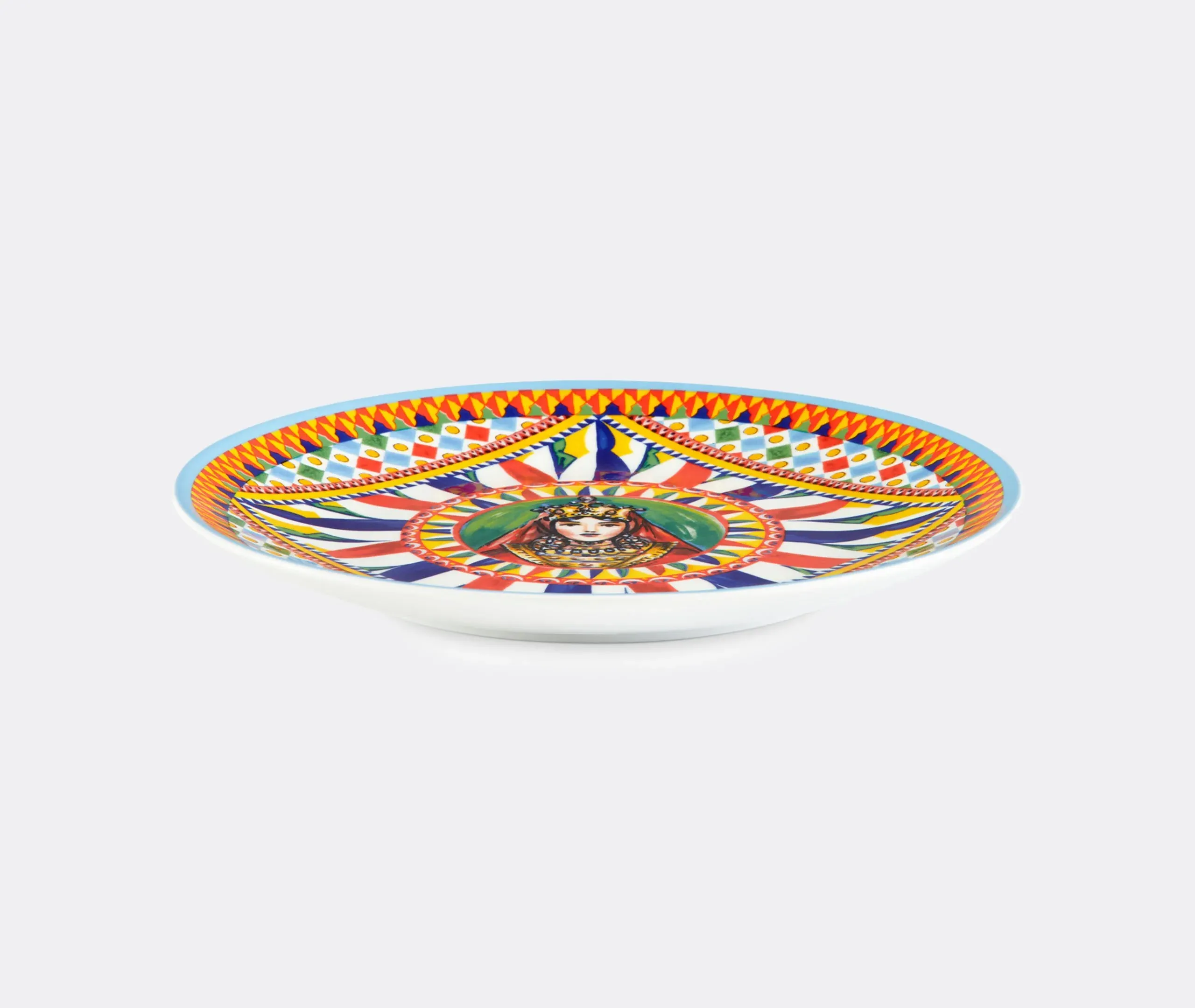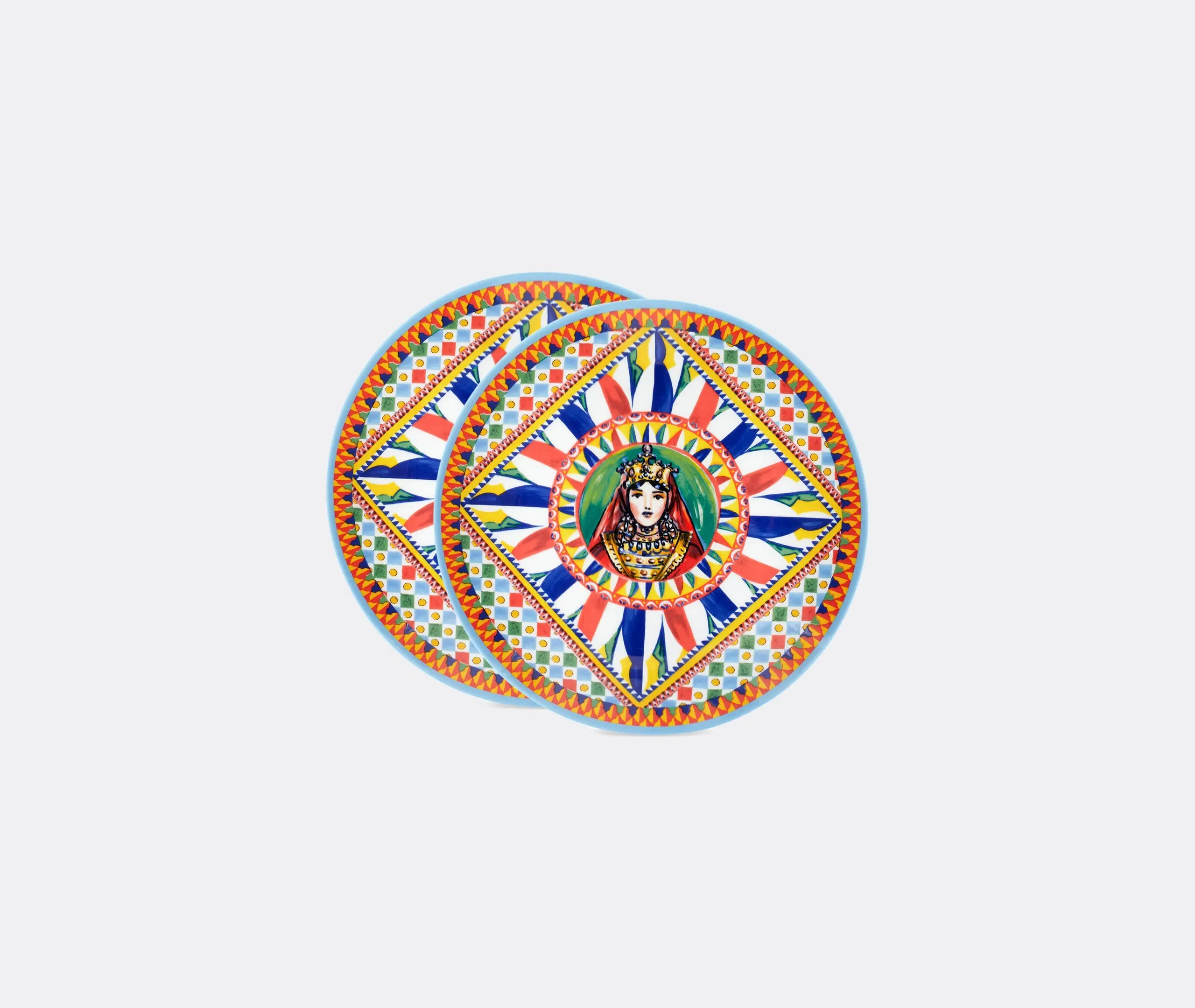 Taken from Dolce & Gabbana's ever-growing collection, this set of two dessert plates fully encapsulates the brand's ongoing celebration of its homeland of Sicily. Drawing from an archival foulard print, inspired by a celebration of the 'Carretto Siciliano' and its links to the island's traditions, craftsmanship and landscapes, the plates stand out for a slightly raised rim upon which a multicolored motif is applied and sealed with a clear glaze. The result is a standout table accent that is resistant to scratches and abrasions, and which can be mixed and matched with other pieces from the collection.