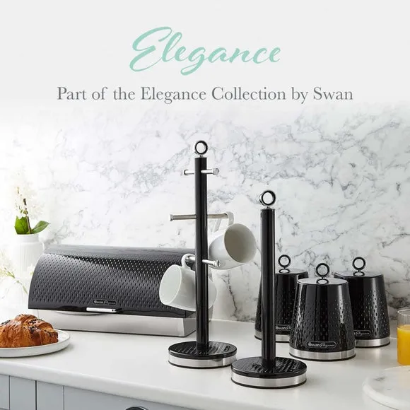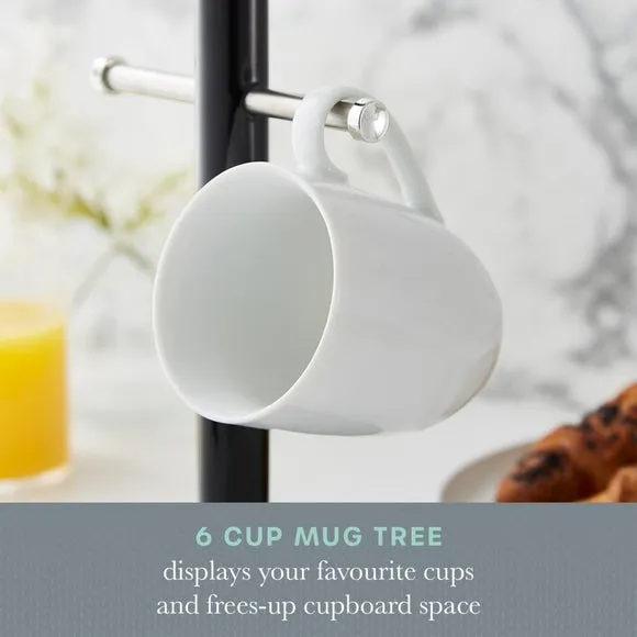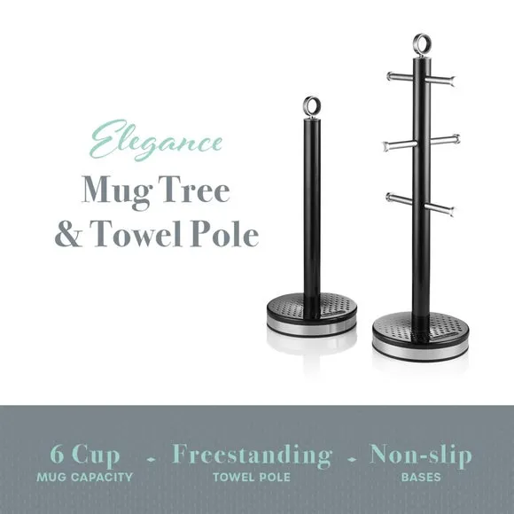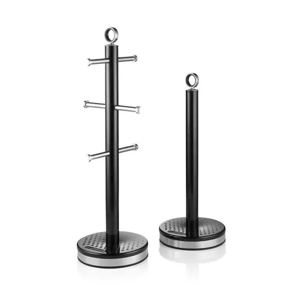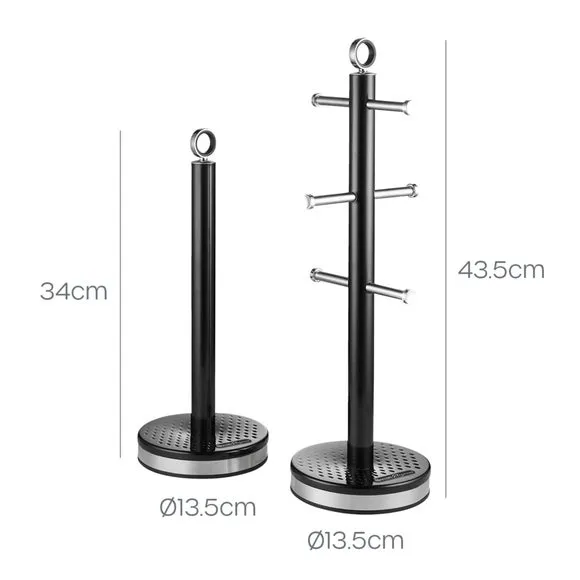 * Iron mug tree* Fits 6 cups* Matching kitchen roll holder* Wipe clean This matching set includes a six-cup mug tree and a towel pole, designed to add style and functionality to any kitchen. Chrome accents enhance the sleek finish, while the durable iron construction ensures lasting use. The towel pole accommodates standard-size kitchen rolls, and both pieces feature a solid base for stability.