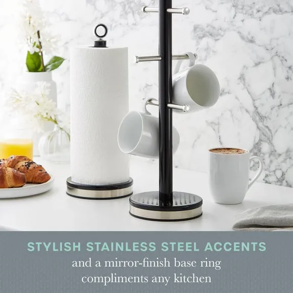 The mug tree and towel pole set combines functionality with its 6-cup capacity and matching design. Chrome accents enhance the sleek finish, while the durable iron construction ensures lasting use. The towel pole accommodates standard kitchen rolls, and both pieces feature a solid base for stability.