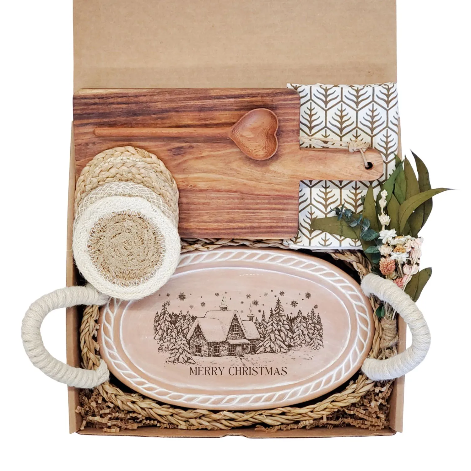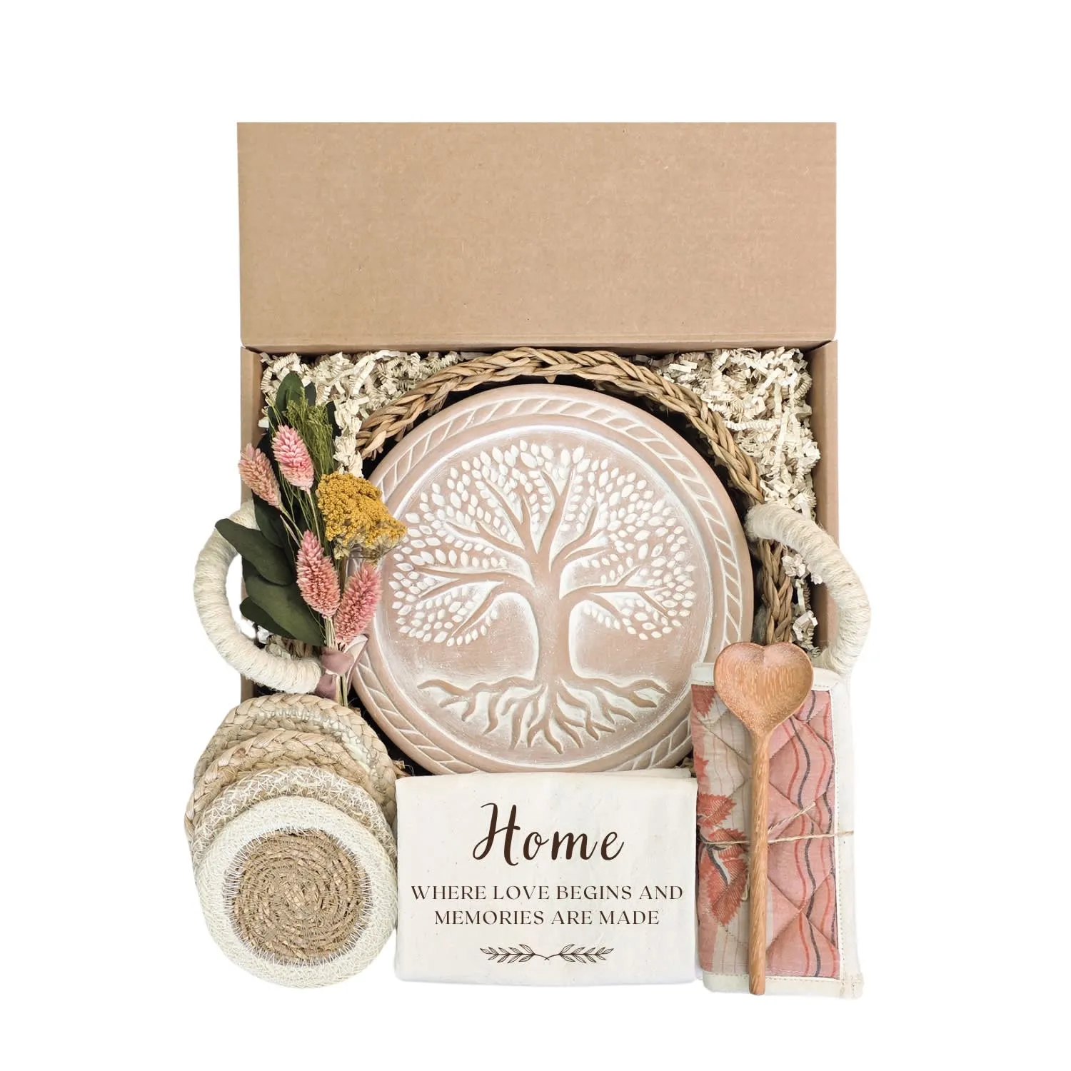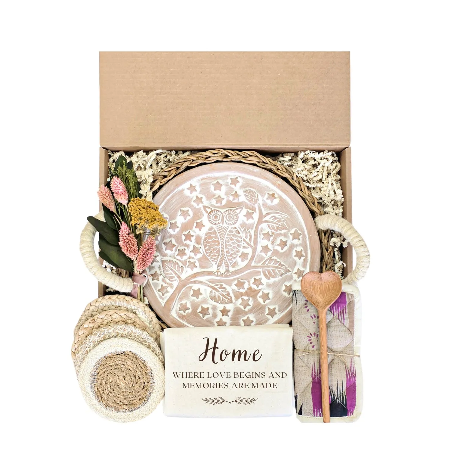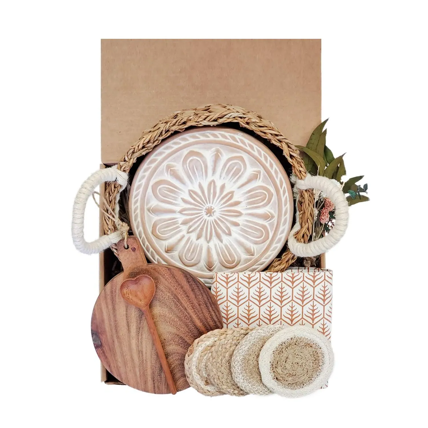 Celebrate love and special moments with our handpicked Gift Box. This beautifully curated gift basket is the perfect choice for birthdays, weddings, anniversaries, housewarmings, or any occasion that calls for heartfelt congratulations. Each gift is carefully chosen with sustainability in mind, making it a unique and special selection just for you. Please note that certain items are handmade, which means there might be slight variations in sizes, colors, or packaging. If you have any specific requests or questions, feel free to reach out. I am here to assist you and would love to hear from you! Material: * (Bread Warmer & Basket) Terra Cotta, Seagrass and Jute wool * (Wood Board & Spoon) Natural wood * (Pot Holder) Recycled Saree Fabric. Each piece is unique, with assorted colors sent at random. * (Tea Towel) Natural cotton * (Coasters) Jute and Seagrass Color: Natural, Natural white cotton with brown print, Assorted Due to the handcrafted nature, slight variation will occur in design, color, and size.