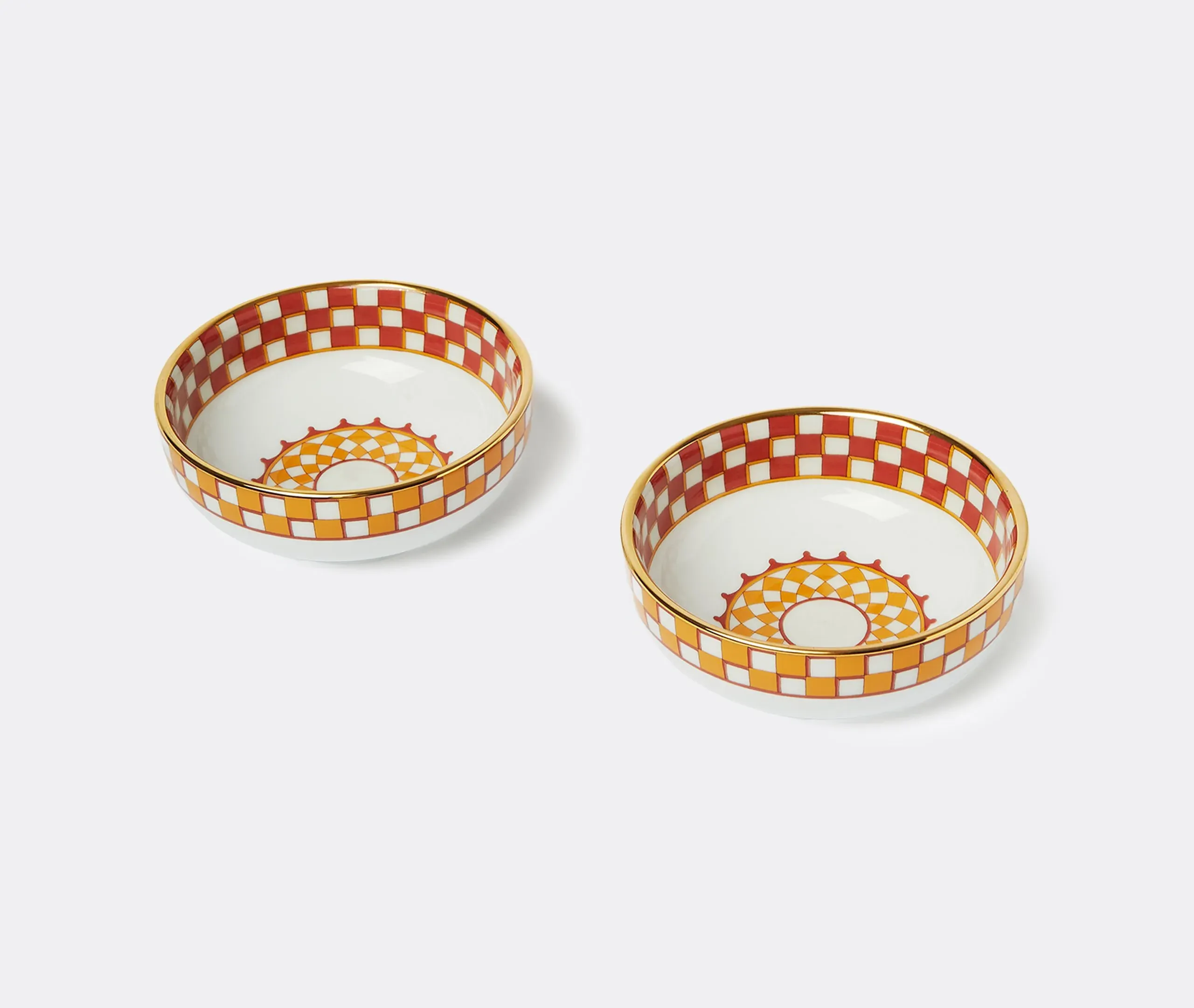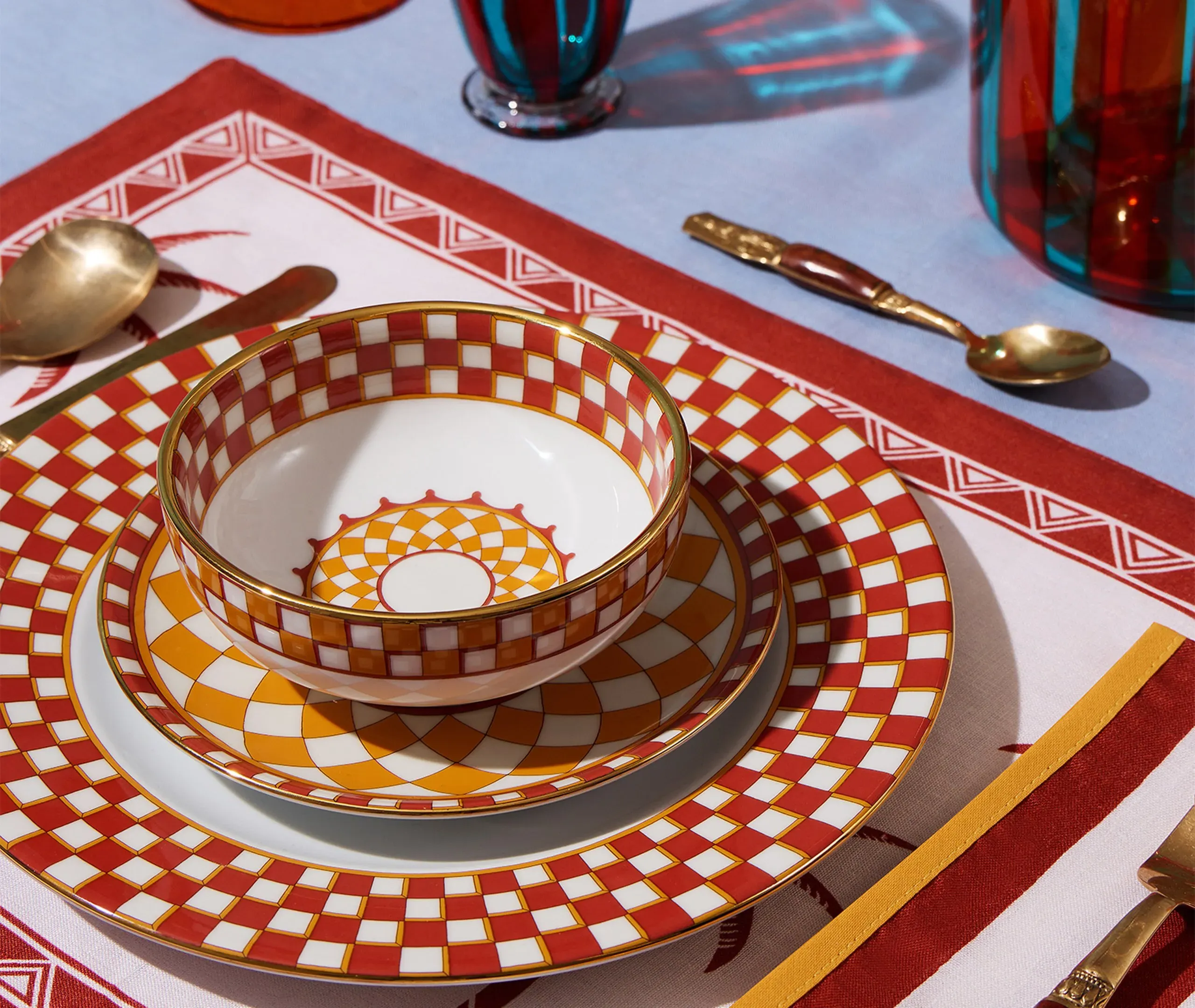 The ancient symbol of the sun shines through a series of resplendent tableware designs by La DoubleJ. Uplifting and versatile, designs draw the power and spirit of the sun to tables all year. Shades of burning red, saffron and gold glean throughout the collection in solar wheels and geometric flame motifs. The 'Apollo' side plate — named after the Greek god of Sun and Light — is crafted by historic artisans in Verona from the finest porcelain, and is encircled with an 18K gold trim. This stunning multicolor plate, with its fiery concentric borders, comes as a set of two, and can be introduced into simple, white tableware as a statement, or blended with other pieces from the 'Apollo' collection.