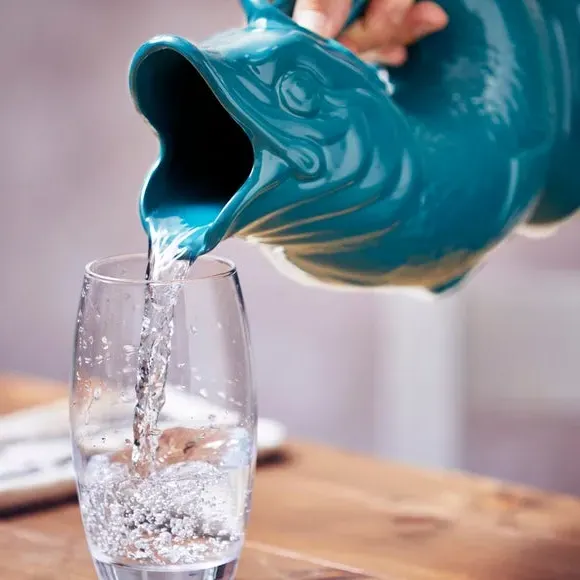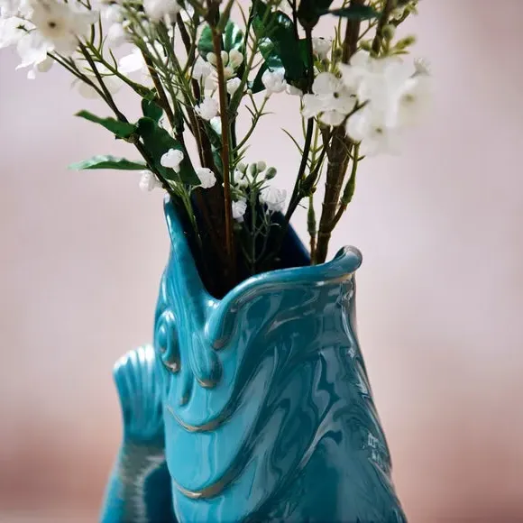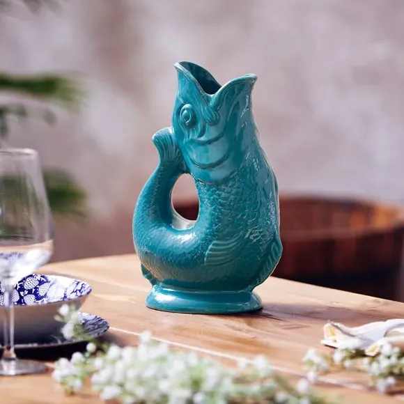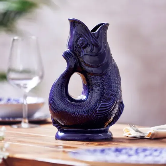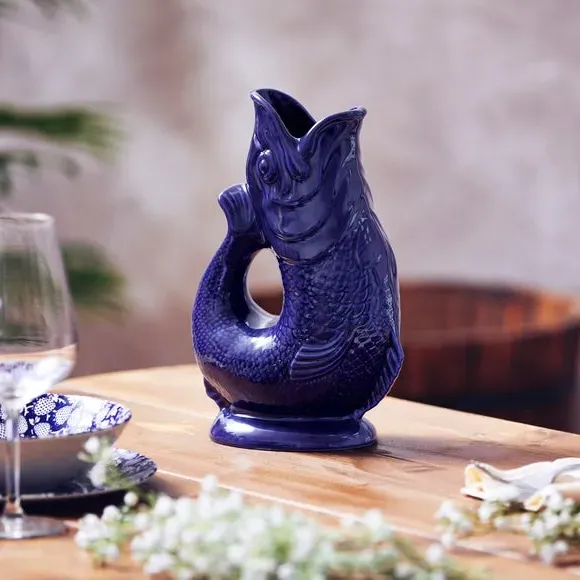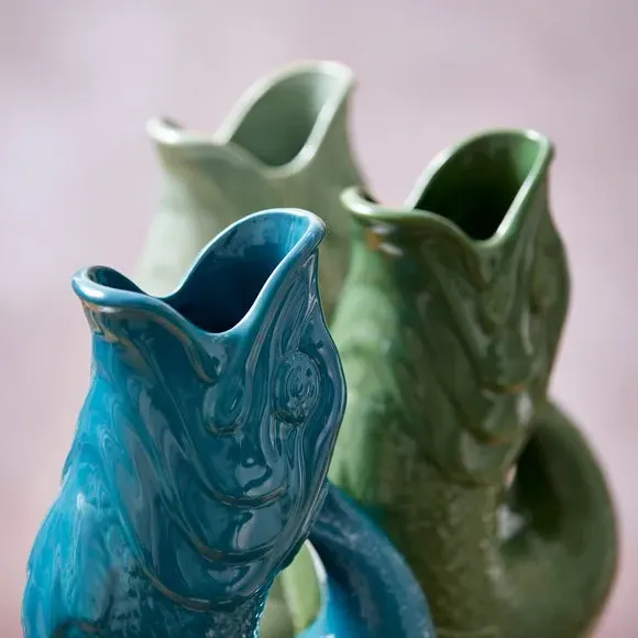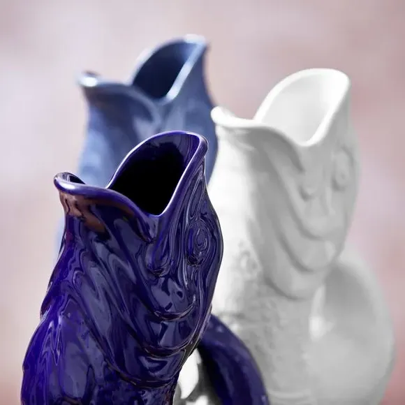 The Fish Jug combines traditional pottery craftsmanship with versatile functionality, serving as a jug, vase, decanter or utensil holder. Its high-quality ceramic construction features a glossy glaze finish that enhances durability while adding visual appeal. The distinctive fish design creates an iconic glugging sound when pouring, adding charm to daily use. Available in 0.6 or 1.2 litre capacity options to suit different needs.